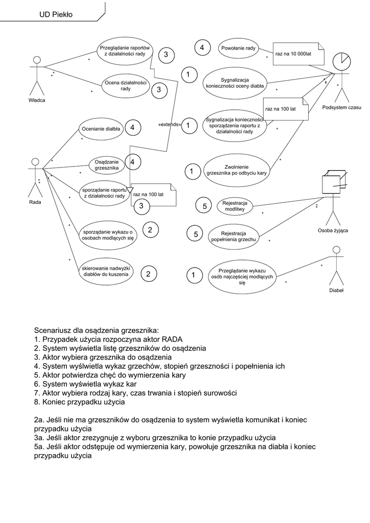 UD Piekło 4 Przeglądanie raportów z działalności rady Powołanie rady 3 1 * * * Ocena działalności rady raz na 10 000lat * * Sygnalizacja konieczności oceny diabła 3 * ** * * Władca Podsystem czasu raz na 100 lat Ocenianie diałbła «extends» 4 Sygnalizacja konieczności sporządzenia raportu z działalności rady 1 * * * * * Rada Osądzanie grzesznika * 4 1 * ** * sporządanie raportu z działalności rady Zwolnienie grzesznika po odbyciu kary raz na 100 lat 3 5 Rejestracja modlitwy ** * * sporządanie wykazu o osobach modlących się 2 5 Rejestracja popełnienia grzechu Osoba żyjąca * * skierowanie nadwyżki diabłów do kuszenia 2 1 Przeglądanie wykazu osób najczęściej modlących się * * Diabeł Scenariusz dla osądzenia grzesznika: 1. Przypadek użycia rozpoczyna aktor RADA 2. System wyświetla listę grzeszników do osądzenia 3. Aktor wybiera grzesznika do osądzenia 4. System wyślwietla wykaz grzechów, stopień grzeszności i popełnienia ich 5. Aktor potwierdza chęć do wymierzenia kary 6. System wyświetla wykaz kar 7. Aktor wybiera rodzaj kary, czas trwania i stopień surowości 8. Koniec przypadku użycia 2a. Jeśli nie ma grzeszników do osądzenia to system wyświetla komunikat i koniec przypadku użycia 3a. Jeśli aktor zrezygnuje z wyboru grzesznika to konie przypadku użycia 5a. Jeśli aktor odstępuje od wymierzenia kary, powołuje grzesznika na diabła i koniec przypadku użycia