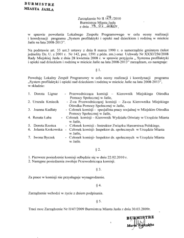 BURMISTRZ MIASTA JASŁA Zarządzenie Nr II / ~~ ./201 O Burmistrza Miasta Jasła z dnia .. ~.~.,.9.~ ... ~Q:r. w sprawie powołania Lokalnego Zespołu Programowego w celu oceny realizacji i koordynacji programu "System profilaktyki i opieki nad dzieckiem i rodziną w mieście Jaśle na lata 2008-2013". Na podstawie art. 33 ust.3 ustawy z dnia 8 marca 1990 r. o samorządzie gminnym (tekst jednolity Dz. U. z 2001 r. Nr 142, poz. 1591 z późno zm.) oraz Uchwały Nr XXXI/256/2008 Rady Miejskiej Jasła z dnia 28 kwietnia 2008 r. w sprawie przyjęcia" Systemu profilaktyki i opieki nad dzieckiem i rodziną w mieście Jaśle na lata 2008-2013" zarządzam, co następuje: §1. Powołuję Lokalny Zespół Programowy w celu oceny realizacji i koordynacji programu "System profilaktyki i opieki nad dzieckiem i rodziną w mieście Jaśle na lata 2008-2013", w składzie: komisji - Kierownik Miejskiego Ośrodka Pomocy Społecznej w Jaśle, Urszula Kmiecik - Z-ca Przewodniczącej komisji - Za-ca Kierownika Miejskiego Ośrodka Pomocy Społecznej w Jaśle, Joanna Kudłaty - Członek komisji - specjalista pracy socjalnej w Miejskim Ośrodku Pomocy Społecznej w Jaśle, Renata Łaba Członek komisji - Kierownik Wydziału Oświaty w Urzędzie Miasta w Jaśle, Dorota Rzońca - Członek komisji - Instruktor Związku Harcerstwa Polskiego, Jolanta Krokowska - Członek komisji- Inspektor ds. społecznych w Urzędzie Miasta w Jaśle, Iwona Byczek - Członek komisji- Inspektor ds. społecznych w Urzędzie Miasta w Jaśle. 1. Dorota Lignar 2. 3. 4. 5. 6. 7. - Przewodnicząca § 2. 1. Pierwsze posiedzenie komisj i odbędzie się w dniu 22.02.2010 r. 2. Następne posiedzenia zwołuje Przewodnicząca komisji. § 3. Za prace w komisji nie przysługuje wynagrodzenie. § 4. Zarządzenie wchodzi w życie z dniem podpisania. § 5. Traci moc Zarządzenie Nr ll/47/2009 Burmistrza Miasta Jasła z dnia 30.03.2009r. BV,~~~TRZ Ma~iJX~a j