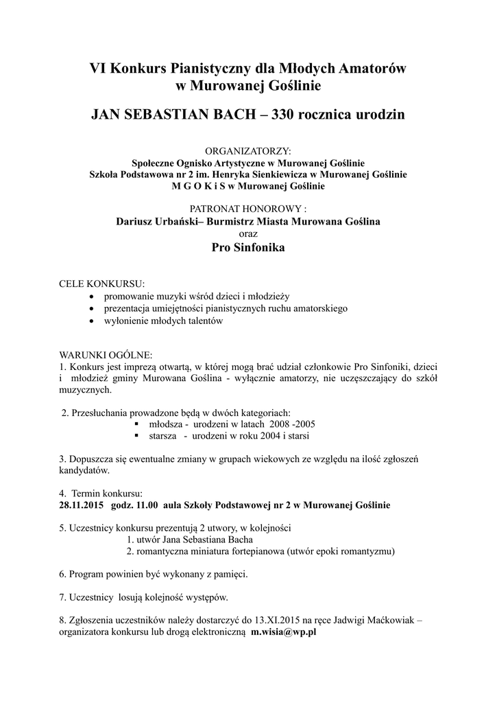 VI Konkurs Pianistyczny dla Młodych Amatorów w Murowanej Goślinie JAN SEBASTIAN BACH – 330 rocznica urodzin ORGANIZATORZY: Społeczne Ognisko Artystyczne w Murowanej Goślinie Szkoła Podstawowa nr 2 im. Henryka Sienkiewicza w Murowanej Goślinie M G O K i S w Murowanej Goślinie PATRONAT HONOROWY : Dariusz Urbański– Burmistrz Miasta Murowana Goślina oraz Pro Sinfonika CELE KONKURSU: promowanie muzyki wśród dzieci i młodzieży prezentacja umiejętności pianistycznych ruchu amatorskiego wyłonienie młodych talentów WARUNKI OGÓLNE: 1. Konkurs jest imprezą otwartą, w której mogą brać udział członkowie Pro Sinfoniki, dzieci i młodzież gminy Murowana Goślina - wyłącznie amatorzy, nie uczęszczający do szkół muzycznych. 2. Przesłuchania prowadzone będą w dwóch kategoriach: młodsza - urodzeni w latach 2008 -2005 starsza - urodzeni w roku 2004 i starsi 3. Dopuszcza się ewentualne zmiany w grupach wiekowych ze względu na ilość zgłoszeń kandydatów. 4. Termin konkursu: 28.11.2015 godz. 11.00 aula Szkoły Podstawowej nr 2 w Murowanej Goślinie 5. Uczestnicy konkursu prezentują 2 utwory, w kolejności 1. utwór Jana Sebastiana Bacha 2. romantyczna miniatura fortepianowa (utwór epoki romantyzmu) 6. Program powinien być wykonany z pamięci. 7. Uczestnicy losują kolejność występów. 8. Zgłoszenia uczestników należy dostarczyć do 13.XI.2015 na ręce Jadwigi Maćkowiak – organizatora konkursu lub drogą elektroniczną [email protected] 9. Przesłuchania uczestników odbywać się będą z udziałem publiczności. 10. Jury oceniać będzie umiejętności wykonawcze zwracając uwagę na stopień trudności utworów, czas nauczania i ogólne wrażenia artystyczne. 11. Przewiduje się nagrody dla laureatów i dyplomy uczestnictwa dla wszystkich uczestników. 12. O sposobie podziału nagród decyduje Jury. 13 Decyzje Jury są ostateczne i niepodważalne. ADRES PLACÓWKI ORGANIZACYJNEJ Szkoła Podstawowa nr 2 ul. gen. T. Kutrzeby 3 62-020 Murowana Goślina [email protected]