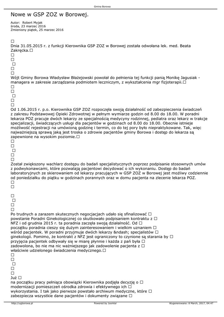 Gmina Borowa Nowe w GSP ZOZ w Borowej. Autor: Robert Myjak środa, 23 marzec 2016 Zmieniony piątek, 25 marzec 2016 Dnia 31.05.2015 r. z funkcji Kierownika GSP ZOZ w Borowej została odwołana lek. med. Beata Zakręcka. Wójt Gminy Borowa Władysław Błażejowski powołał do pełnienia tej funkcji panią Monikę Jagusiak managera w zakresie zarządzania podmiotem leczniczym, z wykształcenia mgr fizjoterapii. Od 1.06.2015 r. p.o. Kierownika GSP ZOZ rozpoczęła swoją działalność od zabezpieczenia świadczeń z zakresu Podstawowej Opieki Zdrowotnej w pełnym wymiarze godzin od 8.00 do 18.00. W poradni lekarza POZ pracuje dwóch lekarzy ze specjalnością medycyny rodzinnej, pediatra oraz lekarz w trakcje specjalizacji, świadczących usługi dla pacjentów w godzinach od 8.00 do 18.00. Obecnie istnieje możliwość rejestracji na umówioną godzinę i termin, co do tej pory było niepraktykowane. Tak, więc najważniejszą sprawą jaką jest troska o zdrowie pacjentów gminy Borowa i dostęp do lekarza są zapewnione na wysokim poziomie. Został zwiększony wachlarz dostępu do badań specjalistycznych poprzez podpisanie stosownych umów z podwykonawcami, które pozwalają pacjentowi decydować o ich wykonaniu. Dostęp do badań laboratoryjnych ze skierowaniem od lekarzy pracujących w GSP ZOZ w Borowej jest możliwy codziennie od poniedziałku do piątku w godzinach porannych oraz w domu pacjenta na zlecenie lekarza POZ. Po trudnych a zarazem skutecznych negocjacjach udało się sfinalizować powstanie Poradni Ginekologicznej co skutkowało podpisaniem kontraktu z NFZ i od grudnia 2015 r. ta poradnia zaczęła swoją działalność. Od początku poradnia cieszy się dużym zainteresowaniem i wielkim uznaniem wśród pacjentek. W poradni przyjmuje dwóch lekarzy – specjalistów ginekologii. Pomimo, że kontrakt z NFZ jest ograniczony to czynione są starania by przyjęcia pacjentek odbywały się w miarę płynnie i każda z pań była zadowolona, bo nie ma nic ważniejszego jak zadowolenie pacjenta z właściwie udzielonego świadczenia medycznego. Już na początku pracy pełniąca obowiązki Kierownika podjęła decyzję o modernizacji pomieszczeń ośrodka zdrowia i efektywnego ich wykorzystania. I tak jako pierwsze powstało archiwum medyczne, które zabezpiecza wszystkie dane pacjentów i dokumenty związane http://ugborowa.pl Powered by Joomla! Wygenerowano: 8 March, 2017, 04:47 Gmina Borowa z funkcjonowaniem tego zakładu. Zostało również wyodrębnione pomieszczenie teleinformatyczne. Ochrona danych pacjentów to sprawa priorytetowa w każdym zakładzie. W trosce o dobro pacjenta, Wójt Gminy Borowa, reprezentujący podmiot tworzący, sfinansował inwestycję budowy profesjonalnej sieci teleinformatycznej, która na obecną chwilę w pełni chroni dane osobowe naszych pacjentów. Do tej pory udało się przeprowadzić gruntowne remonty gabinetów lekarskich lekarzy POZ mieszczące się na piętrze w budynku oraz pomieszczenia poradni ginekologicznej na parterze budynku. W sposób szczególny zmiana dotyczyła rejestracji, która do tej pory nie spełniała odpowiednich standardów. Na tę okoliczność zostały zakupione nowe szafy kartotekowe i zostało wyodrębnione osobne pomieszczenie, które zapewnia pełną ochronę danych osobowych, jakimi jest dokumentacja pacjenta. Zakład pracuje bez zakłóceń, wszystko działa poprawnie i bez zarzutów. Dewizą zarządzającej GSP ZOZ im. Prof. Klemesa Skóry jest w szczególności dobro i zadowolenie pacjenta oraz szacunek do ludzi i do swojego personelu. Kierując się wzajemnym zaufaniem uważa, że siła drzemie w zespole i dzięki temu była możliwość realizacji pozytywnych zmian dla pacjenta w tak krótkim czasie. http://ugborowa.pl Powered by Joomla! Wygenerowano: 8 March, 2017, 04:47