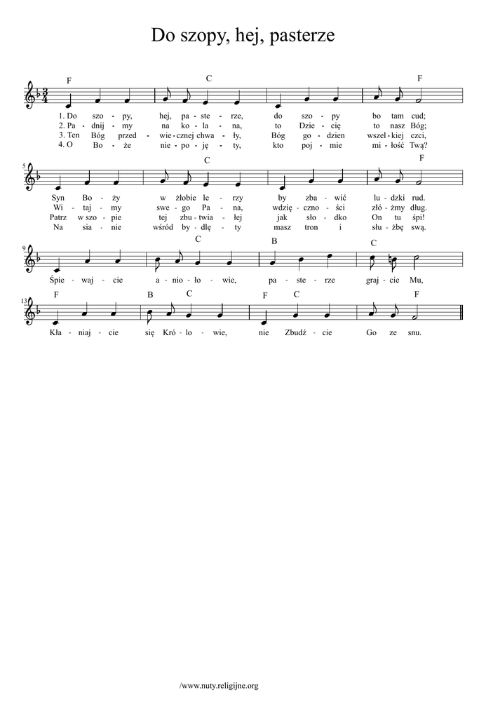 Do szopy, hej, pasterze C 43 F 1. Do 2. Pa 3. Ten 4. O 5 szo dnij Bóg Bo py, my przed że hej, pa ste na ko la wie cznej chwa nie po ję rze, na, ły, ty, do to Bóg kto Bo taj w szo sia ży my pie nie w żłobie le swe go Pa tej zbu twia wśród by dlę rzy na, łej ty by wdzię jak masz C Śpie 13 py cię dzien mie C Syn Wi Patrz Na 9 szo Dzie go poj waj cie F Kła niaj cie a nio ło B C się Kró lo zba czno sło tron wić ści dko i B wie, wie, /www.nuty.religijne.org pa ste F C nie Zbudź rze cie F bo to wszel mi tam nasz kiej łość cud; Bóg; czci, Twą? F lu dzki rud. złó żmy dług. On tu śpi! słu żbę swą. C graj cie Mu, F Go ze snu.