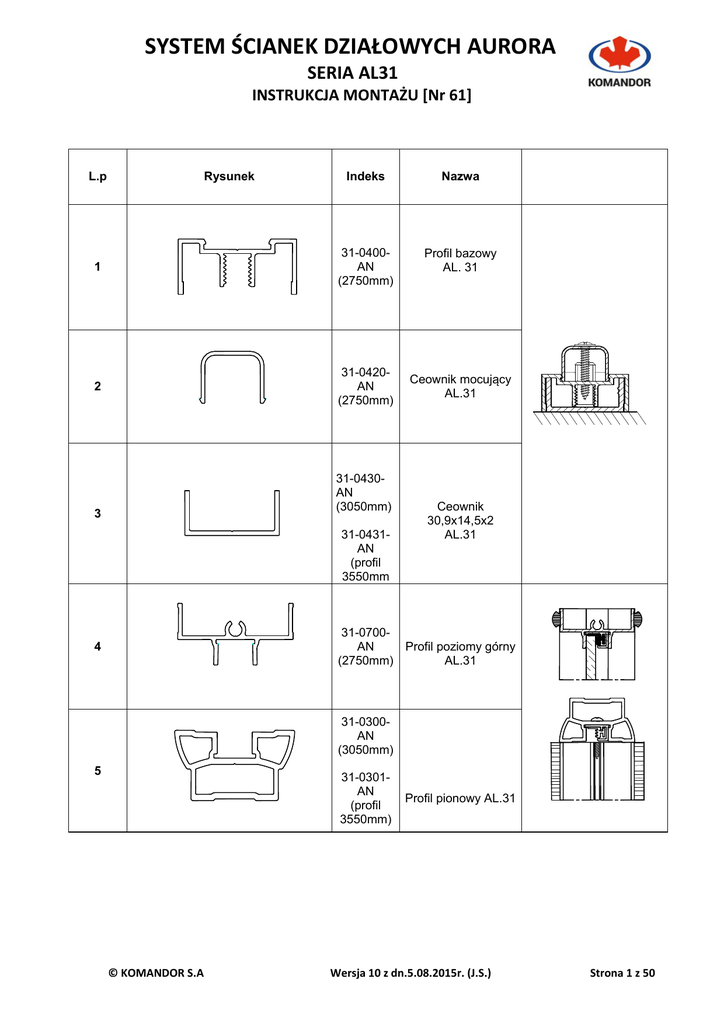 SYSTEM ŚCIANEK DZIAŁOWYCH AURORA SERIA AL31 INSTRUKCJA MONTAŻU [Nr 61] L.p Indeks Nazwa 1 31-0400AN (2750mm) Profil bazowy AL. 31 2 31-0420AN (2750mm) 3 Rysunek 31-0430AN (3050mm) 31-0431AN (profil 3550mm 4 Ceownik mocujący AL.31 Ceownik 30,9x14,5x2 AL.31 31-0700AN Profil poziomy górny (2750mm) AL.31 31-0300AN (3050mm) 5 31-0301AN (profil 3550mm) Profil pionowy AL.31 © KOMANDOR S.A Wersja 10 z dn.5.08.2015r. (J.S.) Strona 1 z 50 SYSTEM ŚCIANEK DZIAŁOWYCH AURORA SERIA AL31 INSTRUKCJA MONTAŻU [Nr 61] 31-0380AN (3050mm) 6 31-0381AN (profil 3550mm) 31-0390AN (3050mm) 7 Spinka boczna prawa AL.31 Spinka boczna lewa AL. 31 31-0391AN (profil 3550mm) 31-0370AN (3050mm) 8 Profil pionowy łączący AL.31 31-0371AN (profil 3550mm) 31-0310AN (3050mm) 11 31-0311AN (profil 3550mm) 31-0340AN (3050mm) 12 31-0341AN (profil 3550mm) 31-8060AN (3050mm) 13 31-8061AN (profil 3550mm) Profil pionowy zakończeniowy AL.31 Ceownik 24,7x11x2 AL.31 Rura kwadratowa 75x75x3 AL.31 © KOMANDOR S.A Wersja 10 z dn.5.08.2015r. (J.S.) Strona 2 z 50 SYSTEM ŚCIANEK DZIAŁOWYCH AURORA SERIA AL31 INSTRUKCJA MONTAŻU [Nr 61] 31-8050AN (3050mm) 14 31-8051AN (profil 3550mm) Rura kwadratowa 35x35x3 AL.31 31-8040AN (3050mm) 15 31-8041AN (profil 3550mm) 16 59-0735 31-0320AN (3050mm) 17 31-0321AN (profil 3550mm) Rura fi35x3 AL.31 Wkręt do blach z łbem walcowym 6,3x22 (PN:M83116A) (Do ościeżnicy) Ościeżnica AL. 31 31-0350AN (3050mm) 18 31-0351AN (profil 3550mm) 31-0360AN (3050mm) 19 31-0361AN (profil 3550mm) Słup prostokątny AL.31 Dekiel słupa prostokątnego AL.31 © KOMANDOR S.A Wersja 10 z dn.5.08.2015r. (J.S.) Strona 3 z 50 SYSTEM ŚCIANEK DZIAŁOWYCH AURORA SERIA AL31 INSTRUKCJA MONTAŻU [Nr 61] 20 31-5010 31-5030 Stopka mocująca rurę kwadratową 35x35 Al.31 Stopka mocująca słup prostokątny Al.31 21 22 31-5060 23 31-5020 24 25 31-5040 31-5050 Stopka mocująca rurę fi35 AL.31 Stopka mocująca ościeżnicę Al.31 Stopka mocująca rurę kwadratową 75x75 AL.31 Stopka mocująca profil łączący AL.31 © KOMANDOR S.A Wersja 10 z dn.5.08.2015r. (J.S.) Strona 4 z 50 SYSTEM ŚCIANEK DZIAŁOWYCH AURORA SERIA AL31 INSTRUKCJA MONTAŻU [Nr 61] 26 31-8010AN 27 31-8030AN Maskownica AL.31 Rura fi 25x2 AL.31 Rura fi 20,7x2,7 AL.31 28 31-8020 29 31-0740AN 30 31-5070 Uchwyt mocujący tor 31 31-5080 Uchwyt mocujący Profil mocujący górny AL.31 © KOMANDOR S.A Wersja 10 z dn.5.08.2015r. (J.S.) Strona 5 z 50 SYSTEM ŚCIANEK DZIAŁOWYCH AURORA SERIA AL31 INSTRUKCJA MONTAŻU [Nr 61] 32 31-5090 31-0440AN (3050mm) 33 Klin Profil do szyby zespolonej 31-0441AN (profil 3550mm) 34 31-5110 Zaczep zamka Al.31 35 31-5120 Kątownik montażowy 36 31-0920 Uszczelka do drzwi Al.31 37 31-0921 Uszczelka do szyby zespolonej © KOMANDOR S.A Wersja 10 z dn.5.08.2015r. (J.S.) Strona 6 z 50 SYSTEM ŚCIANEK DZIAŁOWYCH AURORA SERIA AL31 INSTRUKCJA MONTAŻU [Nr 61] 31-0330AN (3050mm) 38 31-0331AN (profil 3550mm) Profil pionowy boczny AL. 31 39 59-0736 Wkręt EURO „S” 6.3x19 (Zawias) 40 59-0737 Wkręt EURO „S” 5x30 (Zawias) 59-0738 Wkręt do blach z łbem stożkowym 3.5x19 (ceownik pionowy słup) 59-0739 Wkręt do blach z łbem z podkładką 3,5x25 (Profil poziomy mocujący) 59-0740 Wkręt do blach z łbem z podkładką 3,5x13 (Ościeżnica do słupa) 41 42 43 © KOMANDOR S.A Wersja 10 z dn.5.08.2015r. (J.S.) Strona 7 z 50 SYSTEM ŚCIANEK DZIAŁOWYCH AURORA SERIA AL31 INSTRUKCJA MONTAŻU [Nr 61] 59-0741 Wkręt dociskowy M8x20 (Profil poziomy nośny) 59-0742 Wkręt dociskowy M8x25 (Profil zakończeniowy) 46 59-0743 Wkręt do blach z łbem stożkowym 2,9x9,5 (Kostka dociskowa) 47 59-0744 Podkładka okrągła zgrubna M6 48 59-0745 Podkładka sprężysta ząbkowana zewnętrznie M6 49 31-5130 Zamek 44 45 © KOMANDOR S.A Wersja 10 z dn.5.08.2015r. (J.S.) Strona 8 z 50 SYSTEM ŚCIANEK DZIAŁOWYCH AURORA SERIA AL31 INSTRUKCJA MONTAŻU [Nr 61] 50 31-5140 Zawias 51 31-5150 Klamka 52 10-0961 Pasek buforowy 53 59-0728 Wkręt do montażu 54 25-0911 Wkładka dystansowa 55 25-0790-AN Listwa dystansowa © KOMANDOR S.A Wersja 10 z dn.5.08.2015r. (J.S.) Strona 9 z 50 SYSTEM ŚCIANEK DZIAŁOWYCH AURORA SERIA AL31 INSTRUKCJA MONTAŻU [Nr 61] 56 25-0700-AN Ramiak poziomy górny 2 57 28-0700-AN Ramiak łączący 58 25-0400-AN Ramiak poziomy dolny 59 25-0100-AN Tor górny AL25 5000mm AN 60 25-0110-AN Tor górny pojedynczy AL25 5000mm AN 61 20-0222-AN Tor dolny wciskany © KOMANDOR S.A Wersja 10 z dn.5.08.2015r. (J.S.) Strona 10 z 50 SYSTEM ŚCIANEK DZIAŁOWYCH AURORA SERIA AL31 INSTRUKCJA MONTAŻU [Nr 61] 20-0221-AN Tor dolny wpuszczany z podstawą 63 25-0210-AN Tor dolny pojedynczy AL25 5000mm AN 64 20-0140-AN Tor górny i dolny AL20 5000mm AN 65 25-0600 Prowadnik górny. Al25 66 25-0500 Wózek dolny Al25 67 25-3720-AN Listwa ozdobna szafir 62 © KOMANDOR S.A Wersja 10 z dn.5.08.2015r. (J.S.) Strona 11 z 50 SYSTEM ŚCIANEK DZIAŁOWYCH AURORA SERIA AL31 INSTRUKCJA MONTAŻU [Nr 61] 68 31-1300-AN (3050mm) Profil drzwi 31-1320-AN (3050mm) Ościeżnica drzwi 69 31-1321-AN (profil 3550mm) 70 31-5131 Zamek 2 71 31-5141 Zawias skrzydełkowy lewy 72 31-5142 Zawias skrzydełkowy prawy 73 31-5160 Wkładka zamka © KOMANDOR S.A Wersja 10 z dn.5.08.2015r. (J.S.) Strona 12 z 50 SYSTEM ŚCIANEK DZIAŁOWYCH AURORA SERIA AL31 INSTRUKCJA MONTAŻU [Nr 61] 74 31-5112 75 31-0927-PR 76 59-0749 Wkręt z łbem walcowym 6,3x35 59-0750 Wkręt samoformujący z łbem stożkowym M4x8 78 59-0751 Wkręt samoformujący z łbem stożkowym M5x10 79 59-0729 Wkręt samowiercący 3,5x13 77 Adapter zamka Uszczelka Al. 31 6 mm przezroczysta © KOMANDOR S.A Wersja 10 z dn.5.08.2015r. (J.S.) Strona 13 z 50 SYSTEM ŚCIANEK DZIAŁOWYCH AURORA SERIA AL31 INSTRUKCJA MONTAŻU [Nr 61] 80 59-0721 Wkręt montażowy 3,5x25 81 27-1700 Ramiak poziomy górny II 31-0946 Łącznik uchwytu rurowego AURORA 82 Wp- wysokość panelu Sp- szerokość panelu Informacje ogólne System ścianek działowych jest to system, który umożliwia w łatwy sposób wydzielenie pomieszczeń z dowolnej przestrzeni. Dzięki zastosowaniu r