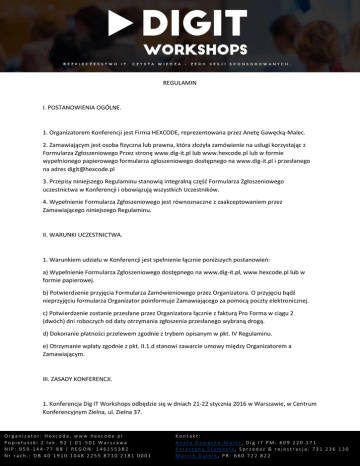 REGULAMIN I. POSTANOWIENIA OGÓLNE. 1. Organizatorem Konferencji jest Firma HEXCODE, reprezentowana przez Anetę Gawęcką-Malec. 2. Zamawiającym jest osoba fizyczna lub prawna, która złożyła zamówienie na usługi korzystając z Formularza Zgłoszeniowego Przez stronę www.dig-it.pl lub www.hexcode.pl lub w formie wypełnionego papierowego formularza zgłoszeniowego dostępnego na www.dig-it.pl i przesłanego na adres [email protected] 3. Przepisy niniejszego Regulaminu stanowią integralną część Formularza Zgłoszeniowego uczestnictwa w Konferencji i obowiązują wszystkich Uczestników. 4. Wypełnienie Formularza Zgłoszeniowego jest równoznaczne z zaakceptowaniem przez Zamawiającego niniejszego Regulaminu. II. WARUNKI UCZESTNICTWA. 1. Warunkiem udziału w Konferencji jest spełnienie łącznie poniższych postanowień: a) Wypełnienie Formularza Zgłoszeniowego dostępnego na www.dig-it.pl, www.hexcode.pl lub w formie papierowej. b) Potwierdzenie przyjęcia Formularza Zamówieniowego przez Organizatora. O przyjęciu bądź nieprzyjęciu formularza Organizator poinformuje Zamawiającego za pomocą poczty elektronicznej. c) Potwierdzenie zostanie przesłane przez Organizatora łącznie z fakturą Pro Forma w ciągu 2 (dwóch) dni roboczych od daty otrzymania zgłoszenia przesłanego wybraną drogą. d) Dokonanie płatności przelewem zgodnie z trybem opisanym w pkt. IV Regulaminu. e) Otrzymanie wpłaty zgodnie z pkt. II.1.d stanowi zawarcie umowy między Organizatorem a Zamawiającym. III. ZASADY KONFERENCJI. 1. Konferencja Dig IT Workshops odbędzie się w dniach 21-22 stycznia 2016 w Warszawie, w Centrum Konferencyjnym Zielna, ul. Zielna 37. Organizator: Hexcode, www.hexcode.pl Popiełuszki 2 lok. 92 | 01-501 Warszawa NIP: 959-144-77-88 | REGON: 146155382 Nr rach.: DB 40 1910 1048 2255 8710 2181 0001 Kontakt: Aneta Gawęcka-Malec, Dig IT PM: 609 220 171 Katarzyna Szymanik, Sprzedaż & rejestracja: 731 236 130 Marcin Dulnik, PR: 660 722 822 2. Ceny za udział w Konferencji są podane na www.dig-it.pl, stronie internetowej konferencji. Pokrywają wyłącznie usługi opisane w opisie konferencji. 3. O wysokości ceny udziału w Konferencji decyduje data otrzymania płatności przez Organizatora. 4. Termin przesłania Formularza Zgłoszeniowego na Konferencję upływa na 5 dni roboczych przed jej rozpoczęciem. Po tym terminie zgłoszenia będą przyjmowane warunkowo. 5. Prawo udziału w Konferencji przysługuje przedstawicielom Zamawiającego w liczbie wynikającej z wypełnionych Formularzy Zgłoszeniowych. Zgłoszenia muszą zawierać imienne dane uczestników. Zmiany nazwisk uczestników mogą być podane nie później niż na 5 dni roboczych przed rozpoczęciem konferencji. 6. Organizator zastrzega sobie prawo do wcześniejszego zakończenia rejestracji w przypadku wykorzystania wszystkich dostępnych miejsc przeznaczonych dla uczestników Konferencji. 7. Organizator ustala plan Konferencji oraz ma prawo dokonywania w nim zmian, nawet w dniu, w którym odbywa się Konferencja. W szczególności ma prawo do zmian rozkładu czasowego i kolejności wystąpień w obrębie danego dnia. 8. Ze względu na ograniczoną liczbę miejsc, Organizator gwarantuje indywidualny udział w poszczególnych sesjach tylko na podstawie przesłanego wcześniej formularza zgłoszeniowego. 9. Zamawiający ponosi pełną odpowiedzialność za dokonane przez siebie, lub osoby oddelegowane przez Zamawiającego do uczestnictwa w Konferencji, zniszczenia na terenie obiektów, w których odbywa się Konferencja. 10. Organizator nie ponosi odpowiedzialności za rzeczy będące własnością Zamawiającego lub osób oddelegowanych przez Zamawiającego do uczestnictwa w Konferencji, które mogą zostać zgubione, zniszczone lub skradzione podczas Konferencji. 11. Zamawiający zobowiązuje się do przestrzegania zasad bezpieczeństwa, w tym ppoż., jak również instrukcji oraz poleceń organizacyjno-technicznych przedstawiciela Organizatora. IV. WARUNKI I TERMINY PŁATNOŚCI. 1. Forma płatności obowiązująca przy realizacji zamówienia to przedpłata przelewem na podstawie faktury Pro Forma w wysokości 100% należności za uczestnictwo w konferencji wynikające z liczby zgłoszonych uczestników i daty zgłoszenia, chyba że strony ustalą inne warunki płatności. W przypadku braku płatności od Zamawiającego w terminie wyznaczonym na fakturze Pro Forma, rezerwacja miejsca na podstawie przesłanego formularza zgłoszeniowego zostaje anulowana. 2. W przypadku wypełnienia przez Zamawiającego Formularza Zgłoszeniowego w terminie krótszym niż 5 dni roboczych przed rozpoczęciem Konferencji, opłata za Konferencję powinna zostać dokonana Organizator: Hexcode, www.hexcode.pl Popiełuszki 2 lok. 92 | 01-501 Warszawa NIP: 959-144-77-88 | REGON: 146155382 Nr rach.: DB 40 1910 1048 2255 8710 2181 0001 Kontakt: Aneta Gawęcka-Malec, Dig IT PM: 609 220 171 Katarzyna Szymanik, Sprzedaż & rejestracja: 731 236 130 Marcin Dulnik, PR: 660 722 822 przed Konferencją na podstawie otrzymanej faktury Pro Forma. Warunkiem udziału w konferencji jest posiadanie potwierdzenie dokonania przelewu. 3. Po zaksięgowaniu się płatności na koncie, Organizator wystawi fakturę VAT dla Zamawiającego niezwłocznie, maksymalnie w ciągu 7 dni po wpływie na konto. 4. Faktury są wysyłane wyłącznie elektronicznie na podany podczas rejestracji adres e-mail. Organizator nie wysyła papierowych wersji faktur drogą pocztową. 5. Kwoty podane na stronie są cenami netto. Do cen należy doliczyć należny podatek VAT w wysokości 23%. 6. Ceny promocyjne dotyczą uczestników rejestrujących się do 30.11.2015, chyba że strony ustalą inaczej. Wszelkie ustalenia dotyczące cen innych niż standardowe wymagane są w formie pisemnej (elektronicznej). V. REZYGNACJA Z UDZIAŁU W KONFERENCJI. 1. Rezygnacja przez Zamawiającego z udziału Konferencji może nastąpić wyłącznie w drodze pisemnego oświadczenia, przesłanego pocz