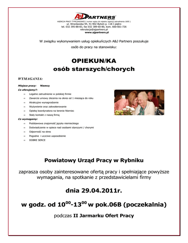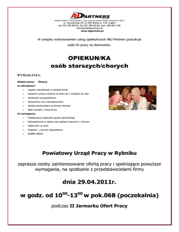 AGENCJA PRACY TYMCZASOWEJ ( numer wpisu do rejestru agencji zatrudnienia 1695 ) ul. Wrocławska 94, 41-902 Bytom p. 118 I piętro tel. 032 395-88-83, fax 032 389-60-80, kom. 660-661-726 [email protected] www.ajpartners.pl W związku wykonywaniem usług opiekuńczych A&J Partners poszukuje osób do pracy na stanowisku: OPIEKUN/KA osób starszych/chorych WYMAGANIA: Miejsce pracy: Niemcy Co oferujemy?: • Legalne zatrudnienie w polskiej firmie • Zawarcie umowy zlecenia na okres od 1 miesiąca do roku • Atrakcyjne wynagrodzenie • WyŜywienie oraz zakwaterowanie • Opiekę koordynatora na terenie Niemiec • Stały kontakt z naszą firmą Co wymagamy: • Podstawowa znajomość języka niemieckiego • Doświadczenie w opiece nad osobami starszymi / chorymi • Odporność na stres • Pogodne i uczciwe usposobienie • DOBRE SERCE Powiatowy Urząd Pracy w Rybniku zaprasza osoby zainteresowane ofertą pracy i spełniające powyŜsze wymagania, na spotkanie z przedstawicielami firmy dnia 29.04.2011r. w godz. od 1000-1300 w pok.06B (poczekalnia) podczas II Jarmarku Ofert Pracy