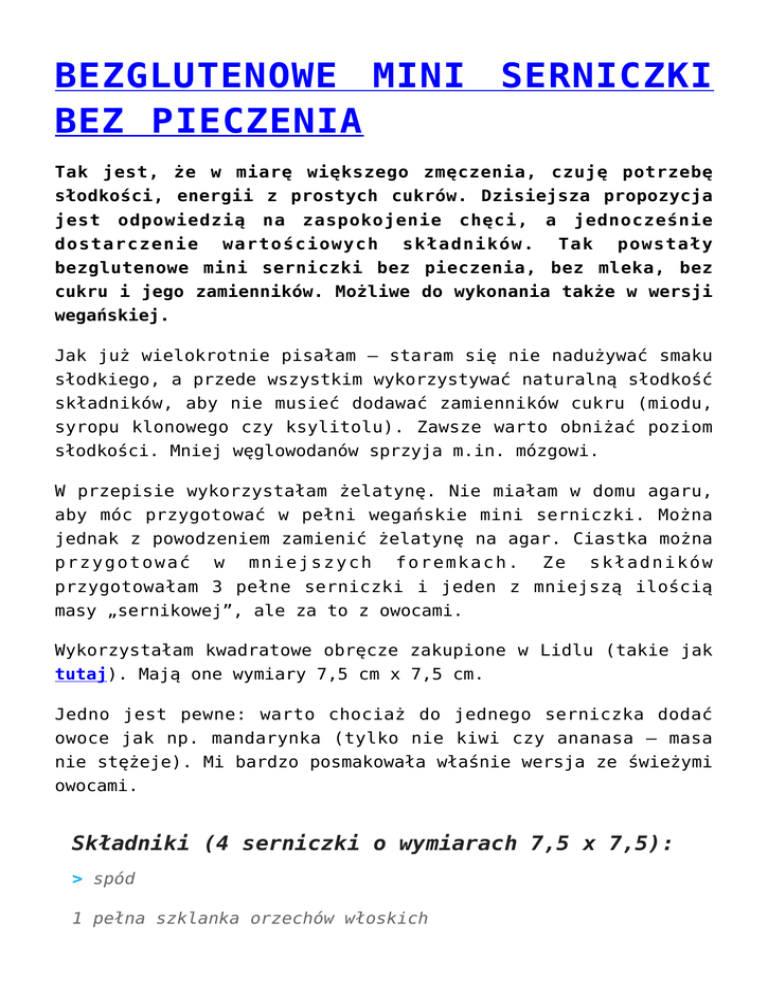BEZGLUTENOWE MINI SERNICZKI BEZ PIECZENIA Tak jest, że w miarę większego zmęczenia, czuję potrzebę słodkości, energii z prostych cukrów. Dzisiejsza propozycja jest odpowiedzią na zaspokojenie chęci, a jednocześnie dostarczenie wartościowych składników. Tak powstały bezglutenowe mini serniczki bez pieczenia, bez mleka, bez cukru i jego zamienników. Możliwe do wykonania także w wersji wegańskiej. Jak już wielokrotnie pisałam – staram się nie nadużywać smaku słodkiego, a przede wszystkim wykorzystywać naturalną słodkość składników, aby nie musieć dodawać zamienników cukru (miodu, syropu klonowego czy ksylitolu). Zawsze warto obniżać poziom słodkości. Mniej węglowodanów sprzyja m.in. mózgowi. W przepisie wykorzystałam żelatynę. Nie miałam w domu agaru, aby móc przygotować w pełni wegańskie mini serniczki. Można jednak z powodzeniem zamienić żelatynę na agar. Ciastka można przygotować w mniejszych foremkach. Ze składników przygotowałam 3 pełne serniczki i jeden z mniejszą ilością masy „sernikowej”, ale za to z owocami. Wykorzystałam kwadratowe obręcze zakupione w Lidlu (takie jak tutaj). Mają one wymiary 7,5 cm x 7,5 cm. Jedno jest pewne: warto chociaż do jednego serniczka dodać owoce jak np. mandarynka (tylko nie kiwi czy ananasa – masa nie stężeje). Mi bardzo posmakowała właśnie wersja ze świeżymi owocami. Składniki (4 serniczki o wymiarach 7,5 x 7,5): > spód 1 pełna szklanka orzechów włoskich 100 g daktyli suszonych > masa 2 duże pomarańcze gęsta część z mleka kokosowego (2-3 łyżki) 3 płaskie łyżeczki żelatyny (zamiennie agar) 3-4 łyżki wrzącej wody opcjonalnie: skórka pomarańczowa (0,5 łyżeczki) Przygotowanie Aby przygotować spód ciasta, należy namoczyć orzechy (wcześniej sparzone wrzątkiem na sitku) w letniej filtrowanej lub przegotowanej wodzie. Moczymy przez 7-8 h. Po tym czasie odcedzamy dokładnie na sitku i lekko osuszamy. Daktyle zalewamy wrzątkiem i pozostawiamy na około 10 minut, a następnie odcedzamy na sitku. Daktyle i orzechy blenderujemy na masę (nie musi być gładka, ale powinna być zwięzła). Wykładamy spód foremek orzechowodaktylowym ciastem. Ugniatamy je palcami. Wstawiamy, wypełnione ciastem, foremki do lodówki, a w czasie chłodzenia, przygotowujemy masę „sernikową”. Aby przygotować masę „sernikową”, należy zblenderować obrane pomarańcze (bez pestek) razem z gęstą częścią mleka kokosowego i skórką pomarańczową (opcjonalnie). Żelatynę (lub agar) rozpuszczamy w kilku łyżkach wrzątku, a następnie przelewamy klarowny roztwór do pomarańczowej masy. Blenderujemy całość jeszcze przez kilka sekund. Masę wlewamy do foremek wypełnionych ciastem daktylowoorzechowym. Chłodzimy ciasto przez noc lub w ciągu dnia (minimum 6 h). Jak już wspomniałam wcześniej – warto do ciasta dodać świeże owoce, jak np. mandarynki (słodkie, bez pestek). Ciasto jest lekkie, słodkie i wysokobłonnikowe, a przy tym bardzo wartościowe. Smacznego! :)