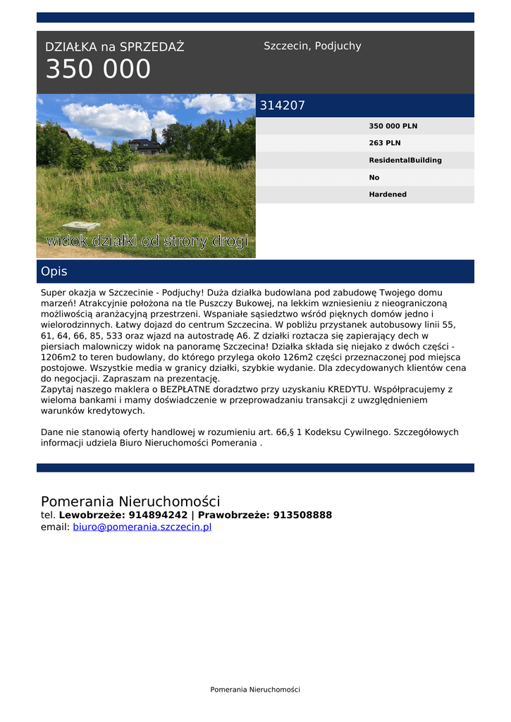 Szczecin, Podjuchy DZIAŁKA na SPRZEDAŻ 350 000 314207 350 000 PLN 263 PLN ResidentalBuilding No Hardened Opis Super okazja w Szczecinie - Podjuchy! Duża działka budowlana pod zabudowę Twojego domu marzeń! Atrakcyjnie położona na tle Puszczy Bukowej, na lekkim wzniesieniu z nieograniczoną możliwością aranżacyjną przestrzeni. Wspaniałe sąsiedztwo wśród pięknych domów jedno i wielorodzinnych. Łatwy dojazd do centrum Szczecina. W pobliżu przystanek autobusowy linii 55, 61, 64, 66, 85, 533 oraz wjazd na autostradę A6. Z działki roztacza się zapierający dech w piersiach malowniczy widok na panoramę Szczecina! Działka składa się niejako z dwóch części 1206m2 to teren budowlany, do którego przylega około 126m2 części przeznaczonej pod miejsca postojowe. Wszystkie media w granicy działki, szybkie wydanie. Dla zdecydowanych klientów cena do negocjacji. Zapraszam na prezentację. Zapytaj naszego maklera o BEZPŁATNE doradztwo przy uzyskaniu KREDYTU. Współpracujemy z wieloma bankami i mamy doświadczenie w przeprowadzaniu transakcji z uwzględnieniem warunków kredytowych. Dane nie stanowią oferty handlowej w rozumieniu art. 66,§ 1 Kodeksu Cywilnego. Szczegółowych informacji udziela Biuro Nieruchomości Pomerania . Pomerania Nieruchomości tel. Lewobrzeże: 914894242 | Prawobrzeże: 913508888 email: [email protected] Pomerania Nieruchomości Powered by TCPDF (www.tcpdf.org)