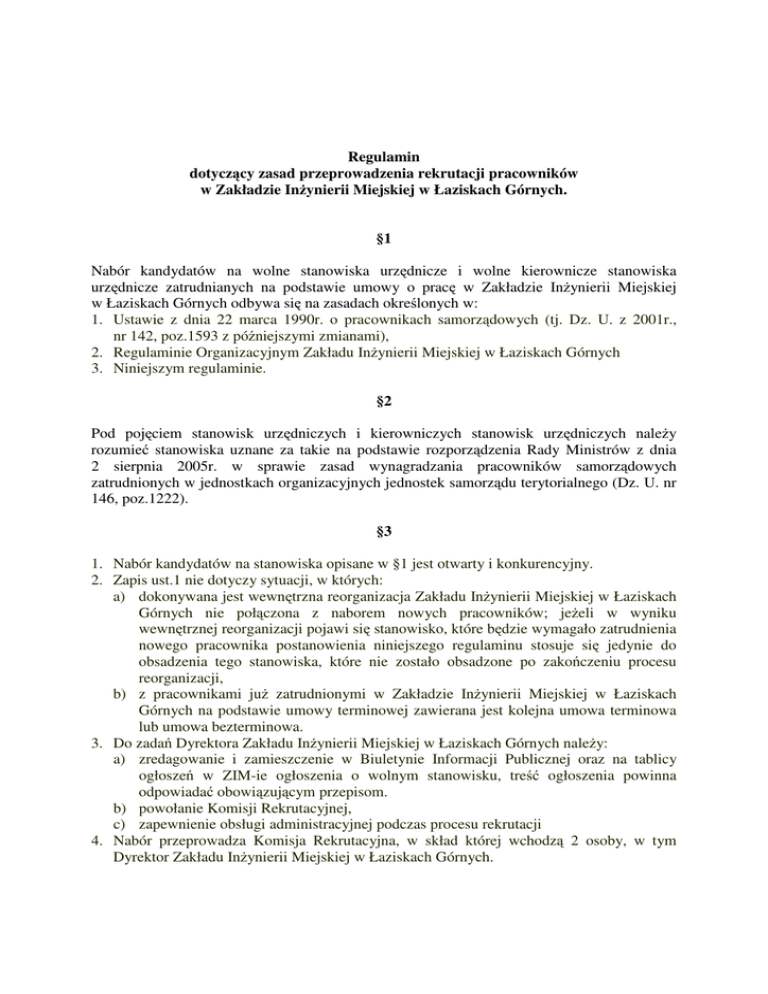 Regulamin dotycz cy zasad przeprowadzenia rekrutacji pracowników w Zakładzie In ynierii Miejskiej w Łaziskach Górnych. §1 Nabór kandydatów na wolne stanowiska urz dnicze i wolne kierownicze stanowiska urz dnicze zatrudnianych na podstawie umowy o prac w Zakładzie In ynierii Miejskiej w Łaziskach Górnych odbywa si na zasadach okre lonych w: 1. Ustawie z dnia 22 marca 1990r. o pracownikach samorz dowych (tj. Dz. U. z 2001r., nr 142, poz.1593 z pó niejszymi zmianami), 2. Regulaminie Organizacyjnym Zakładu In ynierii Miejskiej w Łaziskach Górnych 3. Niniejszym regulaminie. §2 Pod poj ciem stanowisk urz dniczych i kierowniczych stanowisk urz dniczych nale y rozumie stanowiska uznane za takie na podstawie rozporz dzenia Rady Ministrów z dnia 2 sierpnia 2005r. w sprawie zasad wynagradzania pracowników samorz dowych zatrudnionych w jednostkach organizacyjnych jednostek samorz du terytorialnego (Dz. U. nr 146, poz.1222). §3 1. Nabór kandydatów na stanowiska opisane w §1 jest otwarty i konkurencyjny. 2. Zapis ust.1 nie dotyczy sytuacji, w których: a) dokonywana jest wewn trzna reorganizacja Zakładu In ynierii Miejskiej w Łaziskach Górnych nie poł czona z naborem nowych pracowników; je eli w wyniku wewn trznej reorganizacji pojawi si stanowisko, które b dzie wymagało zatrudnienia nowego pracownika postanowienia niniejszego regulaminu stosuje si jedynie do obsadzenia tego stanowiska, które nie zostało obsadzone po zako czeniu procesu reorganizacji, b) z pracownikami ju zatrudnionymi w Zakładzie In ynierii Miejskiej w Łaziskach Górnych na podstawie umowy terminowej zawierana jest kolejna umowa terminowa lub umowa bezterminowa. 3. Do zada Dyrektora Zakładu In ynierii Miejskiej w Łaziskach Górnych nale y: a) zredagowanie i zamieszczenie w Biuletynie Informacji Publicznej oraz na tablicy ogłosze w ZIM-ie ogłoszenia o wolnym stanowisku, tre ogłoszenia powinna odpowiada obowi zuj cym przepisom. b) powołanie Komisji Rekrutacyjnej, c) zapewnienie obsługi administracyjnej podczas procesu rekrutacji 4. Nabór przeprowadza Komisja Rekrutacyjna, w skład której wchodz 2 osoby, w tym Dyrektor Zakładu In ynierii Miejskiej w Łaziskach Górnych. §4 1. Post powanie maj ce na celu wyłonienie kandydata na stanowisko opisane w §1 jest dwuetapowe. 2. W pierwszym etapie Komisja Rekrutacyjna dokonuje oceny czy zło one zgłoszenia odpowiadaj warunkom formalnym opisanym w ogłoszeniu o naborze. Zgłoszenia nieodpowiadaj ce tym warunkom podlegaj odrzuceniu. O odrzuceniu zgłoszenia informuje si wył cznie tych kandydatów, których zgłoszenia zostały odrzucone. 3. List kandydatów, którzy spełniaj wymagania okre lone w ogłoszeniu o naborze upowszechnia si w Biuletynie Informacji Publicznej. 4. Lista zawiera imiona i nazwiska oraz miejsce zamieszkania kandydatów. 5. Podczas drugiego etapu, do którego dopuszcza si wszystkich kandydatów, których zgłoszenia spełniaj warunki opisane w ogłoszeniu o naborze przeprowadzana jest rozmowa kwalifikacyjna. O terminie rozmowy kwalifikacyjnej nale y powiadomi kandydatów co najmniej 3 dni przed jej terminem telefonicznie lub za po rednictwem poczty. §5 1. Komisja Rekrutacyjna przed rozmow kwalifikacyjn ustala kryteria oceny kandydata. 2. Kryteria nale y ocenia oddzielnie na podstawie przedstawionej dokumentacji oraz udzielonych przez kandydatów odpowiedzi na zadane pytania. 3. Ka demu kandydatowi zadawane s te same lub podobne (w ramach danego zakresu tematycznego) pytania. 4. Ocena kandydatów ubiegaj cych si o przyj cie do pracy prowadzona jest metod punktow po zako czonych rozmowach kwalifikacyjnych. Skala obejmuje 5 stopni od 0 4 pkt: 4 pkt – w pełni odpowiada oczekiwaniom; 3 pkt – spełnia oczekiwania w stopniu dobrym; 2 pkt – spełnia oczekiwania w stopniu zadawalaj cym; 1 pkt – spełnia oczekiwania tylko cz ciowo; 0 pkt – nie odpowiada oczekiwaniom. 5. Indywidualne wyniki oceny kandydatów sporz dza si na formularzu „Karta oceny kandydata” stanowi cym zał cznik nr 5. 6. Komisja Rekrutacyjna wybiera tego spo ród kandydatów, który w rozmowie kwalifikacyjnej uzyskał najwi ksz ilo punktów. 7. Je eli dwóch lub wi cej kandydatów otrzymało tak sam , najwi ksz ilo punktów, przeprowadza si dodatkow rozmow kwalifikacyjn z uwzgl dnieniem zasad opisanych w ust.1 – 6. W dodatkowej rozmowie kwalifikacyjnej udział bior wszyscy kandydaci, którzy otrzymali jednakow , najwy sz , ilo punktów. 8. Komisja rekrutacyjna dokonuje zbiorczego zestawienia ocen kandydata na formularzu „Protokół przeprowadzonego naboru na stanowisko” stanowi cym zał cznik nr 6. §6 Je eli z przepisów prawa wynika, e osoba zatrudniona na stanowisku, na które prowadzony jest nabór musi spełnia szczególne warunki, co do których nie dano od osób składaj cych zgłoszenia potwierdzenia ich spełnienia (np. szczegółowe badania lekarskie, psychologiczne, potwierdzenie posiadanie nieskazitelnej opinii) nawi zanie stosunku pracy nast puje dopiero po uzyskaniu potwierdzenia, e kandydat warunki te spełnia. §7 W sytuacji gdy stosunek pracy z wybranym kandydatem nie zostanie nawi zany, gdy : 1. nie wpłynie adne zgłoszenie, 2. wszystkie zgłoszenia zostan odrzucone na podstawie §4, 3. nie zostanie uzyskane potwierdzenie, o którym mowa w §6, 4. aden z kandydatów nie otrzymał co najmniej 50% maksymalnej liczby mo liwych do otrzymania punktów, 5. wybrany kandydat zrezygnował z nawi zania stosunku pracy, Komisja Rekrutacyjna, z zastrze eniem §8, powtarza post powanie rekrutacyjne, z tym e ma prawo obni y minimaln liczb punktów, o której mowa w punkcie 4. §8 Je eli stosunek pracy nie został nawi zany na skutek zaistnienia okoliczno ci opisanych w §7 pkt 3 lub lekarz dokonuj cy wst pnych bada lekarskich w trybie przepisów kodeksu pracy stwierdzi, e po stronie kandydata zachodz przyczyny uniemo liwiaj ce zatrudnienie na stanowisku, o które si ubiegał, Komisja Rekrutacyjna mo e nawi za stosunek pracy z kandydatem, który k