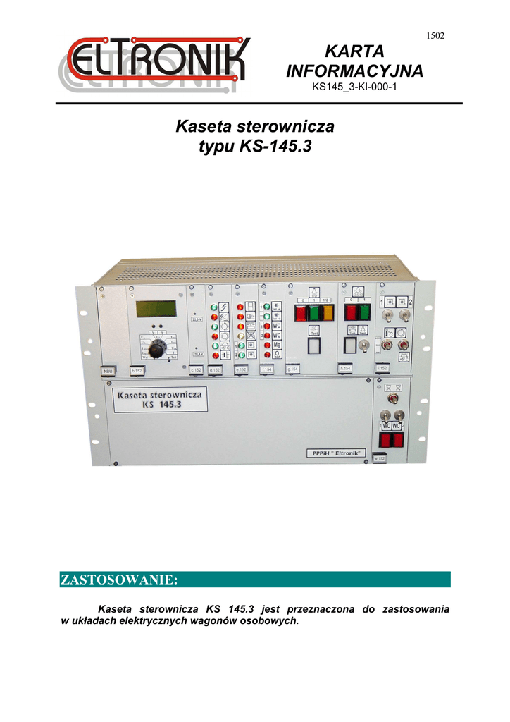 1502 KARTA INFORMACYJNA KS145_3-KI-000-1 Kaseta sterownicza typu KS-145.3 ZASTOSOWANIE: Q Kaseta sterownicza KS 145.3 jest przeznaczona do zastosowania w układach elektrycznych wagonów osobowych. 1502 OPIS: Kaseta sterownicza KS 145.3 jest umieszczona w standardowym panelu 19”/6U i wyposażona we wsuwki o wysokości 3U, zawierające układy elektroniczne i przekaźnikowe: zasilacz, wskaźnik cyfrowy napięcia i prądu z przełącznikiem zakresów, dwustopniowy przekaźnik podnapięciowy, zespoły sterownicze oraz sygnalizacyjne. Na płytkach czołowych poszczególnych podzespołów znajdują się przyciski i lampki sygnalizacyjne wraz z piktogramami, ułatwiającymi obsługę. Zadaniem kasety sterowniczej jest: − pomiar napięcia i prądu baterii akumulatorów oraz napięć fazowych, międzyfazowych i prądu fazowego przetwornicy, − kontrola napięcia 24 V przez układ DPP, − sterowanie oświetleniem w wagonie, − sterowanie oświetleniem pociągu, − kontrola żarówek oświetlenia awaryjnego, − sterowanie układami pomocniczymi: hamulcem oraz zdalnym zamykaniem drzwi, − sygnalizacja awarii WC oraz kierunku do wagonu restauracyjnego. 215.0 56.5 76.0 265.0 57.5 37.5 468.0 DANE TECHNICZNE: • • • • • • znamionowe napięcie zasilania …………………………….…..24 V d.c. dopuszczalny zakres zmian napięcia zasilania ..…(od 18 do 33) V d.c. masa …………………………………………………………...……...10 kg wymiary ……………………………….…..483 mm x 215 mm x 265 mm stopień ochrony …………………………………….………………….IP20 Warunki Techniczne Wykonania i Odbioru …………….145A013121-1 PPPiH ELTRONIK Sp. z o.o. ul. Lelewela 4B 61-409 POZNAŃ tel. (+48) 61 830 42 01, 61 839 92 44, 61 839 92 49, fax. 61 830 65 02 http://www.eltronik.pl e-mail: [email protected]