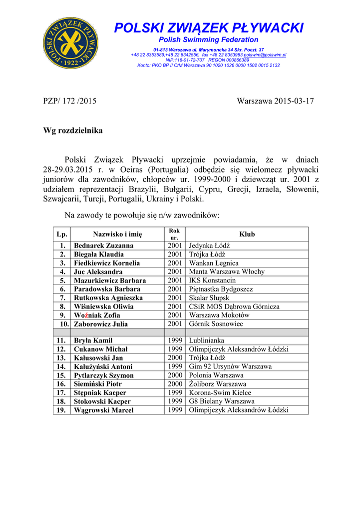 POLSKI ZWIĄZEK PŁYWACKI Polish Swimming Federation 01-813 Warszawa ul. Marymoncka 34 Skr. Poczt. 37 +48 22 8353589,+48 22 8342556, fax +48 22 8353983 [email protected] NIP:118-01-72-707 REGON 000866389 Konto: PKO BP II O/M Warszawa 90 1020 1026 0000 1502 0015 2132 PZP/ 172 /2015 Warszawa 2015-03-17 Wg rozdzielnika Polski Związek Pływacki uprzejmie powiadamia, że w dniach 28-29.03.2015 r. w Oeiras (Portugalia) odbędzie się wielomecz pływacki juniorów dla zawodników, chłopców ur. 1999-2000 i dziewcząt ur. 2001 z udziałem reprezentacji Brazylii, Bułgarii, Cypru, Grecji, Izraela, Słowenii, Szwajcarii, Turcji, Portugalii, Ukrainy i Polski. Na zawody te powołuje się n/w zawodników: Lp. 1. 2. 3. 4. 5. 6. 7. 8. 9. 10. 11. 12. 13. 14. 15. 16. 17. 18. 19. Nazwisko i imię Rok ur. Klub Bednarek Zuzanna Biegała Klaudia Fiedkiewicz Kornelia Juc Aleksandra Mazurkiewicz Barbara Paradowska Barbara Rutkowska Agnieszka Wiśniewska Oliwia Woźniak Zofia Zaborowicz Julia 2001 2001 2001 2001 2001 2001 2001 2001 2001 2001 Jedynka Łódź Trójka Łódź Wankan Legnica Manta Warszawa Włochy IKS Konstancin Piętnastka Bydgoszcz Skalar Słupsk CSiR MOS Dąbrowa Górnicza Warszawa Mokotów Górnik Sosnowiec Bryła Kamil Cukanow Michał Kałusowski Jan Kałużyński Antoni Pytlarczyk Szymon Siemiński Piotr Stępniak Kacper Stokowski Kacper Wągrowski Marcel 1999 1999 2000 1999 2000 2000 1999 1999 1999 Lublinianka Olimpijczyk Aleksandrów Łódzki Trójka Łódź Gim 92 Ursynów Warszawa Polonia Warszawa Żoliborz Warszawa Korona-Swim Kielce G8 Bielany Warszawa Olimpijczyk Aleksandrów Łódzki Prosimy także o oddelegowanie: 1. 2. 3. 4. 5. 6. 7. 8. 9. Kuczko Jan Lewiński Tomasz Golon Aleksandra Hofman Ewa Młynarczyk Maciej Rudnik Michał Strzałka Robert Wołkow Paweł Rakowski Bartosz PZP Olimpijczyk Aleksandrów Łódzki IKS Konstancin CSiR MOS Dąbrowa Górnicza Trójka Łódź Gim 92 Ursynów Warszawa Piętnastka Bydgoszcz G8 Bielany Warszawa PZP Kierownik Ekipy Trener Główny Trener Trener Trener Trener Trener Trener Trener Wyjazd na zawody nastąpi 26 marca 2015 z MDL Warszawa Okęcie o godz. 10.55 rejsem LO 527 do Pragi, powrót (lądowanie w Warszawie) 30 marca 2015 o godz. 19.40 rejsem TP 1262 z Lizbony. Zbiórka powołanych 25 marca 2015 w Hotelu Aramis w Warszawie ul. Mangalia 3b do godziny 20.00 /kolacja/. Prosimy o kontakt z trenerem Piotrem Woźnickim /do dnia 18.03.2015/ na adres email: [email protected] lub tel. 501 042 671 w celu: - potwierdzenia noclegu z 25/26.03.2015 - zamówienia noclegu z 30/31.03.2015 - zgłoszenia startów poza konkursem Program zawodów w załączeniu. Powołani zostaną wyposażeni w dresy reprezentacyjne, koszulkę, szorty, klapki firmy ARENA (zawodnicy ponadto w czepki, stroje startowe, okulary), pozostały sprzęt indywidualny do zawodów należy zabrać ze sobą. Prosimy o bezzwłoczne podanie rozmiarów: koszulki i dresy (XL, L, M, S), klapki, kostiumy startowe arena wg rozmiarów „INT” na adres [email protected]. Uwaga: osoby, które otrzymały w ubiegłym roku dresy w bieżącym roku ich nie otrzymają, proszone są o zabranie posiadanego już sprzętu. Zawodnicy niepełnoletni muszą posiadać pisemne zgody rodziców na wyjazd, a ci którzy po powrocie nie będą odbierani z lotniska przez swoich rodziców ponadto muszą posiadać pisemne upoważnienia opiekunów prawnych do odbioru przez wskazane osoby trzecie. Osoby wyjeżdżające z PZP po raz pierwszy proszone są o bezzwłoczne podanie (emailem [email protected] faxem +48 22 8353983 lub telefonicznie +48 22 8353589 w. 102) dat urodzenia, adresu zamieszkania i nr paszportu do ubezpieczenia. Kosztów przyjazdu do Warszawy i powrotu do miejsc zamieszkania po zawodach nie pokrywa PZP. Pozostałe koszty pokrywa PZP. Kierownik Organizacyjno-Szkoleniowy PZP mgr Jerzy Kowalski Otrzymują: 1. Zainteresowane Kluby/SMS 2. a/a PREZES Andrzej Kowalski Program zawodów: I blok 1. 3. 5. 100 dowolnym 200 grzbietowym 400 zmiennym Woźniak Zofia Wiśniewska Oliwia Mazurkiewicz Barbara 2. 4. 6. 100 dowolnym 200 grzbietowym 400 zmiennym 8. 4x100 zmiennym Pytlarczyk Szymon Stokowski Kacper Wągrowski Marcel 7. 4x100 zmiennym 9. 11. 13. 400 dowolnym 100 klasycznym 100 motylkowym 15. 4x200 dowolnym 17. 18. 800 dowolnym 200 klasycznym 20. 100 grzbietowym 23. 25. 200 dowolnym 200 motylkowym Zaborowicz Julia Mazurkiewicz Barbara 24. 26. 200 dowolnym 200 motylkowym Kałużyński Antoni Stokowski Kacper 27. 29. 200 zmiennym 4x100 dowolnym Paradowska Kinga 28. 30. 200 zmiennym 4x100 dowolnym Wągrowski Marcel II blok Wiśniewska Oliwia Biegała Klaudia Mazurkiewicz Barbara 10. 12. 14. 400 dowolnym 100 klasycznym 100 motylkowym 16. 4x200 dowolnym Kałużyński Antoni Kałusowski Jan Wągrowski Marcel III blok Zaborowicz Julia Rutkowska Agnieszka Juc Aleksandra 19. 200 klasycznym Siemiński Piotr 21. 22. 100 grzbietowym 1500 dowolnym Stokowski Kacper Kałużyński Antoni IV blok