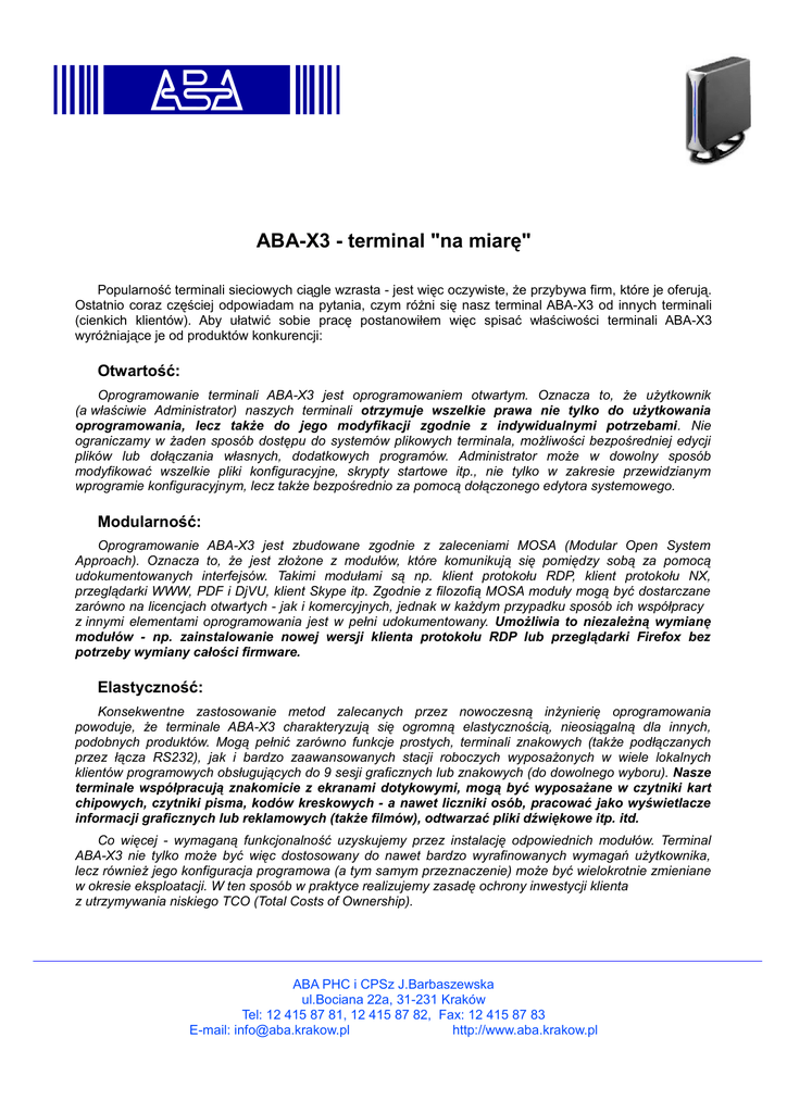 ABA-X3 - terminal "na miarę" Popularność terminali sieciowych ciągle wzrasta - jest więc oczywiste, że przybywa firm, które je oferują. Ostatnio coraz częściej odpowiadam na pytania, czym różni się nasz terminal ABA-X3 od innych terminali (cienkich klientów). Aby ułatwić sobie pracę postanowiłem więc spisać właściwości terminali ABA-X3 wyróżniające je od produktów konkurencji: Otwartość: Oprogramowanie terminali ABA-X3 jest oprogramowaniem otwartym. Oznacza to, że użytkownik (a właściwie Administrator) naszych terminali otrzymuje wszelkie prawa nie tylko do użytkowania oprogramowania, lecz także do jego modyfikacji zgodnie z indywidualnymi potrzebami. Nie ograniczamy w żaden sposób dostępu do systemów plikowych terminala, możliwości bezpośredniej edycji plików lub dołączania własnych, dodatkowych programów. Administrator może w dowolny sposób modyfikować wszelkie pliki konfiguracyjne, skrypty startowe itp., nie tylko w zakresie przewidzianym wprogramie konfiguracyjnym, lecz także bezpośrednio za pomocą dołączonego edytora systemowego. Modularność: Oprogramowanie ABA-X3 jest zbudowane zgodnie z zaleceniami MOSA (Modular Open System Approach). Oznacza to, że jest złożone z modułów, które komunikują się pomiędzy sobą za pomocą udokumentowanych interfejsów. Takimi modułami są np. klient protokołu RDP, klient protokołu NX, przeglądarki WWW, PDF i DjVU, klient Skype itp. Zgodnie z filozofią MOSA moduły mogą być dostarczane zarówno na licencjach otwartych - jak i komercyjnych, jednak w każdym przypadku sposób ich współpracy z innymi elementami oprogramowania jest w pełni udokumentowany. Umożliwia to niezależną wymianę modułów - np. zainstalowanie nowej wersji klienta protokołu RDP lub przeglądarki Firefox bez potrzeby wymiany całości firmware. Elastyczność: Konsekwentne zastosowanie metod zalecanych przez nowoczesną inżynierię oprogramowania powoduje, że terminale ABA-X3 charakteryzują się ogromną elastycznością, nieosiągalną dla innych, podobnych produktów. Mogą pełnić zarówno funkcje prostych, terminali znakowych (także podłączanych przez łącza RS232), jak i bardzo zaawansowanych stacji roboczych wyposażonych w wiele lokalnych klientów programowych obsługujących do 9 sesji graficznych lub znakowych (do dowolnego wyboru). Nasze terminale współpracują znakomicie z ekranami dotykowymi, mogą być wyposażane w czytniki kart chipowych, czytniki pisma, kodów kreskowych - a nawet liczniki osób, pracować jako wyświetlacze informacji graficznych lub reklamowych (także filmów), odtwarzać pliki dźwiękowe itp. itd. Co więcej - wymaganą funkcjonalność uzyskujemy przez instalację odpowiednich modułów. Terminal ABA-X3 nie tylko może być więc dostosowany do nawet bardzo wyrafinowanych wymagań użytkownika, lecz również jego konfiguracja programowa (a tym samym przeznaczenie) może być wielokrotnie zmieniane w okresie eksploatacji. W ten sposób w praktyce realizujemy zasadę ochrony inwestycji klienta z utrzymywania niskiego TCO (Total Costs of Ownership). ABA PHC i CPSz J.Barbaszewska ul.Bociana 22a, 31-231 Kraków Tel: 12 415 87 81, 12 415 87 82, Fax: 12 415 87 83 E-mail: [email protected] http://www.aba.krakow.pl Standaryzacja: Firma ABA jest członkiem Koalicji na Rzecz Otwartych Standardów ( www.standardy.org ). Udział w tej koalicji zobowiązuje - a więc staramy się nie stosować standardów zamkniętych (propertiary standards), lecz realizować w miarę możliwości funkcje sieciowe oraz zdalne zarządzanie i monitorowanie terminali przy użyciu standardów otwartych - np. powszechnie akceptowanych protokołów sieciowych (ftp, http, ssh itp.). Dzięki temu zdalne zarządzanie terminalami ABA-X3, ich grupami funkcjonalnymi, zdalne monitorowanie wykorzystywania zasobów, dostęp do dzienników (logów) terminala nie wymaga korzystania z jakiegokolwiek dodatkowego oprogramowania i może być realizowane z dowolnego komputera wyposażonego w podstawowe oprogramowanie komunikacyjne niezależnie od systemu operacyjnego. Nasi klienci unikają w ten sposób efektu uzależnienia się od dostawcy "Vendor Lock-In". Wsparcie techniczne, szkolenia, konsultacje itp. Oprogramowanie naszych terminali tworzymy sami - korzystając głównie z modułów dostępnych na licencjach otwartych (lecz nie tylko). Tworzymy je w Krakowie i sprawdzamy w naszym laboratorium. Jesteśmy więc w stanie oferować Państwu naprawdę kompetentną i szybką pomoc techniczną - ponieważ nie musimy się konsultować z autorami oprogramowania pracującymi za granicą. Zakres tej pomocy obejmuje: • • • • • konsultacje i testy przy projektowaniu i wdrażaniu systemu, nieodpłatną pomoc przy konfiguracji terminali (60 dni od daty ich zakupu), odpłatne kontrakty wsparcia technicznego z gwarantowaną dostawą uaktualnień - włącznie, dostosowywanie funkcji terminali do Państwa indywidualnych potrzeb, ekspresową wymianę sprzętu w ciągu jednego dnia roboczego. Prowadzimy także specjalistyczne szkolenia dla Administratorów, które są również zorganizowane w trakcie tych szkoleń ich uczestnicy realizują szereg ćwiczeń praktycznych. Jesteśmy głęboko przekonani, że tak kompleksowej oferty nie otrzymacie Państwo od naszej konkurencji. Terminale z naszym oprogramowaniem dla kluczowych klientów dostarczamy od ponad 10 lat. Średni ich czas eksploatacji przekracza 8 lat - do dziś pracuje kilkanaście tysięcy terminali poprzednich generacji. Ich oprogramowanie opracowano jeszcze do współpracy z serwerami MS Windows 2000 Server oraz SCO OpenServer. Dziś z powodzeniem współpracują z serwerami MS Windows 2008 bez potrzeby wymiany platformy sprzętowej! Możliwe jest również zwiększenie funkcjonalności poprzednich generacji naszych terminali poprzez wymianę wewnętrznej pamięci FLASH np. z 32 MB na 256 MB lub więcej. Ceny tych pamięci uległy znacznemu zmniejs
