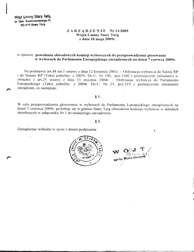WOlt GminY S`tł~~ ~~~ ZARZĄDZENIE Nr 11/2009 Wójta Gminy