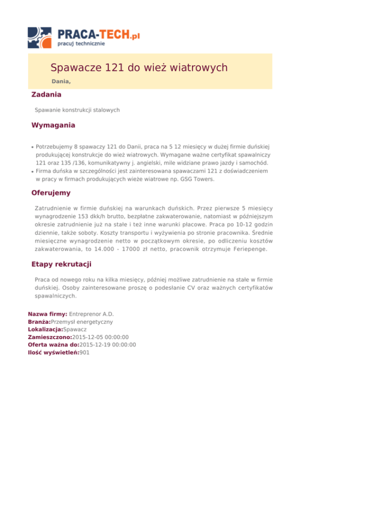 Spawacze 121 do wież wiatrowych Dania, Zadania Spawanie konstrukcji stalowych Wymagania ● ● Potrzebujemy 8 spawaczy 121 do Danii, praca na 5 12 miesięcy w dużej firmie duńskiej produkującej konstrukcje do wież wiatrowych. Wymagane ważne certyfikat spawalniczy 121 oraz 135 /136, komunikatywny j. angielski, mile widziane prawo jazdy i samochód. Firma duńska w szczególności jest zainteresowana spawaczami 121 z doświadczeniem w pracy w firmach produkujących wieże wiatrowe np. GSG Towers. Oferujemy Zatrudnienie w firmie duńskiej na warunkach duńskich. Przez pierwsze 5 miesięcy wynagrodzenie 153 dkk/h brutto, bezpłatne zakwaterowanie, natomiast w późniejszym okresie zatrudnienie już na stałe i też inne warunki płacowe. Praca po 10-12 godzin dziennie, także soboty. Koszty transportu i wyżywienia po stronie pracownika. Średnie miesięczne wynagrodzenie netto w początkowym okresie, po odliczeniu kosztów zakwaterowania, to 14.000 - 17000 zł netto, pracownik otrzymuje Feriepenge. Etapy rekrutacji Praca od nowego roku na kilka miesięcy, później możliwe zatrudnienie na stałe w firmie duńskiej. Osoby zainteresowane proszę o podesłanie CV oraz ważnych certyfikatów spawalniczych. Nazwa firmy: Entreprenor A.D. Branża:Przemysł energetyczny Lokalizacja:Spawacz Zamieszczono:2015-12-05 00:00:00 Oferta ważna do:2015-12-19 00:00:00 Ilość wyświetleń:901