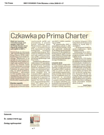 TAI Press 0801133349301 Puls Biznesu z dnia 2008-01-17 Czkawka po Prima Charter Miała być wzorowa restrukturyzacja, jest upadek. Cash Flow na Primie Charter straci więcej niż wyniósł cały zysk spółki w 2007 r. Potwierdzają się informacje „PB" o katastrofalnej kondycji Primy Charter (PCK), niskokosztowego przewoźnika lotniczego. Wątpliwości w tej sprawie nie ma już nawet zarząd firmy, który właśnie wystąpił o jego upadłość. Sąd rozpatrzy ten wniosek razem z innym, złożonym wcześniej przez jednego z wierzycieli. Dokładnie za tydzień zdecyduje, czy ogłosić upadłość likwidacyjną i wprowadzić do PCh syndyka (czego chcą wierzyciele), czy wybrać tzw. układ likwidacyjny, za którym optuje zarząd (wtedy to on likwidowałby majątek spółki). Klamka zapadła Tak czy inaczej los specjalizującej się w obsłudze lotów czarterowych spółki jest przesądzony. A przecież jeszcze niedawno Adam Wychowaniec, członek zarządu, a wcześniej prezes PCh, zapewniał, że spółka funkcjonuje normalnie i upadłość jej nie grozi. Wtórował mu Grzegorz Gniady, szef rady nadzorczej lotniczej spółki, a jednocześnie wiceprezes giełdowego Cash Flow(CF). Upadek PCh to głównie porażka właśnie CF: największego udziałowca przewoźnika (ponad 22 proc. kapitału). Giełdowy windykator przez blisko rok informował inwestorów o postępach w odbudowie kondycji PCh, by w sierpniu 2007 r. ogłosić zakończenie jej restrukturyzacji sukcesem. Z raportów CF wynikało, że przewoźnik ma kapitał 75,6 min zł, objęty m.in. przez poważnego inwestora: TFI Opera oraz że w 2007 r. zarobi na czysto ponad 20 min zł, a na przeło- Dziennik Śr. nakład 31615egz. Zasięg ogólnopolski s.7 mie 2007 r. i 2008 r. zadebiutuje na GPW. W październiku 2007 r. ujawniliśmy jednak w „PB", że CF ukrywa prawdę o PCh i jej —już wtedy—złej kondycji. Wefekcie sprawą naruszenia przez CF obowiązków informacyjnych zajęła się Komisja Nadzoru Finansowego (jej postępowanie trwa), a inwestorzy przecenili akcje giełdowego windykatora. Liczenie strat Bardzo możliwe, że jego walory czeka kolejna przecena. Zgodnie z prognozami zarządu, spółka w 2007 r. miała zarobić na czysto 7,5 min zł. I, jak wynika z naszych informacji, zarobiła. Tyle że wynik ten nie uwzględnia strat, poniesionych na inwestycji w PCh. A te są niebagatelne. Z naszych wyliczeń wynika, że na kupno udziałów i pożyczki dla lotniczej spółki CF wyłożył co najmniej 11 min zł. Grzegorz Gniady zapewnia, że rezerwy związane z PCh będą niższe niż 10 min zł. Czy wpłyną na wynik 2007 r., czy 2008 r.? —W tej sprawie trwają rozmowy z audytorem — mówi Grzegorz Gniady. Rozliczenie ich w 2007 r. oznaczać będzie, że zamiast prognozowanego zysku, CF wykaże stratę. Bankructwo PCh będzie też słono kosztować innych jej udziałowców (faktycznych i niedoszłych). Giełdowa Lubawa straci l min zł, a jej najwięksi akcjonariusze: Krzysztof Fijałkowski i Jacek Łukjanow ponad 10 min zł. Na minusie będzie też Opera TFI (ok. 12 min zł) i znany inwestor Krzysztof Moska (ok. 5 min zł). Najbardziej gorzką pigułkę będzie musiało jednak przełknąć biuro podróży Exim Tours, które według naszych szacunków straciło około 15 min zł. Dawid Tokarz [email protected]« 022-333-99-30