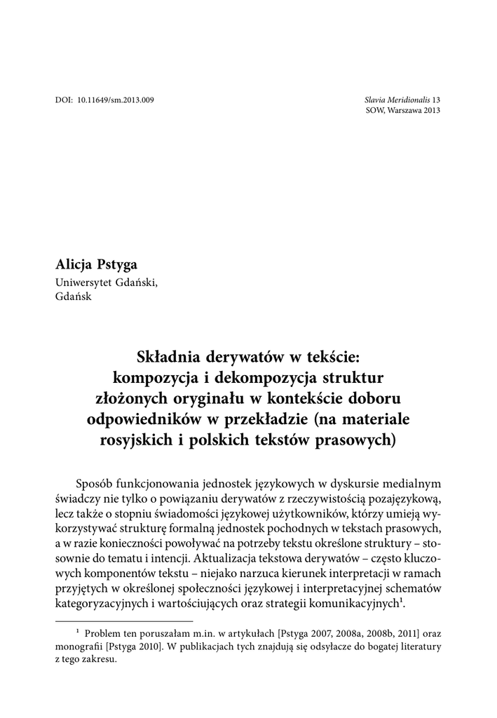 DOI: 10.11649/sm.2013.009 Slavia Meridionalis 13 SOW, Warszawa 2013 Alicja Pstyga Uniwersytet Gdański, Gdańsk Składnia derywatów w tekście: kompozycja i dekompozycja struktur złożonych oryginału w kontekście doboru odpowiedników w przekładzie (na materiale rosyjskich i polskich tekstów prasowych) Sposób funkcjonowania jednostek językowych w dyskursie medialnym świadczy nie tylko o powiązaniu derywatów z rzeczywistością pozajęzykową, lecz także o stopniu świadomości językowej użytkowników, którzy umieją wykorzystywać strukturę formalną jednostek pochodnych w tekstach prasowych, a w razie konieczności powoływać na potrzeby tekstu określone struktury – stosownie do tematu i intencji. Aktualizacja tekstowa derywatów – często kluczowych komponentów tekstu – niejako narzuca kierunek interpretacji w ramach przyjętych w określonej społeczności językowej i interpretacyjnej schematów kategoryzacyjnych i wartościujących oraz strategii komunikacyjnych1. 1 Problem ten poruszałam m.in. w artykułach [Pstyga 2007, 2008a, 2008b, 2011] oraz monografii [Pstyga 2010]. W publikacjach tych znajdują się odsyłacze do bogatej literatury z tego zakresu. 172 Alicja Pstyga Swoistość języka w mediach, z obecną w nim z jednej strony tendencją do intelektualizacji, internacjonalizacji i terminologizacji, z drugiej zaś – skłonnością do demokratyzacji, dominującą potocznością, emocjonalnalizacją i atrakcyjnością przekazu [Bauer, Chudziński 2010; Gajda 2001; Ohnheiser 2003; Širjaev 1997; Володина 2008], pozwala, aby pojawiały się w nim ekonomiczne struktury złożone z określonymi komponentami strukturalnymi, które – wyeksponowane w określonym kontekście – wyróżniają się ze względu na swoją strukturę formalną i skupiają na sobie uwagę odbiorcy. Bieżące tematy medialne, na potrzeby których powołuje się i przywołuje formacje słowotwórcze, sprawiają, że ich interpretacja wymaga odniesienia do właściwego kontekstu. W połączeniu z wpisanymi w nie (w ramach określonego tekstu) intencjami nadawcy niewątpliwie komplikuje to ich semantykę. Formacje takie należą do struktur raczej indywidualnych, nieprzewidywalnych, ale atrakcyjnych i wyrazistych medialnie, pozwalających na przekazywanie dodatkowych sensów ukrytych. Można przywołać w tym kontekście derywaty takie jak antyżałoba w tekście z okazji rocznicy katastrofy smoleńskiej [Pstyga (w druku)], deschetynizacja w wypowiedzi na temat polityki PO [Pstyga 2011], rosyjski евронадeжды w artykule, którego treść wiązała się z planowanymi zyskami w związku z organizacją Euro 2012, czy europazerni w polskim przekładzie tego artykułu. W tworzeniu podtekstów szczególną rolę odgrywają zatem derywaty słowotwórcze o przejrzystej budowie formalnej i czytelnych relacjach motywacyjnych, aczkolwiek z zaskakującą niekiedy kombinacją morfemów, zwykle nacechowane strukturalnie i społecznie. Ich interpretacja wymaga znajomości bazy derywacyjnej, będącej jednak wyłącznie podstawą formalną. Podstawa semantyczna wymaga tymczasem uwzględnienia konotacji i wiedzy pozajęzykowej, a zatem całego kontekstu czy też znajomości określonej sytuacji. Derywaty tego typu są ważnymi komponentami tekstów, ponieważ z jednej strony tworzą one obraz rzeczywistości z perspektywy nadawcy, autora, z drugiej zaś – doskonale wpisują się (z perspektywy odbiorcy) w obraz kreowany przez media. Jest w tych konstrukcjach pewna logiczność, którą – jak zamierzam dowieść – ujawniają metody składniowe prof. Stanisława Karolaka, jako że „struktura wewnętrzna formacji uzyskuje analogię do struktury zdania elementarnego” [Karolak 2001b: 247]. Z tego punktu widzenia ważne jest stwierdzenie wspomnianego badacza, że ustalenie znaczeń i funkcji derywatów wymaga „ich usytuowania w kontekście realizującym ich implikacje semantyczne” [Karolak 2001c: 272–273], a „semantyczno-syntaktyczna interpretacja derywatów ma pod względem adekwatności znaczną przewagę nad interpretacją opartą na analizie Składnia derywatów w tekście: kompozycja i dekompozycja struktur złożonych… 173 formalnych stosunków między podstawą a derywatem, nie zawsze pozwalającą wyjaśnić znaczne niekiedy rozbieżności między stosunkami w strukturze treści derywatów a stosunkami w ich strukturze formalnej” [Karolak 2001b: 249]. Ustalenia Stanisława Karolaka dotyczące reguł kombinatorycznych szczegółowo-językowych (idiomatycznych) oraz skomplikowanych relacji budowy wewnętrznej (formalnej i semantycznej) struktur złożonych, których dekompozycja – również przy naruszeniu reguł kookurencji pojęć – pozwala na wykrycie właściwej interpretacji semantycznej, inspirują i zachęcają do analizy derywatów słowotwórczych jako jednostek tekstu. Komunikacyjno-pragmatyczny potencjał słowotwórstwa (zob. m.in. artykuły zawarte w tomach [Badyda, Maćkiewicz, Rogowska-Cybulska 2011] i [Nowak, Tokarski 2007]) implikuje i ujawnia zarazem składnia derywatów, których komponenty w ramach nadsumatywnej [por. Dobrzyńska 1993; Paepcke 2009] całości tekstowej2 w sposób szczególny odpowiadają elementom konstruowanej rzeczywistości medialnej. Stosunki semantyczne między składnikami treści w powiązaniu ze składnikami strukturalnymi zamierzam wykazać w ramach konfrontacji przekładowej, a więc z odniesieniem do tekstów i konkretnych przypadków użycia derywatów okazjonalnych. Analiza wyabstrahowanych z tekstów struktur złożonych potwierdza bowiem dominację właściwości semantycznych, nadrzędnych względem właściwości morfologicznych. Konfrontacja przekładowa ukazuje dodatkowe problemy interpretacyjne, ujmowane w kategoriach odpowiedników tekstowych3, ponieważ „translacja tekstu jest translacją z jednego języka na drugi, stąd wymiar odmienności tekstu, początkowo niezrozumiałej, rośnie jak ciasto 