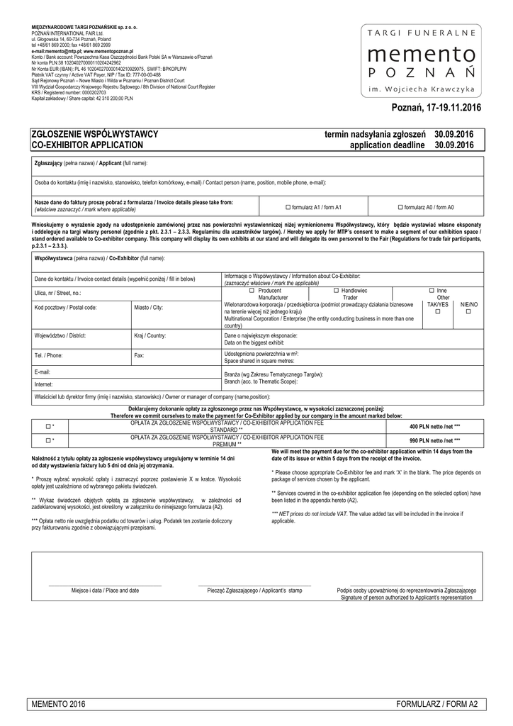 MIĘDZYNARODOWE TARGI POZNAŃSKIE sp. z o. o. POZNAŃ INTERNATIONAL FAIR Ltd. ul. Głogowska 14, 60-734 Poznań, Poland tel +48/61 869 2000; fax +48/61 869 2999 e-mail:[email protected]; www.mementopoznan.pl Konto / Bank account: Powszechna Kasa Oszczędności Bank Polski SA w Warszawie o/Poznań Nr konta PLN:38 102040270000110204242962 Nr Konta EUR (IBAN): PL 46 102040270000140210929075, SWIFT: BPKOPLPW Płatnik VAT czynny / Active VAT Payer, NIP / Tax ID: 777-00-00-488 Sąd Rejonowy Poznań – Nowe Miasto i Wilda w Poznaniu / Poznan District Court VIII Wydział Gospodarczy Krajowego Rejestru Sądowego / 8th Division of National Court Register KRS / Registered number: 0000202703 Kapitał zakładowy / Share capital: 42 310 200,00 PLN Poznań, 17-19.11.2016 ZGŁOSZENIE WSPÓŁWYSTAWCY CO-EXHIBITOR APPLICATION termin nadsyłania zgłoszeń 30.09.2016 application deadline 30.09.2016 Zgłaszający (pełna nazwa) / Applicant (full name): Osoba do kontaktu (imię i nazwisko, stanowisko, telefon komórkowy, e-mail) / Contact person (name, position, mobile phone, e-mail): Nasze dane do faktury proszę pobrać z formularza / Invoice details please take from: (właściwe zaznaczyć / mark where applicable) formularz A1 / form A1 formularz A0 / form A0 Wnioskujemy o wyrażenie zgody na udostępnienie zamówionej przez nas powierzchni wystawienniczej niżej wymienionemu Współwystawcy, który będzie wystawiać własne eksponaty i oddeleguje na targi własny personel (zgodnie z pkt. 2.3.1 – 2.3.3. Regulaminu dla uczestników targów). / Hereby we apply for MTP’s consent to make a segment of our exhibition space / stand ordered available to Co-exhibitor company. This company will display its own exhibits at our stand and will delegate its own personnel to the Fair (Regulations for trade fair participants, p.2.3.1 – 2.3.3.). Współwystawca (pełna nazwa) / Co-Exhibitor (full name): Dane do kontaktu / Invoice contact details (wypełnić poniżej / fill in below) Ulica, nr / Street, no.: Informacje o Współwystawcy / Information about Co-Exhibitor: (zaznaczyć właściwe / mark the applicable) Producent Handlowiec Manufacturer Trader Wielonarodowa korporacja / przedsiębiorca (podmiot prowadzący działania biznesowe na terenie więcej niż jednego kraju) Multinational Corporation / Enterprise (the entity conducting business in more than one country) Kod pocztowy / Postal code: Miasto / City: Województwo / District: Kraj / Country: Dane o największym eksponacie: Data on the biggest exhibit: Tel. / Phone: Fax: Udostępniona powierzchnia w m2: Space shared in square metres: E-mail: Internet: Inne Other TAK/YES NIE/NO Branża (wg Zakresu Tematycznego Targów): Branch (acc. to Thematic Scope): Właściciel lub dyrektor firmy (imię i nazwisko, stanowisko) / Owner or manager of company (name,position): Deklarujemy dokonanie opłaty za zgłoszonego przez nas Współwystawcę, w wysokości zaznaczonej poniżej: Therefore we commit ourselves to make the payment for Co-Exhibitor applied by our company in the amount marked below: OPŁATA ZA ZGŁOSZENIE WSPÓŁWYSTAWCY / CO-EXHIBITOR APPLICATION FEE * 400 PLN netto /net *** STANDARD ** OPŁATA ZA ZGŁOSZENIE WSPÓŁWYSTAWCY / CO-EXHIBITOR APPLICATION FEE * 990 PLN netto /net *** PREMIUM ** We will meet the payment due for the co-exhibitor application within 14 days from the Należność z tytułu opłaty za zgłoszenie współwystawcy uregulujemy w terminie 14 dni date of its issue or within 5 days from the receipt of the invoice. od daty wystawienia faktury lub 5 dni od dnia jej otrzymania. * Please choose appropriate Co-Exhibitor fee and mark ‘X’ in the blank. The price depends on package of services chosen by the applicant. * Proszę wybrać wysokość opłaty i zaznaczyć poprzez postawienie X w kratce. Wysokość opłaty jest uzależniona od wybranego pakietu świadczeń. ** Services covered in the co-exhibitor application fee (depending on the selected option) have ** Wykaz świadczeń objętych opłatą za zgłoszenie współwystawcy, w zależności od been listed in the appendix hereto (A2). zadeklarowanej wysokości, jest określony w załączniku do niniejszego formularza (A2). *** NET prices do not include VAT. The value added tax will be included in the invoice if *** Opłata netto nie uwzględnia podatku od towarów i usług. Podatek ten zostanie doliczony applicable. przy fakturowaniu zgodnie z obowiązującymi przepisami. _________________________________________ Miejsce i data / Place and date MEMENTO 2016 _________________________________________ Pieczęć Zgłaszającego / Applicant’s stamp _________________________________________ Podpis osoby upoważnionej do reprezentowania Zgłaszającego Signature of person authorized to Applicant’s representation FORMULARZ / FORM A2