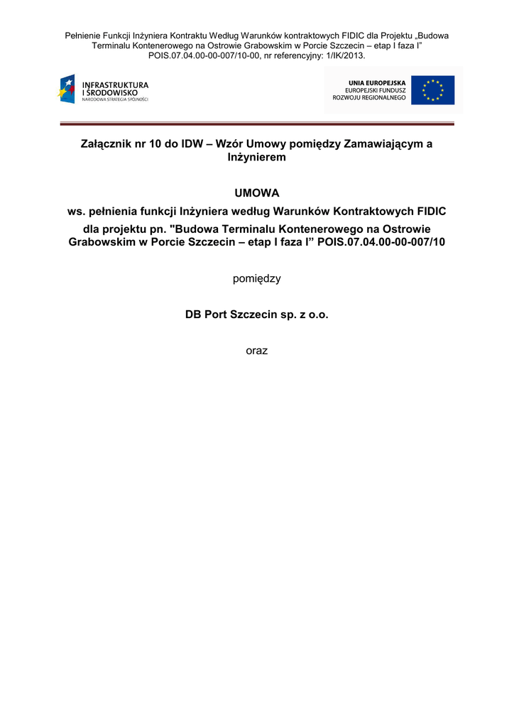 Pełnienie Funkcji Inżyniera Kontraktu Według Warunków kontraktowych FIDIC dla Projektu „Budowa Terminalu Kontenerowego na Ostrowie Grabowskim w Porcie Szczecin – etap I faza I” POIS.07.04.00-00-007/10-00, nr referencyjny: 1/IK/2013. Załącznik nr 10 do IDW – Wzór Umowy pomiędzy Zamawiającym a Inżynierem UMOWA ws. pełnienia funkcji Inżyniera według Warunków Kontraktowych FIDIC dla projektu pn. "Budowa Terminalu Kontenerowego na Ostrowie Grabowskim w Porcie Szczecin – etap I faza I” POIS.07.04.00-00-007/10 pomiędzy DB Port Szczecin sp. z o.o. oraz Pełnienie Funkcji Inżyniera Kontraktu Według Warunków kontraktowych FIDIC dla Projektu „Budowa Terminalu Kontenerowego na Ostrowie Grabowskim w Porcie Szczecin – etap I faza I” POIS.07.04.00-00-007/10-00, nr referencyjny: 1/IK/2013. Niniejsza umowa ws. pełnienia funkcji Inżyniera według Warunków Kontraktowych FIDIC dla projektu pn. „Budowa Terminalu Kontenerowego na Ostrowie Grabowskim w Porcie Szczecin – etap I faza I” POIS.07.04.00-00-007/10 została zawarta w dniu _____ listopada 2013 roku w Szczecinie pomiędzy: (1) DB PORT SZCZECIN SP. Z O.O. z siedzibą w Szczecinie, przy ul. Bytomskiej 14, 70-603 Szczecin, Polska, wpisaną do rejestru przedsiębiorców Krajowego Rejestru Sądowego, prowadzonego przez Sąd Rejonowy Szczecin-Centrum w Szczecinie, XIII Wydział Gospodarczy Krajowego Rejestru Sądowego pod numerem KRS 0000029909, REGON: 810622795 NIP: 851-01-09-332, reprezentowaną przez: Manfreda Michel - Prezesa Zarządu zwaną dalej „Zamawiającym” oraz (2) [●] zwaną dalej „Inżynierem” §1. Przepis wstępny Umowa została zawarta w rezultacie postępowania prowadzonego w trybie przetargu jednostopniowego nieograniczonego na Pełnienie funkcji Inżyniera według Warunków Kontraktowych FIDIC dla Projektu „Budowa Terminalu Kontenerowego na Ostrowie Grabowskim w Porcie Szczecin – etap I faza I” POIS.07.04.00-00-007/10 przeprowadzonego w oparciu o Procedurę Zawierania Umów DB Port Szczecin, a w zakresie nieuregulowanym tą procedurą, odpowiednio w oparciu o postanowienia KC. §2. Definicje Ilekroć w Umowie poniższe pojęcia zostaną zapisane z wielkiej litery, Strony nadają im znaczenie wskazane w następujących definicjach: 1) Dokumentacja Projektowa - dokumentacja wykonana przez Projektanta w ramach umowy nr 1/2010 z 19 kwietnia 2010 roku pomiędzy Zamawiającym a Projektantem. 2) Inwestycja - przedsięwzięcie budowlane pod nazwą "Budowa Terminalu Kontenerowego na Ostrowie Grabowskim w Porcie Szczecin – etap I faza I”, współfinansowane ze środków Unii Europejskiej na podstawie Umowy z CUPT, nadzorowane przez Inżyniera na podstawie Umowy i realizowane przez Wykonawcę na podstawie Kontraktu. 3) KC - ustawa z dnia 23 kwietnia 1964 roku Kodeks cywilny (Dz. U. z 1964 Nr 16 poz. 93). 4) Kontrakt – umowa zawarta przez Zamawiającego z Wykonawcą w celu realizacji Inwestycji, w tym Akt Umowy, Warunki Ogólne oraz Warunki Szczególne wraz z wszystkimi załącznikami, specyfikacjami i modyfikacjami. 5) OPU – Opis Przedmiotu Umowy stanowiący Część II SIWU. 2 Pełnienie Funkcji Inżyniera Kontraktu Według Warunków kontraktowych FIDIC dla Projektu „Budowa Terminalu Kontenerowego na Ostrowie Grabowskim w Porcie Szczecin – etap I faza I” POIS.07.04.00-00-007/10-00, nr referencyjny: 1/IK/2013. 6) IDW – Instrukcja dla Wykonawców stanowiąca Część I SIWU. 7) POIiŚ - Program Operacyjny Infrastruktura i Środowisko, wersja 2.0 – oś priorytetowa VII (Centra logistyczne i terminale kontenerowe). 8) Prawo budowlane - ustawa z dnia 7 lipca 1994 roku (tekst jednolity Dz.U. z 2010 Nr 243, poz. 1623 ze zm.), wraz z aktami wykonawczymi, w tym w szczególności rozporządzeniem Ministra Transportu i Gospodarki Morskiej z dnia 1 czerwca 1998 roku w sprawie warunków technicznych, jakim powinny odpowiadać morskie budowle hydrotechniczne i ich usytuowanie (Dz.U. nr 101, poz. 645). 9) Procedura Zawierania Umów - Procedura Zawierania Umów DB Port Szczecin. 10) Raport okresowy – raport sporządzany przez Inżyniera z częstotliwością zgodną z OPU oraz o zakresie informacji określonym w OPU, obrazujący stan realizacji Kontraktu i Umowy. 11) Siła Wyższa – wydarzenia lub okoliczności, które są poza kontrolą Stron i nie są zawinione przez żadną ze Stron, których nie można było przewidzieć ani uniknąć, a które zaistnieją po podpisaniu Umowy i staną się przeszkodą w realizacji Umowy. Należą do nich wojna, zamieszki, rebelie, działania zbrojne i terrorystyczne. 12) SIWU – Specyfikacja Istotnych Warunków Umowy do postępowania mającego na celu zawarcie umowy na Pełnienie Funkcji Inżyniera Kontraktu Według Warunków FIDIC dla Projektu „Budowa terminalu kontenerowego na Ostrowie Grabowskim w Porcie Szczecin – etap I faza I” prowadzonego w trybie przetargu jednostopniowego nieograniczonego. 13) Strona – Inżynier albo Zamawiający. 14) Strony – Inżynier i Zamawiający łącznie. 15) Umowa – niniejsza Umowa wraz z załącznikami. 16) Umowa z CUPT – Umowa o dofinansowanie Projektu „Budowa terminalu kontenerowego na Ostrowie Grabowskim w Porcie Szczecin – etap I faza I”, POIS.07.04.00-00-007/10, w ramach działania 7.4: Rozwój transportu intermodalnego priorytetu VII: Transport przyjazny środowisku Programu Operacyjnego Infrastruktura i Środowisko 2007-2013, zawarta 12 marca 2012 roku pomiędzy Zamawiającym a Centrum Unijnych Projektów Transportowych. 17) Warunki FIDIC – „Warunki kontraktowe dla budowy dla robót inżynieryjno – budowlanych projektowanych przez zamawiającego” (CONDITIONS OF CONTRACT FOR CONSTRUCTION FOR BUILDING AND ENGINEERING WORKS DESIGNED BY THE EMPLOYER) Wydawnictwo: SIDIR; ISBN: 83-86774-30-4; Rok wydania: SIDIR 2008 FIDIC 1999; Opis edycji: 4. Wydanie angielsko-polskie niezmienione 2008 Tłumaczenie pierwszego wydania 1999, przygotowane i opublikowane przez Międzynarodową Federację
