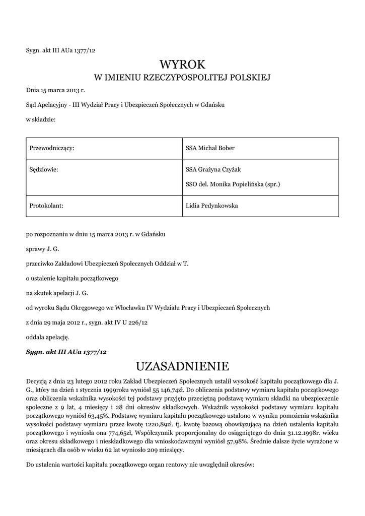 Sygn. akt III AUa 1377/12 WYROK W IMIENIU RZECZYPOSPOLITEJ POLSKIEJ Dnia 15 marca 2013 r. Sąd Apelacyjny - III Wydział Pracy i Ubezpieczeń Społecznych w Gdańsku w składzie: Przewodniczący: SSA Michał Bober Sędziowie: SSA Grażyna Czyżak SSO del. Monika Popielińska (spr.) Protokolant: Lidia Pedynkowska po rozpoznaniu w dniu 15 marca 2013 r. w Gdańsku sprawy J. G. przeciwko Zakładowi Ubezpieczeń Społecznych Oddział w T. o ustalenie kapitału początkowego na skutek apelacji J. G. od wyroku Sądu Okręgowego we Włocławku IV Wydziału Pracy i Ubezpieczeń Społecznych z dnia 29 maja 2012 r., sygn. akt IV U 226/12 oddala apelację. Sygn. akt III AUa 1377/12 UZASADNIENIE Decyzją z dnia 23 lutego 2012 roku Zakład Ubezpieczeń Społecznych ustalił wysokość kapitału początkowego dla J. G., który na dzień 1 stycznia 1999roku wyniósł 55 146,74zł. Do obliczenia podstawy wymiaru kapitału początkowego oraz obliczenia wskaźnika wysokości tej podstawy przyjęto przeciętną podstawę wymiaru składki na ubezpieczenie społeczne z 9 lat, 4 miesięcy i 28 dni okresów składkowych. Wskaźnik wysokości podstawy wymiaru kapitału początkowego wyniósł 63,45%. Podstawę wymiaru kapitału początkowego ustalono w wyniku pomożenia wskaźnika wysokości podstawy wymiaru przez kwotę 1220,89zł. tj. kwotę bazową obowiązującą na dzień ustalenia kapitału początkowego i wyniosła ona 774,65zł, Współczynnik proporcjonalny do osiągniętego do dnia 31.12.1998r. wieku oraz okresu składkowego i nieskładkowego dla wnioskodawczyni wyniósł 57,98%. Średnie dalsze życie wyrażone w miesiącach dla osób w wieku 62 lat wyniosło 209 miesięcy. Do ustalenia wartości kapitału początkowego organ rentowy nie uwzględnił okresów: - od 16.08. (...). do 15.06.1972r., gdyż dokumenty przedłożone na jego potwierdzenie nie spełniają wymogów formalnych- brak czytelnego podpisu osoby upoważnionej do wystawiania dokumentów; - od 11.09.1990r. do 31.12.1998r., gdyż w tym okresie pobierała rentę z tytułu niezdolności do pracy. Odwołanie od powyższej decyzji wywiodła J. G., która kwestionując jej zasadność wniosła o zaliczenie do podstawy wymiaru kapitału początkowego okresu pracy od 16.08.1971r. do 15.06.1972r. W odpowiedzi na odwołanie Zakład Ubezpieczeń Społecznych przytaczając argumentację zaprezentowaną jak w zaskarżonej decyzji wniósł o oddalenie odwołania. Dodatkowo organ rentowy nadmienił, że z kopii umowy załączonej przez wnioskodawczynię wynika, że została zatrudniona na umowę zlecenia jako zlewniarz w (...) Spółdzielni (...) w L.. Nadto organ podniósł, że składając wniosek o rentę w 1990r. podała, że od 29.03.1969r. do 29.03.1972r. pracowała w gospodarstwie rolnym rodziców, co potwierdziła również oświadczeniem z dnia 20.10.2005r. Mając na uwadze podniesione okoliczności organ rentowy uznał zaskarżoną decyzję za zasadną. Sąd Okręgowy we Włocławku Sąd Pracy i Ubezpieczeń Społecznych wyrokiem z dnia 29 maja 2012r. wydanym w sprawie IV U 226/12 oddalił odwołanie ubezpieczonej J. G.. Sąd Okręgowy orzekał w oparciu o następujące ustalenia i rozważania : J. G.urodziła się(...). W okresie od dnia 29 marca 1967roku do dnia 29 grudnia 1972roku pracowała w gospodarstwie rolnym rodziców położonym w miejscowości L.. Następnie prowadziła własne gospodarstwo rolne. W dniu 1 sierpnia 1984roku J. G. urodziła córkę A.. W okresie od dnia 13 kwietnia 1981roku do dnia 10 września 1990roku wnioskodawczyni pracowała w Gminnej Spółdzielni (...) w punkcie sprzedaży detalicznej w L.. Od dnia 11 września 1990 roku J. G. pobiera rentę z tytułu niezdolności do pracy. Decyzją z dnia 23 lutego 2012roku Zakład Ubezpieczeń Społecznych ustalił wysokość kapitału początkowego dla J. G., który na dzień 1 stycznia 1999roku wyniósł 55 146,74zł. Do obliczenia podstawy wymiaru kapitału początkowego oraz obliczenia wskaźnika wysokości tej podstawy przyjęto przeciętną podstawę wymiaru składki na ubezpieczenie społeczne z 9 lat, 4 miesięcy i 28 dni okresów składkowych. Wskaźnik wysokości podstawy wymiaru kapitału początkowego wyniósł 63,45%. Podstawę wymiaru kapitału początkowego ustalono w wyniku pomożenia wskaźnika wysokości podstawy wymiaru przez kwotę 1220,89zł. tj. kwotę bazową obowiązującą na dzień ustalenia kapitału początkowego i wyniosła ona 774,65zł, Współczynnik proporcjonalny do osiągniętego do dnia 31.12.1998r. wieku oraz okresu składkowego i nieskładkowego dla wnioskodawczyni wyniósł 57,98%. Średnie dalsze życie wyrażone w miesiącach dla osób w wieku 62 lat wyniosło 209 miesięcy. Do ustalenia wartości kapitału początkowego organ rentowy nie uwzględnił okresów: - od 16.08. 11971r. do 15.06.1972r., gdyż dokumenty przedłożone na jego potwierdzenie nie spełniają wymogów formalnych- brak czytelnego podpisu osoby upoważnionej do wystawiania dokumentów; - od 11.09.1990r. do 31.12.1998r., gdyż w tym okresie pobierał rentę z tytułu niezdolności do pracy. Sąd Okręgowy wskazał, iż stan faktyczny w sprawie ustalił w oparciu o dokumenty zgromadzone przez organ rentowy, albowiem żadna ze stron postępowania nie kwestionowała ich autentyczności oraz o dokumenty zgromadzone w aktach osobowych wnioskodawczyni z Gminnej Spółdzielni (...) w M., albowiem nie noszą one jakichkolwiek znamion przerobienia lub skreśleń, które mogłyby rzutować na ocenę jego autentyczności. Na ich podstawie Sąd Okręgowy ustalił w jakim czasookresie i w jakim charakterze była w nim zatrudniona odwołująca. Przystępując do rozważań dotyczących zaskarżonej decyzji Sąd Okręgowy podkreślił, iż ustawodawca wprowadzając w życie ustawę z dnia 17 grudnia 1998r. o emeryturach i rentach z Funduszu Ubezpieczeń Społecznych w art. 173 ust. 1 i art. 174 ust. 1 - 3 ustanowił obowiązek ustalenia kapitału początkowego dla ubezpieczonyc