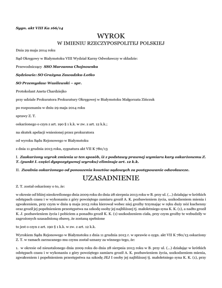 Sygn. akt VIII Ka 166/14 WYROK W IMIENIU RZECZYPOSPOLITEJ POLSKIEJ Dnia 29 maja 2014 roku Sąd Okręgowy w Białymstoku VIII Wydział Karny Odwoławczy w składzie: Przewodniczący SSO Marzanna Chojnowska Sędziowie: SO Grażyna Zawadzka-Lotko SO Przemysław Wasilewski – spr. Protokolant Aneta Chardziejko przy udziale Prokuratora Prokuratury Okręgowej w Białymstoku Małgorzata Zińczuk po rozpoznaniu w dniu 29 maja 2014 roku sprawy Z. T. oskarżonego o czyn z art. 190 § 1 k.k. w zw. z art. 12 k.k.; na skutek apelacji wniesionej przez prokuratora od wyroku Sądu Rejonowego w Białymstoku z dnia 11 grudnia 2013 roku, sygnatura akt VII K 780/13 I. Zaskarżony wyrok zmienia w ten sposób, iż z podstawy prawnej wymiaru kary oskarżonemu Z. T. (punkt I. części dyspozytywnej wyroku) eliminuje art. 12 k.k. II. Zwalnia oskarżonego od ponoszenia kosztów sądowych za postępowanie odwoławcze. UZASADNIENIE Z. T. został oskarżony o to, że: w okresie od bliżej nieokreślonego dnia 2009 roku do dnia 28 sierpnia 2013 roku w B. przy ul. (...) działając w krótkich odstępach czasu i w wykonaniu z góry powziętego zamiaru groził A. K. pozbawieniem życia, uszkodzeniem mienia i zgwałceniem, przy czym w dniu 9 maja 2013 roku kierował wobec niej groźby trzymając w ręku duży nóż kuchenny oraz groził jej popełnieniem przestępstwa na szkodę osoby jej najbliższej tj. małoletniego syna K. K. (1), a nadto groził K. J. pozbawieniem życia i pobiciem a ponadto groził K. K. (1) uszkodzeniem ciała, przy czym groźby te wzbudziły w zagrożonych uzasadnioną obawę, że zostaną spełnione to jest o czyn z art. 190 § 1 k.k. w zw. z art. 12 k.k. Wyrokiem Sądu Rejonowego w Białymstoku z dnia 11 grudnia 2013 r. w sprawie o sygn. akt VII K 780/13 oskarżony Z. T. w ramach zarzucanego mu czynu został uznany za winnego tego, że: 1. w okresie od nieustalonego dnia 2009 roku do dnia 28 sierpnia 2013 roku w B. przy ul. (...) działając w krótkich odstępach czasu i w wykonaniu z góry powziętego zamiaru groził A. K. pozbawieniem życia, uszkodzeniem mienia, zgwałceniem i popełnieniem przestępstwa na szkodę JEJ I osoby jej najbliższej tj. małoletniego syna K. K. (1), przy czym w dniu 9 maja 2013 roku kierował wobec niej groźby trzymając w ręku duży nóż kuchenny, które to groźby te wzbudziły w zagrożonej uzasadnioną obawę, że zostaną spełnione, to jest czynu z art. 190 § 1 k.k. w zw. z art. 12 k.k., oraz tego, że: 2. w okresie od nieustalonego dnia 2010 roku do końca kwietnia 2013 roku w B. przy ul. (...) działając w krótkich odstępach czasu i w wykonaniu z góry powziętego zamiaru groził K. J. pozbawieniem życia i pobiciem go przez jego braci, przy czym groźby te wzbudziły w zagrożonym uzasadnioną obawę, że zostaną spełnione, to jest czynu z art. 190 § 1 k.k. w zw. z art. 12 k.k., a także tego, że: 3. nieustalonego dnia na przełomie stycznia i lutego 2012 roku w B. przy ul. (...) groził małoletniemu K. K. (2) uszkodzeniem ciała, trzymając w ręku podniesioną kulę inwalidzką, przy czym groźby te wzbudziły w zagrożonym uzasadnioną obawę, że zostaną spełnione, to jest czynu z art. 190 § 1 k.k. i za te czyny na mocy art. 190 § 1 k.k. w zw. z art. 12 k.k., art. 190 § 1 k.k. został skazany, zaś na mocy art. 190 § 1 k.k. w zw. z art. 12 k.k. w zw. z art. 91 § 1 k.k. wymierzono mu karę 1 (jednego) roku i 2 (dwóch) miesięcy pozbawienia wolności. Na podstawie art. 69 § 1 i 2 k.k., art. 70 § 1 pkt 1 k.k., art. 73 § 1 k.k. i art. 72 § 1 pkt 5 k.k. wykonanie orzeczonej kary pozbawienia wolności warunkowo zawieszono oskarżonemu na okres próby wynoszący 3 (trzy) lata i oddano go w tym okresie pod dozór kuratora oraz zobowiązano go do powstrzymania się od nadużywania alkoholu. Zwolniono oskarżonego od obowiązku zwrotu na rzecz Skarbu Państwa kosztów sądowych. Na mocy art. 425 § 1 i 2 k.p.k. i art. 444 k.p.k. apelację od powyższego orzeczenia wniósł prokurator, w części dotyczącej orzeczenia o karze, na niekorzyść oskarżonego Z. T.. Na podstawie art. 427 § 1 i 2 k.p.k., art. 437 § 1 i 2 k.p.k., art. 438 pkt 1 k.p.k. powyższemu wyrokowi zarzucił: - obrazę przepisów prawa materialnego, a mianowicie art. 12 k.k. poprzez wskazanie powyższego przepisu w podstawie wymiaru kary oskarżonemu Z. T.. Prokurator wniósł o zmianę zaskarżonego wyroku poprzez wyeliminowanie art. 12 k.k. z podstawy wymiaru kary wymierzonej oskarżonemu Z. T.. Sąd Okręgowy ustalił i zważył co następuje: Apelacja prokuratora jest zasadna i zasługuje na uwzględnienie. Należy wskazać, że w świetle materiału dowodowego wina oskarżonego i okoliczności popełnienia czynów nie budzą wątpliwości. W tym zakresie Sąd I instancji poczynił prawidłowe ustalenia, czemu dał wyraz w uzasadnieniu orzeczenia. Sąd Okręgowy w wyniku przeprowadzonej kontroli odwoławczej nie dopatrzył się w zaskarżonym wyroku żadnego błędu w ustaleniach faktycznych. Stan faktyczny został ustalony prawidłowo w oparciu o całokształt ujawnionych dowodów, a w wyniku ich wszechstronnej analizy Sąd Rejonowy wywiódł logiczny i trafny wniosek, co do braku wątpliwości w zakresie winy oskarżonego w zakresie przypisanych mu przestępstw oraz okoliczności popełnienia czynów. Należy przy tym podkreślić, iż w uzasadnieniu swojego orzeczenia Sąd Rejonowy szczegółowo wskazał, które fakty i okoliczności uznał za udowodnione, na jakich dowodach oparł swe przekonania. Przechodząc do szczegółowej analizy apelacji wywiedzionej przez prokuratora należy stwierdzić, że obraza przepisów prawa materialnego (error iuris) może polegać na błędnej wykładni przepisu, zastosowaniu niewłaściwego przepisu lub zastosowaniu go w niewłaściwy sposób, zastosowaniu danego przepisu, mimo zakazu określonego rozstrzygania, lub niezastosowaniu normy, której stosowanie było obowiązkowe. Podzielić zatem należy tezę, że naruszenie