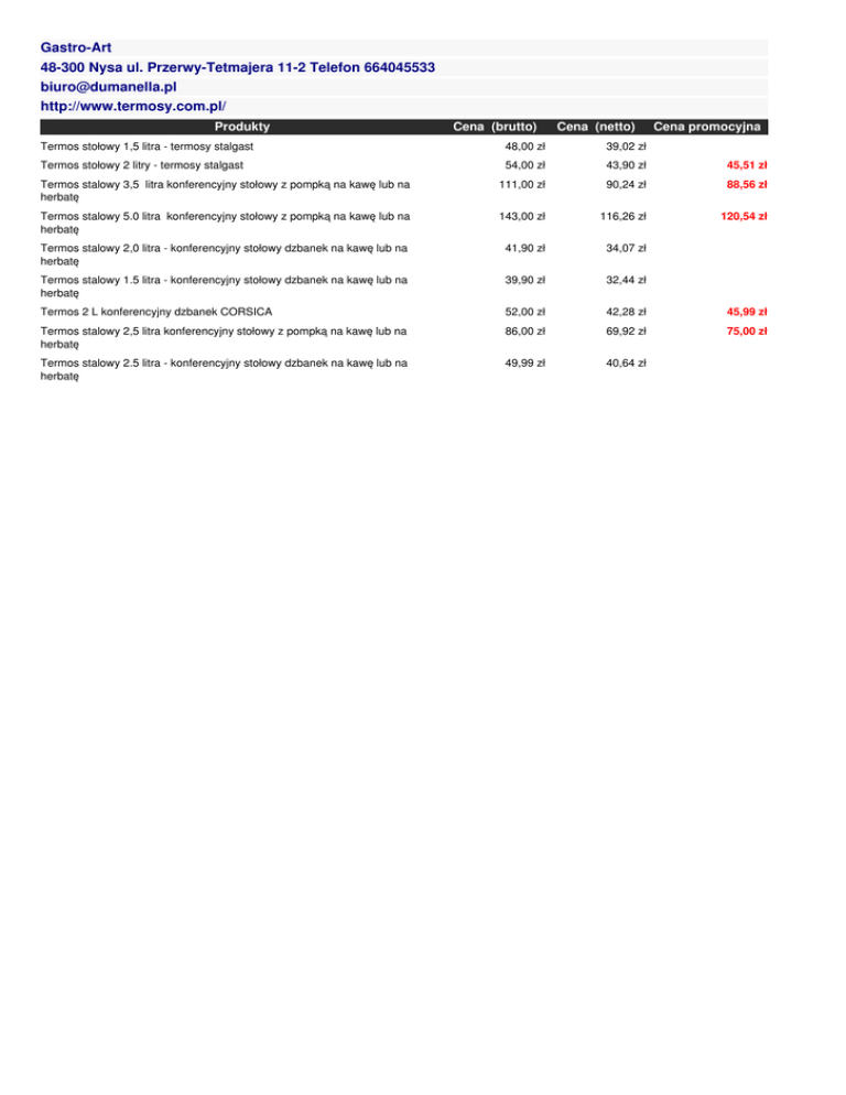 Gastro-Art 48-300 Nysa ul. Przerwy-Tetmajera 11-2 Telefon 664045533 [email protected] http://www.termosy.com.pl/ Produkty Cena (brutto) Cena (netto) Cena promocyjna Termos stołowy 1,5 litra - termosy stalgast 48,00 zł 39,02 zł Termos stołowy 2 litry - termosy stalgast 54,00 zł 43,90 zł 45,51 zł Termos stalowy 3,5 litra konferencyjny stołowy z pompką na kawę lub na herbatę 111,00 zł 90,24 zł 88,56 zł Termos stalowy 5.0 litra konferencyjny stołowy z pompką na kawę lub na herbatę 143,00 zł 116,26 zł 120,54 zł Termos stalowy 2,0 litra - konferencyjny stołowy dzbanek na kawę lub na herbatę 41,90 zł 34,07 zł Termos stalowy 1.5 litra - konferencyjny stołowy dzbanek na kawę lub na herbatę 39,90 zł 32,44 zł Termos 2 L konferencyjny dzbanek CORSICA 52,00 zł 42,28 zł 45,99 zł Termos stalowy 2,5 litra konferencyjny stołowy z pompką na kawę lub na herbatę 86,00 zł 69,92 zł 75,00 zł Termos stalowy 2.5 litra - konferencyjny stołowy dzbanek na kawę lub na herbatę 49,99 zł 40,64 zł
