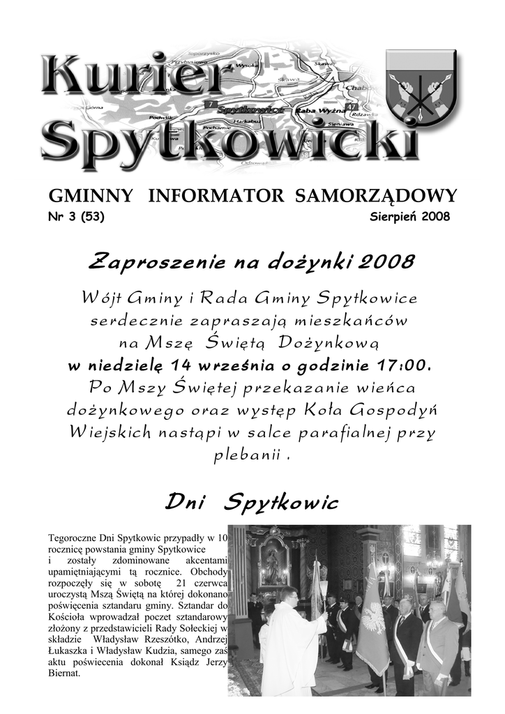 GMINNY INFORMATOR SAMORZĄDOWY Nr 3 (53) Sierpień 2008 Zaproszenie na dożynki 2008 Wójt Gminy i Rada Gminy Spytkowice serdecznie zapraszają mieszkańców na Mszę Świętą Dożynkową w niedzielę 14 września o godzinie 17:00. Po Mszy Świętej przekazanie wieńca dożynkowego oraz występ Koła Gospodyń Wiejskich nastąpi w salce parafialnej przy plebanii . Dni Spytkowic Tegoroczne Dni Spytkowic przypadły w 10 rocznicę powstania gminy Spytkowice i zostały zdominowane akcentami upamiętniającymi tą rocznice. Obchody rozpoczęły się w sobotę 21 czerwca uroczystą Mszą Świętą na której dokonano poświęcenia sztandaru gminy. Sztandar do Kościoła wprowadzał poczet sztandarowy złożony z przedstawicieli Rady Sołeckiej w składzie Władysław Rzeszótko, Andrzej Łukaszka i Władysław Kudzia, samego zaś aktu poświecenia dokonał Ksiądz Jerzy Biernat. Gminny Informator Samorządowy Nr 3 (53), sierpień 2008 Po poświęceniu nastąpił przemarsz pocztów sztandarowych przy akompaniamencie orkiestry OSP do sali w restauracji Maria Teresa gdzie po przywitaniu przez Wójta przybyłych gości wśród których byli posłowie A. Gut-Mostowy i E. Siarka nastąpiło przekazanie sztandaru Przewodniczącemu Rady Gminy a następnie Wójtowi, który przekazał go pocztowi sztandarowemu składającemu się z radnych: Marka Trybuły, Kazimierza Blańdy oraz Roberta Trybuły. Po przekazaniu sztandaru Radni złożyli uroczyste ślubowanie. Następnie przystąpiono do uroczystego wbicia gwoździ pamiątkowych do specjalnej tablicy przez osoby które przyczyniły się do wykonania sztandaru poprzez wsparcie finansowe. W dalszej części uroczystości wójt gminy Pan Franciszek Sidełko wręczył odznaczenia „Za zasługi dla Gminy Spytkowice” osobom instytucjom oraz organizacjom, które swoja działalnością przyczyniły się do powstania i rozwoju gminy oraz promują naszą gminę na zewnątrz. I tak medale pamiątkowe otrzymali: Krzysztof Bolek Józefa Cholewa Maria Faber Anna i Jacek Krakowiakowie Roman Latoń Ryszard Papanek Józef Różański Władysław Rzeszótko Edward Siarka Jan Siepak Kazimierz Surówka Marek Wierzba s. Paulina Wilkoń Lucjan Załaziński Stanisław Trybuła Kompleks „BESKID” Bank Spółdzielczy w Rabie Wyżnej Gmina Szemud Firma „KABANOS” Orkiestra OSP Firma „PANDA” Firma „PAFEX” Firma „REDOX” Skup i Sprzedaż Surowców Wtórnych oraz Odpadów Poprodukcyjnych Stefana Łukaszki Zakład Stolarski Marii i Stanisława Ziobro Zespół regionalny „Krzesani” Zrzeszenie Kaszubsko Pomorskiego Oddział Gminny w Szemudzie Po uroczystości wręczenia odznaczeń głos zabrali zaproszeni goście, składając władzom gminy i jej mieszkańcom gratulacje z okazji jubileuszu 10-lecia oraz nadania sztandaru. Głos zabrali min. przedstawiciele zaprzyjaźnionej gminy Szemud, Krzysztof Faber, Roman Latoń, Edward Siarka a na zakończenie tej części uroczystości wystąpił z krótkim okolicznościowym programem kabaret „Truteń”. Niedzielna część obchodów Dni Spytkowic rozpoczęła się od przemówienia Wójta i prezentacji sztandaru gminy przez poczet sztandarowy, następnie wystąpiła orkiestra OSP pod dyrekcją kapelmistrza Jacka Klinowskiego. Po koncercie nastąpiło wręczenie statuetki „ Zasłużony dla Spytkowic” Panu Stanisławowi Kracikowi, która została Mu przyznana za jego wkład i zaangażowanie przy reaktywowaniu gminy oraz za całokształt jego działalności promującej Spytkowice. Po wręczeniu statuetki i okolicznościowych przemówieniach nastąpiła część artystyczna w której wystąpiły dzieci i młodzież, Koło Gospodyń Wiejskich oraz Góralski zespół regionalny „Krzesani”z okolicznościowymi programami. Po zakończeniu części artystycznej mieszkańcy bawili się przy muzyce zespołu „Biesiada”. 2 Gminny Informator Samorządowy Nr 3 (53),sierpień 2008 Tradycyjnie już Dni Spytkowic posiadały również akcenty sportowe, i tak w sobotę rozegrano zawody rowerowe o Puchar Wójta, których wyniki przedstawiają się następująco: Kategoria do 6 lat Kategoria 7-8 lat 1.Bartłomiej Jażdrzewski 1.Hubert Borzęcki 1.Patrycja Paff 2.Piotr Skawiniak 3.Bartłomiej Trzop Kategoria 9-10 lat Kategoria 11-12 lat 1. Szymon Domalik 1.Klaudia Paff 1.Mateusz Pluta 1.Gabriela Komperda 2.Przemysław Paff 2.Izabela Czerniawska 2.Krystian Wojtasiak 3.Atrur Żądło Kategoria GIMNAZJUM 1,2,3 Kategoria 17-35 lat 1.Dominik Czerniawski 1.Aleksandra Pluta 1.Tomasz Mach 1.Anna Trybuła 2.Tomasz Skawiniak 1.Justyna Trybuła 2.Mateusz Czerniawski 3.Bartłomiej Domalik 3.Dawid Czerniawski Kategoria 36-100 lat 1.Jan Trybuła 1.Agata Czerniawska 2.Stanisław Trybuła 2.Zofia Gwiazdoń 3.Wiesław Czerniawski Podczas tych zawodów rozegrano również pierwsze wyścigi rowerów górskich w strojach regionalnych w których laureatami zostali: Kategoria 2-8 lat Kategoria 9-12 lat 1.Piotr Skawiniak 1.Patrycja Paff 1.Mateusz Pluta 1.Gabriela Komperda 2.Bartłomiej Trzop 2.Patryk Borzęcki Kategoria 13-30 lat 1.Szczepan Sutor 2.Tomasz Skawiniak 3.Marcin Trzop 4.Krzysztof Kosek 5.Szymon Trybuła 6.Bartłomiej Trybuła 1.Anna Trybuła 2.Aleksandra Pluta 3.Monika Trzop 3. Justyna Trybuła Kategoria 30-100 lat 1.Stanisław Trybuła 2.Stanisław Sutor 3.Józef Łukaszka 4.Wiesław Czerniawski 1.Anna Trzop 2.Zofia Gwiazdoń JAZDA NA JEDNYM KOLE 1.Bartłomiej Trybuła 1.Aleksandra Pluta 2.Szymon Trybuła 3.Marcin Trzop 4.Adrian Rzeszótko 5.Michał Żołnierczyk 6.Grzegorz Lubiński W niedzielę 22.06.br odbył się turniej piłki siatkowej o Puchar Wójta z okazji 10-lecia gminy w którym udział wzięły cztery zespoły, które zajęły następujące miejsca: 1.Podwilk 2.Raba Wyżna 3.Spytkowice I 4.Spytkowice UG Julian Obara, Stanisław Trybuła 3 Gminny Informator Samorządowy Nr 3 (53), sierpień 2008 Międzygminne zawody sportowo - pożarnicze W niedziele 17 sierpnia br, odbyły się coroczne międzygminne Zawody Sportowo Pożarnicz