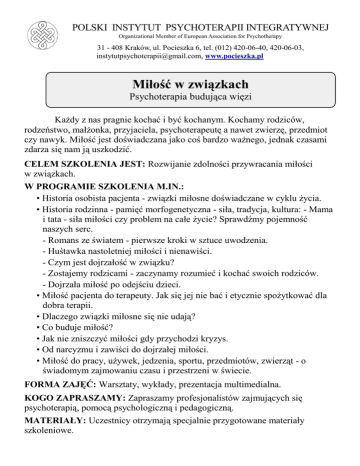 POLSKI INSTYTUT PSYCHOTERAPII INTEGRATYWNEJ Organizational Member of European Association for Psychotherapy 31 - 408 Kraków, ul. Pocieszka 6, tel. (012) 420-06-40, 420-06-03, [email protected], www.pocieszka.pl Miłość w związkach Psychoterapia budująca więzi Każdy z nas pragnie kochać i być kochanym. Kochamy rodziców, rodzeństwo, małżonka, przyjaciela, psychoterapeutę a nawet zwierzę, przedmiot czy nawyk. Miłość jest doświadczana jako coś bardzo ważnego, jednak czasami zdarza się nam ją uszkodzić. CELEM SZKOLENIA JEST: Rozwijanie zdolności przywracania miłości w związkach. W PROGRAMIE SZKOLENIA M.IN.: • Historia osobista pacjenta - związki miłosne doświadczane w cyklu życia. • Historia rodzinna - pamięć morfogenetyczna - siła, tradycja, kultura: - Mama i tata - siła miłości czy problem na całe życie? Sprawdźmy pojemność naszych serc. - Romans ze światem - pierwsze kroki w sztuce uwodzenia. - Huśtawka nastoletniej miłości i nienawiści. - Czym jest dojrzałość w związku? - Zostajemy rodzicami - zaczynamy rozumieć i kochać swoich rodziców. - Dojrzała miłość po odejściu dzieci. • Miłość pacjenta do terapeuty. Jak się jej nie bać i etycznie spożytkować dla dobra terapii. • Dlaczego związki miłosne się nie udają? • Co buduje miłość? • Jak nie zniszczyć miłości gdy przychodzi kryzys. • Od narcyzmu i zawiści do dojrzałej miłości. • Miłość do pracy, używek, jedzenia, sportu, przedmiotów, zwierząt - o świadomym zajmowaniu czasu i przestrzeni w świecie. FORMA ZAJĘĆ: Warsztaty, wykłady, prezentacja multimedialna. KOGO ZAPRASZAMY: Zapraszamy profesjonalistów zajmujących się psychoterapią, pomocą psychologiczną i pedagogiczną. MATERIAŁY: Uczestnicy otrzymają specjalnie przygotowane materiały szkoleniowe. 27- 29 czerwca 2014 (weekend. 23 godziny akademickie) JAK SIĘ ZAPISAĆ: KOSZT SZKOLENIA: A. Przez stronę www.pocieszka.pl • płatne w ratach, łącznie: 500 zł 1. Wypełnij formularz zgłoszeniowy. 2. Wpłać zadatek wysokości 150 zł na konto. 3. Prześlemy potwierdzenie i inne informacje na adres e-mail. 150 zł - zadatek do 27.05.2014 350 zł - do 27.06.2014 (można zapłacić na zajęciach) • lub wczesna wpłata ze zniżką: 400 zł - płatne do 28.04.2014 B. Telefonicznie 1. Wpłać zadatek. 2. Zadzwoń do Instytutu. Podaj swoje dane kontaktowe, wykształcenie oraz nazwę szkolenia. Z uwagi na ograniczoną ilość miejsc decyduje kolejność wpłat. WPŁATY NA KONTO: Polski Instytut Psychoterapii Integratywnej (z dopiskiem: „Związki miłosne") ING Bank Śląski 68 1050 1445 1000 0023 1942 2081 INFORMACJE I ZGŁOSZENIA: TEL. (012) 420-06-40, 698-905-204 [email protected], www.pocieszka.pl PROWADZENIE ZAJĘĆ: lek. med. DAGMARA KUCZYŃSKA-GINKO — lekarz, psychoterapeuta certyfikowany przez Polskie Towarzystwo Psychoterapii Integratywnej i European Association for Psychotherapy (EAP). Superwizor Certyfikowany przez Polską Federację Psychoterapii. Absolwent Studium Psychoterapii Polskiego Instytutu Psychoterapii Integratywnej. Twórca autorskich programów szkoleniowych. Specjalizuje się w leczeniu zaburzeń jedzenia. Poetka i artysta-grafik. Prowadzi prywatną praktykę. mgr ANNA BIESIADA — certyfikowany psychoterapeuta Polskiego Towarzystwa Psychoterapii Integratywnej oraz European Association for Psychotherapy. Superwizor Certyfikowany przez Polską Federację Psychoterapii. Absolwentka Studium Psychoterapii w Instytucie. Stały współpracownik Instytutu, nauczyciel i koordynator programów szkoleniowych. Pracuje w Szpitalu MSW – PZP. Specjalizuje się w psychoterapii zaburzeń osobowości. Prowadzi prywatną praktykę.