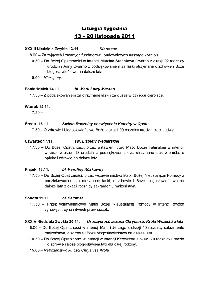 Liturgia tygodnia 13 – 20 listopada 2011 XXXIII Niedziela Zwykła 13.11. Kiermasz 8.00 – Za żyjących i zmarłych fundatorów i budowniczych naszego kościoła. 10.30 – Do Bożej Opatrzności w intencji Marcina Stanisława Cwarno z okazji 92 rocznicy urodzin i Anny Cwarno z podziękowaniem za łaski otrzymane o zdrowie i Boże błogosławieństwo na dalsze lata. 15.00 – Nieszpory. Poniedziałek 14.11. bł. Marii Luizy Merkert 17.30 – Z podziękowaniem za otrzymane łaski i za dusze w czyśćcu cierpiące. Wtorek 15.11. 17.30 – Środa 16.11. Święto Rocznicy poświęcenia Katedry w Opolu 17.30 – O zdrowie i błogosławieństwo Boże z okazji 90 rocznicy urodzin cioci Jadwigi. Czwartek 17.11. św. Elżbiety Węgierskiej 17.30 – Do Bożej Opatrzności, przez wstawiennictwo Matki Bożej Fatimskiej w intencji wnuczki z okazji 18 urodzin, z podziękowaniem za otrzymane łaski z prośbą o opiekę i zdrowie na dalsze lata. Piątek 18.11. bł. Karoliny Kózkówny 17.30 – Do Bożej Opatrzności, przez wstawiennictwo Matki Bożej Nieustającej Pomocy z podziękowaniem za otrzymane łaski, o zdrowie i Boże błogosławieństwo na dalsze lata z okazji rocznicy sakramentu małżeństwa. Sobota 19.11. bł. Salomei 17.30 – Przez wstawiennictwo Matki Bożej Nieustającej Pomocy w intencji dwóch synowych, syna i dwóch prawnuczek. XXXIV Niedziela Zwykła 20.11. Uroczystość Jezusa Chrystusa, Króla Wszechświata 8.00 – Do Bożej Opatrzności w intencji Marii i Jerzego z okazji 40 rocznicy sakramentu małżeństwa, o zdrowie i Boże błogosławieństwo na dalsze lata. 10.30 – Do Bożej Opatrzności w intencji w intencji Krzysztofa z okazji 70 rocznicy urodzin o zdrowie i Boże błogosławieństwo dla całej rodziny. 15.00 – Nabożeństwo ku czci Chrystusa Króla. Informacje duszpasterskie 1. Do puszek przed kościołem można złożyć ofiary z okazji Dnia Solidarności z Kościołem Prześladowanym. 2. Na godzinę 15 zapraszam dzisiaj na uroczyste nieszpory. 3. W tygodniu Msze św. o godz. 17.30. Od 17.00 okazja do spowiedzi. 4. W środę przypada rocznica poświęcenia katedry w Opolu. Zachęcam do modlitwy w tym dniu w intencji naszej diecezji i ks. bp Andrzeja. 5. W piątek Msza św. szkolna. Zapraszam dzieci i młodzież. Z kazanie św. Cezarego z Arles, biskupa Chrystus przyszedł i wyrzucił szatana z naszych serc, aby przygotować w nas świątynię dla siebie. Ile tylko potrafimy, starajmy się z Jego pomocą tak postępować, aby z powodu złych czynów świątynia ta nie doznała szkody. Kto bowiem źle postępuje, wyrządza krzywdę Chrystusowi. A zatem jak już powiedziałem, zanim Chrystus nas odkupił, byliśmy mieszkaniem szatana; potem dostąpiliśmy łaski, aby stać się mieszkaniem Boga; Bóg bowiem zechciał uczynić w nas mieszkanie dla siebie. Toteż, najmilsi, jeśli chcemy obchodzić w radości rocznicę poświęcenia świątyni, nie wolno nam złymi czynami rujnować w sobie żywych świątyń Bożych. Powiem tak, aby wszyscy mogli zrozumieć: Jakim chcemy oglądać kościół, ilekroć doń przychodzimy, tak też powinniśmy przygotować nasze dusze. Chcesz, aby bazylika była piękna? Nie zaśmiecaj swej duszy brudem grzechów. Jeśli chcesz, aby bazylika lśniła blaskiem, pamiętaj, że i Bóg pragnie, aby twa dusza nie była mroczna. Niechaj - jak mówi Pan - tak świeci w was światło dobrych czynów, aby uwielbiony był Ten, który jest w niebie. Podobnie jak ty wchodzisz do tego oto kościoła, tak Bóg pragnie wejść do świątyni twej duszy, zgodnie ze słowami obietnicy: "Zamieszkam i będę chodził pośród nich".