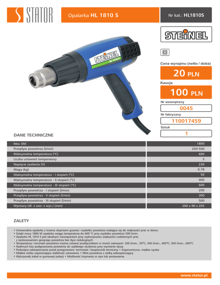 Opalarka HL 1810 S Nr kat.: HL1810S Cena wynajmu (netto / doba) 20 PLN Kaucja 100 PLN Nr wewnêtrzny 0045 Nr fabryczny 110017459 Sztuk 1 DANE TECHNICZNE 1800 Moc (W) 200-500 Przep³yw powietrza (l/min) o 600 Maksymalna temperatura ( C) 3 Liczba ustawieñ temperatury Napiêcie zasilania (V) 230 Waga (kg) 0.78 Maksymalna temperatura - I stopieñ (oC) 50 o 400 Maksymalna temperatura - II stopieñ ( C) o Maksymalna temperatura - III stopieñ ( C) 600 Przep³yw powietrza - I stopieñ (l/min) 200 Przep³yw powietrza - II stopieñ (l/min) 300 Przep³yw powietrza - III stopieñ (l/min) 500 Wymiary (d³. x szer. x wys.) (mm) 260 x 90 x 205 ZALETY • Uniwersalna opalarka z trzema stopniami grzania i wydatku powietrza nadaj¹ca siê do wiêkszoœci prac w domu • Dziêki mocy 1800 W opalarka osi¹ga temperaturê do 600 oC przy wydatku powietrza 500 l/min. • Opalarka HL 1810 S jest idealnym rozwi¹zaniem przy wykonywaniu wiêkszoœci codziennych prac z zastosowaniem gor¹cego powietrza bez dysz redukcyjnych • Temperaturê i strumieñ powietrza mo¿na ustawiæ prze³¹cznikiem w trzech zakresach: 200 l/min., 50oC; 300 l/min., 400oC; 500 l/min., 600oC • Nadmuch bez podgrzewania powietrza do szybkiego studzenia przy wymianie dyszy • Podwójne zabezpieczenie przed przegrzaniem: termostat i bezpiecznik termiczny • Ergonomiczna, miêkka r¹czka • Miêkka nó¿ka zapewniaj¹ca stabilnoœæ ustawienia • Wlot powietrza z siatk¹ zabezpieczaj¹c¹ • Wytrzyma³y kabel w gumowej izolacji • Mo¿liwoœæ trzymania w rêce lub postawienia