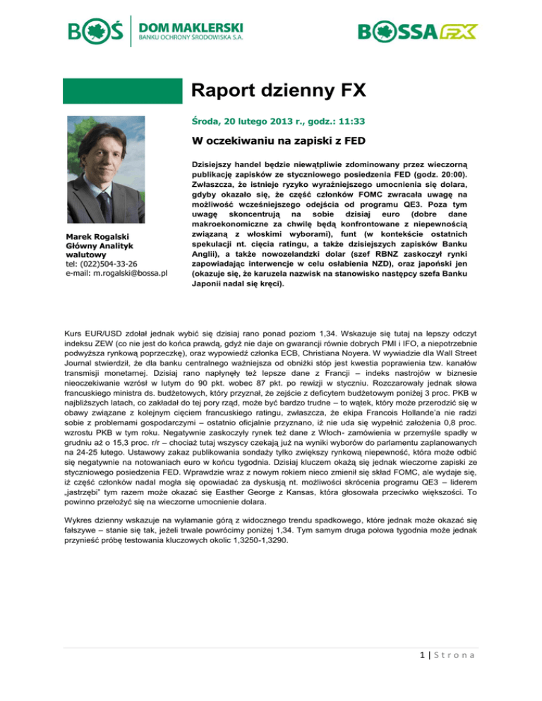 Raport dzienny FX Środa, 20 lutego 2013 r., godz.: 11:33 W oczekiwaniu na zapiski z FED Marek Rogalski GG Główny Analityk walutowy tel: (022)504-33-26 e-mail: [email protected] Dzisiejszy handel będzie niewątpliwie zdominowany przez wieczorną publikację zapisków ze styczniowego posiedzenia FED (godz. 20:00). Zwłaszcza, że istnieje ryzyko wyraźniejszego umocnienia się dolara, gdyby okazało się, że część członków FOMC zwracała uwagę na możliwość wcześniejszego odejścia od programu QE3. Poza tym uwagę skoncentrują na sobie dzisiaj euro (dobre dane makroekonomiczne za chwilę będą konfrontowane z niepewnością związaną z włoskimi wyborami), funt (w kontekście ostatnich spekulacji nt. cięcia ratingu, a także dzisiejszych zapisków Banku Anglii), a także nowozelandzki dolar (szef RBNZ zaskoczył rynki zapowiadając interwencje w celu osłabienia NZD), oraz japoński jen (okazuje się, że karuzela nazwisk na stanowisko następcy szefa Banku Japonii nadal się kręci). Kurs EUR/USD zdołał jednak wybić się dzisiaj rano ponad poziom 1,34. Wskazuje się tutaj na lepszy odczyt indeksu ZEW (co nie jest do końca prawdą, gdyż nie daje on gwarancji równie dobrych PMI i IFO, a niepotrzebnie podwyższa rynkową poprzeczkę), oraz wypowiedź członka ECB, Christiana Noyera. W wywiadzie dla Wall Street Journal stwierdził, że dla banku centralnego ważniejsza od obniżki stóp jest kwestia poprawienia tzw. kanałów transmisji monetarnej. Dzisiaj rano napłynęły też lepsze dane z Francji – indeks nastrojów w biznesie nieoczekiwanie wzrósł w lutym do 90 pkt. wobec 87 pkt. po rewizji w styczniu. Rozczarowały jednak słowa francuskiego ministra ds. budżetowych, który przyznał, że zejście z deficytem budżetowym poniżej 3 proc. PKB w najbliższych latach, co zakładał do tej pory rząd, może być bardzo trudne – to wątek, który może przerodzić się w obawy związane z kolejnym cięciem francuskiego ratingu, zwłaszcza, że ekipa Francois Hollande’a nie radzi sobie z problemami gospodarczymi – ostatnio oficjalnie przyznano, iż nie uda się wypełnić założenia 0,8 proc. wzrostu PKB w tym roku. Negatywnie zaskoczyły rynek też dane z Włoch- zamówienia w przemyśle spadły w grudniu aż o 15,3 proc. r/r – chociaż tutaj wszyscy czekają już na wyniki wyborów do parlamentu zaplanowanych na 24-25 lutego. Ustawowy zakaz publikowania sondaży tylko zwiększy rynkową niepewność, która może odbić się negatywnie na notowaniach euro w końcu tygodnia. Dzisiaj kluczem okażą się jednak wieczorne zapiski ze styczniowego posiedzenia FED. Wprawdzie wraz z nowym rokiem nieco zmienił się skład FOMC, ale wydaje się, iż część członków nadal mogła się opowiadać za dyskusją nt. możliwości skrócenia programu QE3 – liderem „jastrzębi” tym razem może okazać się Easther George z Kansas, która głosowała przeciwko większości. To powinno przełożyć się na wieczorne umocnienie dolara. Wykres dzienny wskazuje na wyłamanie górą z widocznego trendu spadkowego, które jednak może okazać się fałszywe – stanie się tak, jeżeli trwale powrócimy poniżej 1,34. Tym samym druga połowa tygodnia może jednak przynieść próbę testowania kluczowych okolic 1,3250-1,3290. 1|Strona Wykres dzienny EUR/USD Coraz gorzej wygląda sytuacja na funcie, gdzie spadki nabierają tempa. Wczoraj pojawiły się spekulacje, iż agencja S&P mogłaby zdecydować się na cięcie ratingu AAA, co nie zostało zdementowane. Pojawia się, zatem coraz więcej hipotez, iż może się to stać w końcu przyszłego miesiąca, kiedy to rząd zaprezentuje nowe założenia budżetowe (20 marca). Do tego doszły opublikowane dzisiaj zapiski z posiedzenia Banku Anglii na początku lutego. Okazuje się, że aż trzech członków BOE głosowało za zwiększeniem programu QE o 25 mld GBP (Miles, Fisher i szef BOE-King). Dyskutowano także nad możliwością podjęcia innych działań luzujących politykę pieniężną. Na wykresie GBP/USD widać, że dotarliśmy w okolice mocnej strefy wsparcia 1,5270-1,5290-1,5330, gdzie możemy zobaczyć próby powstrzymania przeceny. To może nie być jednak takie łatwe – złamanie długoterminowej linii trendu na 1,56 może skutkować ruchem poniżej 1,50 w kolejnych tygodniach. Motorem do spadków będą oczekiwania związane z możliwą obniżką ratingu w końcu marca, a także powrotem do programu QE przez Bank Anglii. 2|Strona Wykres tygodniowy GBP/USD Szef Banku Nowej Zelandii przemawiając dzisiaj w nocy wyraźnie zaskoczył inwestorów. Poparł wcześniejsze słowa ministra finansów, który przyznał, że kurs dolara nowozelandzkiego jest „przewartościowany”. Dodał, że bank centralny zamierza podjąć bardziej aktywne działania na tym polu, tak aby wysłać bardziej czytelny sygnał rynkom. W efekcie NZD/USD zamiast ruszyć na ubiegłotygodniowe szczyty na 0,8534, wyraźnie zanurkował poniżej 0,84. To wszystko daje mocne wskazania, aby sądzić, iż mieliśmy do czynienia z fałszywym wybiciem w górę, które może przełożyć się teraz na gwałtowny ruch spadkowy (według prawideł formacji 2B). Niewykluczone, że test okolic 0,8330-50 zobaczymy jeszcze dzisiaj w nocy. 3|Strona Wykres dzienny NZD/USD Z kolei na rynku jena mamy powrót spekulacji związanych z wyborem nowego szefa Banku Japonii – nominacja premiera może zapaść już na początku przyszłego tygodnia. O ile wczoraj wydawało się dość prawdopodobne, iż następcą Shirikawy zostanie nieco konserwatywny Muto, to nieoficjalna krótka lista czterech kandydatur, która pojawiła się dzisiaj nie bierze go już pod uwagę. To osłabiło jena (gdyż nowy szef BOJ może być jednak bardziej gołębi), ale na krótko. Inwestorzy nie zapomnieli ostatnich słów przedstawicieli rządu, którzy wykluczyli możliwość skupowania zagranicznego długu przez BOJ, co byłoby ukłonem w stronę jeszcze bardziej liberalnej polity