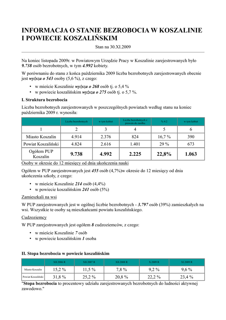 INFORMACJA O STANIE BEZROBOCIA W KOSZALINIE I POWIECIE KOSZALIŃSKIM Stan na 30.XI.2009 Na koniec listopada 2009r. w Powiatowym Urzędzie Pracy w Koszalinie zarejestrowanych było 9.738 osób bezrobotnych, w tym 4.992 kobiety. W porównaniu do stanu z końca października 2009 liczba bezrobotnych zarejestrowanych obecnie jest wyższa o 543 osoby (5,6 %), z czego: • w mieście Koszalinie wyższa o 268 osób tj. o 5,4 % • w powiecie koszalińskim wyższa o 275 osób tj. o 5,7 %. I. Struktura bezrobocia Liczba bezrobotnych zarejestrowanych w poszczególnych powiatach według stanu na koniec października 2009 r. wynosiła: Liczba bezrobotnych w tym kobiet Liczba bezrobotnych z prawem do zasiłku % 4:2 w tym kobiet 1 2 3 4 5 6 Miasto Koszalin 4.914 2.376 824 16,7 % 390 Powiat Koszaliński 4.824 2.616 1.401 29 % 673 22,8% 1.063 Ogółem PUP 9.738 4.992 2.225 Koszalin Osoby w okresie do 12 miesięcy od dnia ukończenia nauki Ogółem w PUP zarejestrowanych jest 455 osób (4,7%)w okresie do 12 miesięcy od dnia ukończenia szkoły, z czego: • w mieście Koszalinie 214 osób (4,4%) • w powiecie koszalińskim 241 osób (5%) Zamieszkali na wsi W PUP zarejestrowanych jest w ogólnej liczbie bezrobotnych - 3.797 osób (39%) zamieszkałych na wsi. Wszystkie te osoby są mieszkańcami powiatu koszalińskiego. Cudzoziemcy W PUP zarejestrowanych jest ogółem 8 cudzoziemców, z czego: • w mieście Koszalinie 7 osób • w powiecie koszalińskim 1 osoba II. Stopa bezrobocia w powiecie koszalińskim Miasto Koszalin XII.2006 R XII.2007 R XII.2008 R X.2009 R XI.2009 R 15,2 % 11,5 % 7,8 % 9,2 % 9,6 % 31,8 % 25,2 % 20,8 % 22,2 % 23,4 % "Stopa bezrobocia to procentowy udziału zarejestrowanych bezrobotnych do ludności aktywnej zawodowo." Powiat Koszaliński III. Napływ do bezrobocia Od początku roku 2009 zarejestrowało się w PUP 15.516 nowych bezrobotnych, z czego: • w mieście Koszalinie 8.305 osób, • w powiecie koszalińskim 7.211 osób. IV. Odpływ z bezrobocia Od początku roku 2009 wyrejestrowano w PUP 13.883 bezrobotnych, z czego: • w mieście Koszalinie 7.271 osób • w powiecie koszalińskim 6.612 osób. V. Aktywne formy zwalczania bezrobocia Okres I-XI.2009 Wyszczególnienie PUP Koszalin Miasto Koszalin Powiat Koszaliński Prace interwencyjne 296 72 224 Roboty Publiczne 244 25 219 Podjęcia działalności gospodarczej 216 143 73 Podjęcia pracy w ramach refundacji kosztów zatrudnienia bezrobotnego 312 211 101 Rozpoczęcia szkolenia 933 602 331 Rozpoczęcia stażu 828 425 403 Rozpoczęcia przygotowania zawodowego w miejscu pracy 16 0 16 Rozpoczęcia pracy społecznie użytecznej 446 149 297 Inne 49 36 13 Razem 3.340 1.663 1.677 VI. Oferty pracy Od początku roku 2009 do PUP w Koszalinie wpłynęło 3.788 ofert pracy, z czego: • w mieście Koszalinie 2.328 ofert • w powiecie koszalińskim 1.460 ofert. VII. Osoby w szczególnej sytuacji na rynku pracy Miasto Koszalin Powiat Koszaliński Ogółem Kobiety Ogółem Kobiety Do 25 roku życia 644 345 981 501 Które ukończyły szkołę wyższą, do 27 roku życia 75 46 39 26 Długotrwale bezrobotne 2.024 1.091 2.078 1.403 Kobiety, które nie podjęły zatrudnienia po urodzeniu dziecka xx 404 xx 607 Powyżej 50 roku życia 1.546 637 1.136 497 Bez kwalifikacji zawodowych 876 467 1.259 728 Bez doświadczenia zawodowego 930 493 1.067 632 Bez wykształcenia średniego 2.725 1.118 3.551 1.785 Samotnie wychowujące co najmniej jedno dziecko do 18 roku życia 691 565 683 560 które po odbyciu kary pozbawienia wolności nie podjęły zatrudnienia 170 17 66 1 Niepełnosprawni 361 160 233 107 VIII. Liczba bezrobotnych według gmin Wyszczególnienie Liczba bezrobotnych ogółem w tym z prawem do zasiłku Razem Kobiety Razem Kobiety 4.824 2.616 1.401 673 Gmina Będzino 637 358 195 122 Gmina Biesiekierz 319 165 103 42 Miasto i Gmina BOBOLICE 941 491 291 128 POWIAT KOSZALIŃSKI w tym: gmina Bobolice 578 311 147 56 miasto Bobolice 363 180 144 72 Gmina Manowo 365 207 105 55 Gmina Mielno 262 149 69 45 Miasto i Gmina POLANÓW 930 520 256 104 z tego tym: gmina Polanów 697 399 169 62 miasto Polanów 233 121 87 42 Miasto i Gmina SIANÓW w tym: 939 492 262 120 gmina Sianów 508 271 122 53 miasto Sianów 431 221 140 67 Gmina Świeszyno 431 234 120 57 Przygotowała: Agnieszka Rećko Statystyki dla wszystkich województw można znaleźć na oficjalnej stronie www.psz.praca.gov.pl