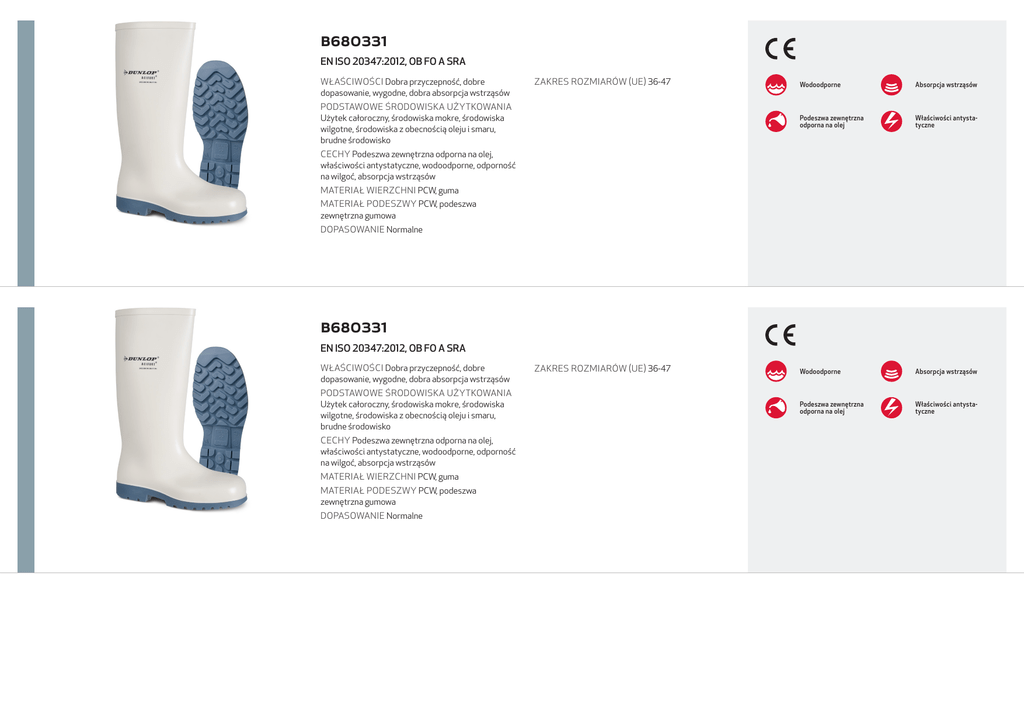 B680331 EN ISO 20347:2012, OB FO A SRA WŁAŚCIWOŚCI Dobra przyczepność, dobre dopasowanie, wygodne, dobra absorpcja wstrząsów ZAKRES ROZMIARÓW (UE) 36-47 PODSTAWOWE ŚRODOWISKA UŻYTKOWANIA Użytek całoroczny, środowiska mokre, środowiska wilgotne, środowiska z obecnością oleju i smaru, brudne środowisko Wodoodporne Absorpcja wstrząsów Podeszwa zewnętrzna odporna na olej Właściwości antystatyczne Wodoodporne Absorpcja wstrząsów Podeszwa zewnętrzna odporna na olej Właściwości antystatyczne CECHY Podeszwa zewnętrzna odporna na olej, właściwości antystatyczne, wodoodporne, odporność na wilgoć, absorpcja wstrząsów MATERIAŁ WIERZCHNI PCW, guma MATERIAŁ PODESZWY PCW, podeszwa zewnętrzna gumowa DOPASOWANIE Normalne B680331 EN ISO 20347:2012, OB FO A SRA WŁAŚCIWOŚCI Dobra przyczepność, dobre dopasowanie, wygodne, dobra absorpcja wstrząsów PODSTAWOWE ŚRODOWISKA UŻYTKOWANIA Użytek całoroczny, środowiska mokre, środowiska wilgotne, środowiska z obecnością oleju i smaru, brudne środowisko CECHY Podeszwa zewnętrzna odporna na olej, właściwości antystatyczne, wodoodporne, odporność na wilgoć, absorpcja wstrząsów MATERIAŁ WIERZCHNI PCW, guma MATERIAŁ PODESZWY PCW, podeszwa zewnętrzna gumowa DOPASOWANIE Normalne ZAKRES ROZMIARÓW (UE) 36-47