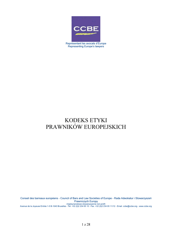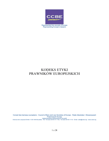 Représentant les avocats d’Europe Representing Europe’s lawyers KODEKS ETYKI PRAWNIKÓW EUROPEJSKICH Conseil des barreaux européens - Council of Bars and Law Societies of Europe - Rada Adwokatur i Stowarzyszeń Prawniczych Europy międzynarodowe stowarzyszenie non-profit Avenue de la Joyeuse Entrée 1-5 B-1040 Bruxelles - Tel. +32 (0)2 234 65 10 - Fax. +32 (0)2 234 65 11/12 - Email. [email protected] - www.ccbe.org 1 z 28 Niniejszy Kodeks Etyki Prawników Europejskich został pierwotnie przyjęty na Sesji Plenarnej CCBE w dniu 28 października 1988 r. Zmiany w treści dokumentu wprowadzano na Sesjach Plenarnych CCBE w dniach 28 listopada 1998 r., 6 grudnia 2002 r. oraz 19 maja 2006 r. Kodeks obejmuje Memorandum Wyjaśniające, które zostało zaktualizowane na Sesji Plenarnej CCBE w dniu 19 maja 2006 r. Redakcja: CCBE Avenue de la Joyeuse Entrée, 1-5 – B-1040 Brussels Tel.: +32 (0)2 234 65 10 - Faks: +32 (0)2 234 65 11/12 E-mail: [email protected] - http://www.ccbe.org 2 z 28 Spis treści 1. PREAMBUŁA ............................................................................................................................. 4 1.1. Rola prawnika w społeczeństwie ......................................................................................... 4 1.2. Charakter Zasad Etyki Zawodowej ...................................................................................... 4 1.3. Cel Kodeksu ......................................................................................................................... 5 1.4. Zakres stosowania ratione personae ..................................................................................... 5 1.5. Zakres stosowania ratione materiae ..................................................................................... 5 1.6. Definicje ............................................................................................................................... 6 2. ZASADY OGÓLNE .................................................................................................................... 6 2.1. Niezależność ........................................................................................................................ 6 2.2. Zaufanie i prawość osobista ................................................................................................. 7 2.3. Poufność ............................................................................................................................... 7 2.4. Poszanowanie dla zasad innych adwokatur i stowarzyszeń prawniczych ........................... 7 2.5. Zajęcia niedopuszczalne ...................................................................................................... 8 2.6. Reklama osobista ................................................................................................................. 8 2.7. Interes klienta ....................................................................................................................... 8 2.8. Ograniczenie odpowiedzialności prawnika wobec klienta .................................................. 8 3. STOSUNKI Z KLIENTAMI ....................................................................................................... 9 3.1. Przyjmowanie i anulowanie zleceń ...................................................................................... 9 3.2. Konflikt interesów................................................................................................................ 9 3.3. Pactum de quota litis .......................................................................................................... 10 3.4. Regulowanie honorariów ................................................................................................... 10 3.5. Wpłata zaliczek .................................................................................................................. 10 3.6. Udział w honorarium osób niebędących prawnikami ........................................................ 10 3.7. Koszty postępowania i dostępność pomocy prawnej z urzędu .......................................... 11 3.8. Środki klientów .................................................................................................................. 11 3.9. Ubezpieczenie odpowiedzialności zawodowej .................................................................. 12 4. STOSUNKI Z SĄDAMI ............................................................................................................ 12 4.1. Zasady właściwego postępowania w sądzie ...................................................................... 12 4.2. Uczciwe prowadzenie postępowania ................................................................................. 12 4.3. Zachowanie przed sądem ................................................................................................... 12 4.4. Informacje nieprawdziwe lub wprowadzające w błąd ....................................................... 12 4.5. Rozszerzenie na arbitrów itp. ............................................................................................. 12 5. STOSUNKI MIĘDZY PRAWNIKAMI .................................................................................... 12 5.1. Poczucie wspólnoty zawodowej ........................................................................................ 12 5.2. Współpraca między prawnikami z różnych Państw Członkowskich................................. 13 5.3. Korespondencja między prawnikami ................................................................................. 13 5.4. Opłaty za polecenie ............................................................................................................ 13 5.5. Kontakty ze stroną przeciwną ............................................................................................ 13 5.6. (Skreślono decyzją Sesji Plenarnej w Dubl
