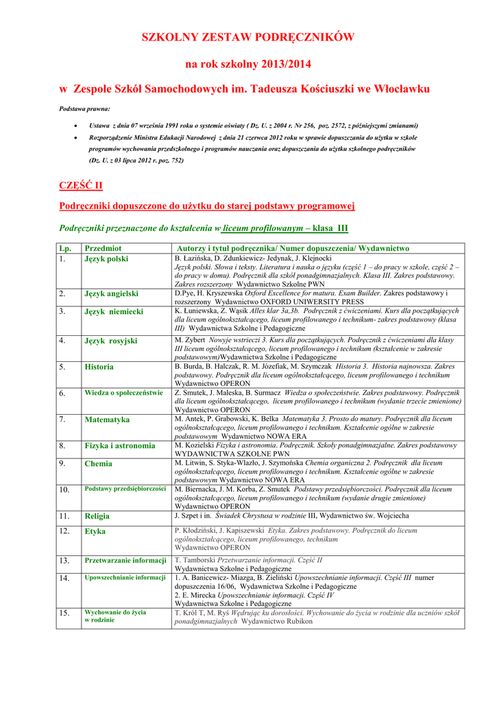 SZKOLNY ZESTAW PODRĘCZNIKÓW na rok szkolny 2013/2014 w Zespole Szkół Samochodowych im. Tadeusza Kościuszki we Włocławku Podstawa prawna: Ustawa z dnia 07 września 1991 roku o systemie oświaty ( Dz. U. z 2004 r. Nr 256, poz. 2572, z późniejszymi zmianami) Rozporządzenie Ministra Edukacji Narodowej z dnia 21 czerwca 2012 roku w sprawie dopuszczania do użytku w szkole programów wychowania przedszkolnego i programów nauczania oraz dopuszczania do użytku szkolnego podręczników (Dz. U. z 03 lipca 2012 r. poz. 752) CZĘŚĆ II Podręczniki dopuszczone do użytku do starej podstawy programowej Podręczniki przeznaczone do kształcenia w liceum profilowanym – klasa III Autorzy i tytuł podręcznika/ Numer dopuszczenia/ Wydawnictwo Lp. 1. Przedmiot Język polski 2. Język angielski 3. Język niemiecki 4. Język rosyjski 5. Historia 6. Wiedza o społeczeństwie 7. Matematyka 8. Fizyka i astronomia 9. Chemia 10. Podstawy przedsiębiorczości 11. Religia 12. Etyka P. Kłodziński, J. Kapiszewski Etyka. Zakres podstawowy. Podręcznik do liceum ogólnokształcącego, liceum profilowanego, technikum Wydawnictwo OPERON 13. Przetwarzanie informacji 14. Upowszechnianie informacji 15. Wychowanie do życia w rodzinie T. Tamborski Przetwarzanie informacji. Część II Wydawnictwa Szkolne i Pedagogiczne 1. A. Banicewicz- Miazga, B. Zieliński Upowszechnianie informacji. Część III numer dopuszczenia 16/06, Wydawnictwa Szkolne i Pedagogiczne 2. E. Mirecka Upowszechnianie informacji. Część IV Wydawnictwa Szkolne i Pedagogiczne T. Król T, M. Ryś Wędrując ku dorosłości. Wychowanie do życia w rodzinie dla uczniów szkół ponadgimnazjalnych Wydawnictwo Rubikon B. Łazińska, D. Zdunkiewicz- Jedynak, J. Klejnocki Język polski. Słowa i teksty. Literatura i nauka o języku (część 1 – do pracy w szkole, część 2 – do pracy w domu). Podręcznik dla szkół ponadgimnazjalnych. Klasa III. Zakres podstawowy. Zakres rozszerzony Wydawnictwo Szkolne PWN D.Pye, H. Kryszewska Oxford Excellence for matura. Exam Builder. Zakres podstawowy i rozszerzony Wydawnictwo OXFORD UNIWERSITY PRESS K. Łuniewska, Z. Wąsik Alles klar 3a,3b. Podręcznik z ćwiczeniami. Kurs dla początkujących dla liceum ogólnokształcącego, liceum profilowanego i technikum- zakres podstawowy (klasa III) Wydawnictwa Szkolne i Pedagogiczne M. Zybert Nowyje wstrieczi 3. Kurs dla początkujących. Podręcznik z ćwiczeniami dla klasy III liceum ogólnokształcącego, liceum profilowanego i technikum (kształcenie w zakresie podstawowym)Wydawnictwa Szkolne i Pedagogiczne B. Burda, B. Halczak, R. M. Józefiak, M. Szymczak Historia 3. Historia najnowsza. Zakres podstawowy. Podręcznik dla liceum ogólnokształcącego, liceum profilowanego i technikum Wydawnictwo OPERON Z. Smutek, J. Maleska, B. Surmacz Wiedza o społeczeństwie. Zakres podstawowy. Podręcznik dla liceum ogólnokształcącego, liceum profilowanego i technikum (wydanie trzecie zmienione) Wydawnictwo OPERON M. Antek, P. Grabowski, K. Belka Matematyka 3. Prosto do matury. Podręcznik dla liceum ogólnokształcącego, liceum profilowanego i technikum. Kształcenie ogólne w zakresie podstawowym Wydawnictwo NOWA ERA M. Kozielski Fizyka i astronomia. Podręcznik. Szkoły ponadgimnazjalne. Zakres podstawowy WYDAWNICTWA SZKOLNE PWN M. Litwin, S. Styka-Wlazło, J. Szymońska Chemia organiczna 2. Podręcznik dla liceum ogólnokształcącego, liceum profilowanego i technikum. Kształcenie ogólne w zakresie podstawowym Wydawnictwo NOWA ERA M. Biernacka, J. M. Korba, Z. Smutek Podstawy przedsiębiorczości. Podręcznik dla liceum ogólnokształcącego, liceum profilowanego i technikum (wydanie drugie zmienione) Wydawnictwo OPERON J. Szpet i in. Świadek Chrystusa w rodzinie III, Wydawnictwo św. Wojciecha Podręczniki przeznaczone do kształcenia w technikum- klasa III, klasa IV Przedmiot Autorzy i tytuł podręcznika/ Numer dopuszczenia/ Wydawnictwo 1. Język polski 2. Język angielski Klasa III B. Łazińska, D. Zdunkiewicz- Jedynak, J. Klejnocki Język polski. Słowa i teksty. Literatura i nauka o języku (część 1 – do pracy w szkole, część 2 – do pracy w domu). Podręcznik dla szkół ponadgimnazjalnych. Klasa II. Zakres podstawowy. Zakres rozszerzony Wydawnictwo Szkolne PWN Klasa IV B. Łazińska, D. Zdunkiewicz- Jedynak, J. Klejnocki Język polski. Słowa i teksty. Literatura i nauka o języku (część 1 – do pracy w szkole, część 2 – do pracy w domu). Podręcznik dla szkół ponadgimnazjalnych. Klasa III. Zakres podstawowy. Zakres rozszerzony Wydawnictwo Szkolne PWN Klasa III i IV D. Pye, H. Kryszewska Oxford Excellence for matura. Exam Builder. Zakres Lp. podstawowy i rozszerzony Wydawnictwo OXFORD UNIWERSITY PRESS Klasa III K. Łuniewska, Z. Wąsik, U. Tworek Alles klar 2b. Podręcznik z ćwiczeniami. Kurs dla początkujących dla liceum ogólnokształcącego, liceum profilowanego i technikum- zakres podstawowy (klasa II) Wydawnictwa Szkolne i Pedagogiczne Klasa IV K. Łuniewska, Z. Wąsik Alles klar 3a,3b. Podręcznik z ćwiczeniami. Kurs dla początkujących dla liceum ogólnokształcącego, liceum profilowanego i technikum- zakres podstawowy (klasa III) Wydawnictwa Szkolne i Pedagogiczne Klasa III M. Zybert Nowyje wstrieczi 2. Kurs dla początkujących. Podręcznik dla klasy II liceum ogólnokształcącego, liceum profilowanego i technikum (kształcenie w zakresie podstawowym) Wydawnictwa Szkolne i Pedagogiczne Klasa IV M. Zybert Nowyje wstrieczi 3. Kurs dla początkujących. Podręcznik z ćwiczeniami dla klasy III liceum ogólnokształcącego, liceum profilowanego i technikum (kształcenie w zakresie podstawowym) Wydawnictwa Szkolne i Pedagogiczne Klasa III B. Burda, B. Halczak, R. M. Józefiak, A. Roszak, M. Szymczak Historia 2. Czasy nowożytne. Zakres podstawowy. Podręcznik dla liceum ogólnokształcącego, liceum profilowanego i technikum Wydawnictwo OPERON Klasa III i IV B. Burda, B. Halczak, R. M. Józefiak, A. Roszak, M. Szym