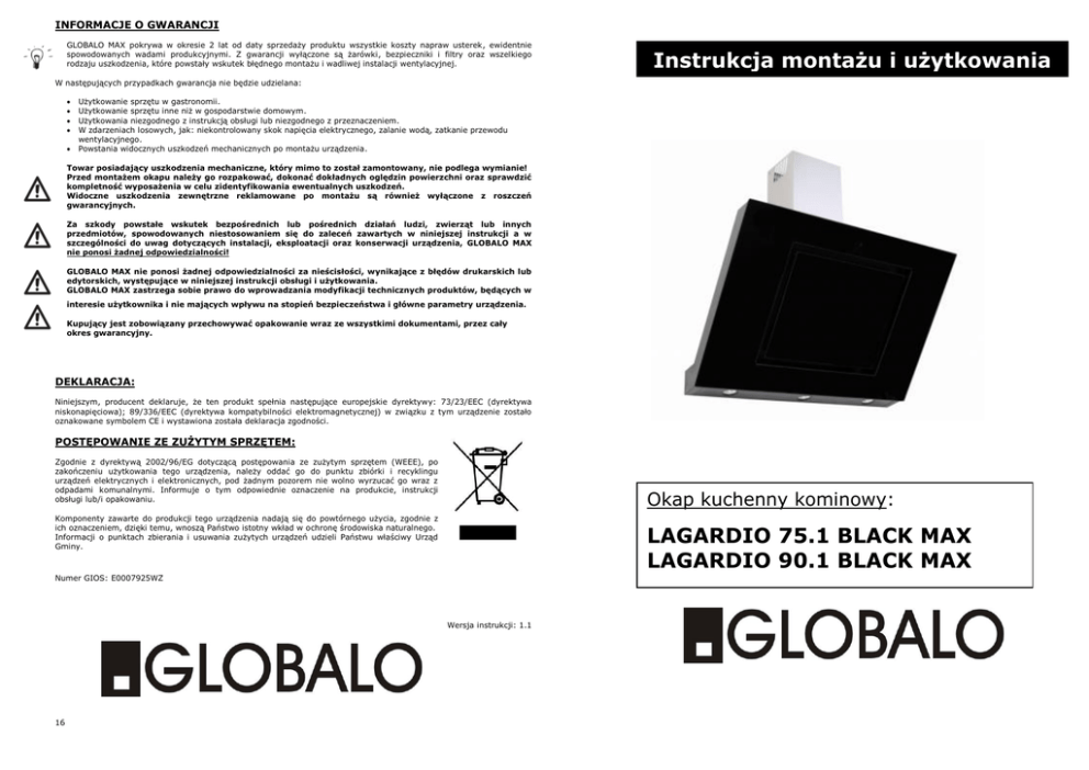 INFORMACJE O GWARANCJI GLOBALO MAX pokrywa w okresie 2 lat od daty sprzedaży produktu wszystkie koszty napraw usterek, ewidentnie spowodowanych wadami produkcyjnymi. Z gwarancji wyłączone są żarówki, bezpieczniki i filtry oraz wszelkiego rodzaju uszkodzenia, które powstały wskutek błędnego montażu i wadliwej instalacji wentylacyjnej. Instrukcja montażu i użytkowania W następujących przypadkach gwarancja nie będzie udzielana: Użytkowanie sprzętu w gastronomii. Użytkowanie sprzętu inne niż w gospodarstwie domowym. Użytkowania niezgodnego z instrukcją obsługi lub niezgodnego z przeznaczeniem. W zdarzeniach losowych, jak: niekontrolowany skok napięcia elektrycznego, zalanie wodą, zatkanie przewodu wentylacyjnego. Powstania widocznych uszkodzeń mechanicznych po montażu urządzenia. Towar posiadający uszkodzenia mechaniczne, który mimo to został zamontowany, nie podlega wymianie! Przed montażem okapu należy go rozpakować, dokonać dokładnych oględzin powierzchni oraz sprawdzić kompletność wyposażenia w celu zidentyfikowania ewentualnych uszkodzeń. Widoczne uszkodzenia zewnętrzne reklamowane po montażu są również wyłączone z roszczeń gwarancyjnych. Za szkody powstałe wskutek bezpośrednich lub pośrednich działań ludzi, zwierząt lub innych przedmiotów, spowodowanych niestosowaniem się do zaleceń zawartych w niniejszej instrukcji a w szczególności do uwag dotyczących instalacji, eksploatacji oraz konserwacji urządzenia, GLOBALO MAX nie ponosi żadnej odpowiedzialności! GLOBALO MAX nie ponosi żadnej odpowiedzialności za nieścisłości, wynikające z błędów drukarskich lub edytorskich, występujące w niniejszej instrukcji obsługi i użytkowania. GLOBALO MAX zastrzega sobie prawo do wprowadzania modyfikacji technicznych produktów, będących w interesie użytkownika i nie mających wpływu na stopień bezpieczeństwa i główne parametry urządzenia. Kupujący jest zobowiązany przechowywać opakowanie wraz ze wszystkimi dokumentami, przez cały okres gwarancyjny. DEKLARACJA: Niniejszym, producent deklaruje, że ten produkt spełnia następujące europejskie dyrektywy: 73/23/EEC (dyrektywa niskonapięciowa); 89/336/EEC (dyrektywa kompatybilności elektromagnetycznej) w związku z tym urządzenie zostało oznakowane symbolem CE i wystawiona została deklaracja zgodności. POSTĘPOWANIE ZE ZUŻYTYM SPRZĘTEM: Zgodnie z dyrektywą 2002/96/EG dotyczącą postępowania ze zużytym sprzętem (WEEE), po zakończeniu użytkowania tego urządzenia, należy oddać go do punktu zbiórki i recyklingu urządzeń elektrycznych i elektronicznych, pod żadnym pozorem nie wolno wyrzucać go wraz z odpadami komunalnymi. Informuje o tym odpowiednie oznaczenie na produkcie, instrukcji obsługi lub/i opakowaniu. Okap kuchenny kominowy: Komponenty zawarte do produkcji tego urządzenia nadają się do powtórnego użycia, zgodnie z ich oznaczeniem, dzięki temu, wnoszą Państwo istotny wkład w ochronę środowiska naturalnego. Informacji o punktach zbierania i usuwania zużytych urządzeń udzieli Państwu właściwy Urząd Gminy. LAGARDIO 75.1 BLACK MAX LAGARDIO 90.1 BLACK MAX Numer GIOS: E0007925WZ Wersja instrukcji: 1.1 16 Spis treści Wymiary i dane techniczne: Serwis 4 Ilustracja urządzenia Wskazania bezpieczeństwa 5 5 Obsługa okapu Panel obsługi Jaki stopień wydajności należy wybrać? Sterowanie elektroniczne dotykowe-obsługa Włączanie i wyłączanie silnika okapu Regulacja prędkości Włączanie i wyłączanie oświetlenia 6 6 6 6 6 6 6 Konserwacja i czyszczenie Okresy międzykonserwacyjne Czyszczenie okapu Czyszczenie metalowego filtra tłuszczowego 7 7 7 7 Wymiana filtra z węglem aktywnym Wymiana lampy halogenowej 8 8 Jak radzić sobie z problemami w eksploatacji ? Okap w ogóle nie funkcjonuje Wydajność jest niewystarczająca 9 9 9 Podwyższony szum eksploatacyjny Jedna lampa halogenowa nie działa Wszystkie lampy halogenowe nie działają 9 9 9 Tryb pracy z wyciągiem lub z wewnętrznym obiegiem powietrza 10 Wskazówki dla poprawnej instalacji okapu Przyłącze elektryczne 11 11 Zestawienie dostarczonych części 12 Montaż ścienny 13 Montaż przewodu odprowadzającego Wykonanie przyłącza sieciowego Montaż maskownicy Uruchomienie 14 14 14 14 Wymiary i dane techniczne 15 Częstotliwość: 50 Hz Informacje o gwarancji Deklaracja Postępowanie ze zużytym sprzętem 16 16 16 Moc silnika: 200 W Ilość stopni prędkości 4 Oświetlenie: (Żarówka diodowa ) 3 x 35 W Moc maksymalna: 305 W Klasa bezpieczeństwa: I Wydajność: 820 m3/h* Napięcie: 220 – 240 V Średnica wylotu: Ø 150 mm + redukcja Ø 120 mm *Błędne podłączenie przewodu wentylacyjnego powoduje spadek wydajności urządzenia, każde załamanie rury o 90 stopni powoduje spadek wydajności o około 10%. Każdy dodatkowy metr rury lub płaskiego kanału powoduje spadek wydajności o kolejne 5%. Zredukowanie średnicy przewodu poprzez redukcję pola przekroju poprzecznego - powoduje spadek wydajności urządzenia. Aby zachować fabryczne parametry urządzenia, należy tak planować montaż aby nie zmniejszać pola powierzchni wylotu turbiny okapu. Zamontowanie filtra węglowego w okapie obniża jego wydajność o około 25-30%. Każde stłumienie pracy silnika, spowoduje jego przyśpieszenie oraz zwiększenie głośności pracy! W ekstremalnych przypadkach, przy długotrwałej pracy na najwyższym stopniu prędkości i przy znacznie stłumionym ciągu, może doprowadzić nawet do spalenia silnika elektrycznego okapu. 2 15 Montaż przewodu odprowadzającego (tylko w wyciągowym trybie pracy) Szanowni Klienci, Do połączenia z otworem wentylacyjnym w ścianie, należy zastosować rurę z tworzywa sztucznego lub giętki przewód odprowadzający średnicy Ø 150 mm (min. 120 mm) (nie znajduje się w zestawie). Gratulujemy Państwu dokonania trafnego wyboru i życzymy wiele satysfakcji w eksploatacji nowego okapu. Nasze urządzenia prezentują nie tylko dojrzałą t