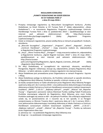 REGULAMIN KONKURSU „PUNKTY DODATKOWE NA DZIEŃ DZIECKA W CH TURAWA PARK 2” z dnia 25 maja 2016 r. 1. Przepisy niniejszego regulaminu są Warunkami Szczególnymi konkursu „Punkty Dodatkowe na Dzień Dziecka w CH Turawa Park 2” (dalej odpowiednio: „Akcja Dodatkowa”) – w rozumieniu Regulaminu Programu Lojalnościowego Centrum Handlowego Turawa Park z dnia 11 października 2014 r. opublikowanego w sieci internet pod adresem elektronicznym URL: http://karta.turawapark.com/index.php?page=page&id=1 (dalej: „Regulamin Programu Lojalnościowego”). 2. Użyte w niniejszym regulaminie, pisane wielką literą w różnych przypadkach i liczbach, określenia: a) „Warunki Szczególne”, „Organizator”, „Program”, „Klient”, „Nagroda”, „Punkty”, „Centrum Handlowe”, „Partner” – mają znaczenia nadane im, odpowiednio, w Regulaminie Programu Lojalnościowego; b) „Akcja”, „Okres Trwania Akcji”, „Paragon” – mają znaczenia nadane im, odpowiednio, w Regulaminie konkursu „Ogród Nagród Czerwiec 2016” z dnia 25 maja 2016 r. opublikowanym w sieci internet pod adresem elektronicznym URL: http://karta.turawapark.com/regulaminy/Regulamin_Ogrod_Nagrod_Czerwiec_2016.pdf (dalej: „Regulamin Akcji Głównej”). 3. Do Akcji Dodatkowej, w szczególności do rejestracji, okazania, weryfikacji Paragonów, Nagród i reklamacji, stosuje się, odpowiednio, przepisy Regulaminu Akcji Głównej – w takim zakresie, w jakim niniejszy regulamin nie stanowi inaczej. 4. Akcja Dodatkowa jest prowadzona przez Organizatora w ramach Programu i łącznie z Akcją. 5. Akcja Dodatkowa polega na doliczeniu, do Punktów naliczonych w sposób określony w Regulaminie Akcji Głównej, Punktów w sposób, o którym mowa w ust. 6. 6. Za każdy zarejestrowany w trybie określonym przez Regulamin Akcji Głównej Paragon opatrzony datą od 1 do 3 czerwca 2016 r. oraz jednocześnie dokumentujący transakcję dokonaną w lokalu Partnera w Centrum Handlowym oznaczonym znakiem towarowym (szyldem): „SMYK”, „5.10.15.”, „Bajkowy Labirynt”, „empik”, „Matras” lub „Reporter Young” – Organizator ponownie nalicza Klientowi Punkty według Tabeli Przeliczania Punktów stanowiącej załącznik do Regulaminu Akcji Głównej, przy czym liczbę Punktów zaokrągla się zawsze w dół – do pełnych Punktów. Dla uniknięcia wątpliwości ustala się, że postanowienia zd. 1 rozumie się w ten sposób, iż za Paragon zarejestrowany w Okresie Trwania Akcji i opatrzony datą od 1 do 3 czerwca 2016 r. oraz jednocześnie dokumentujący transakcję dokonaną w lokalu Partnera w Centrum Handlowym oznaczonym znakiem towarowym (szyldem): „SMYK”, „5.10.15.”, „Bajkowy Labirynt”, „empik”, „Matras” lub „Reporter Young” – Punkty są naliczane przez Organizatora dwa razy: a) pierwszy raz – na podstawie Regulaminu Akcji Głównej oraz b) drugi raz – na podstawie niniejszego regulaminu.