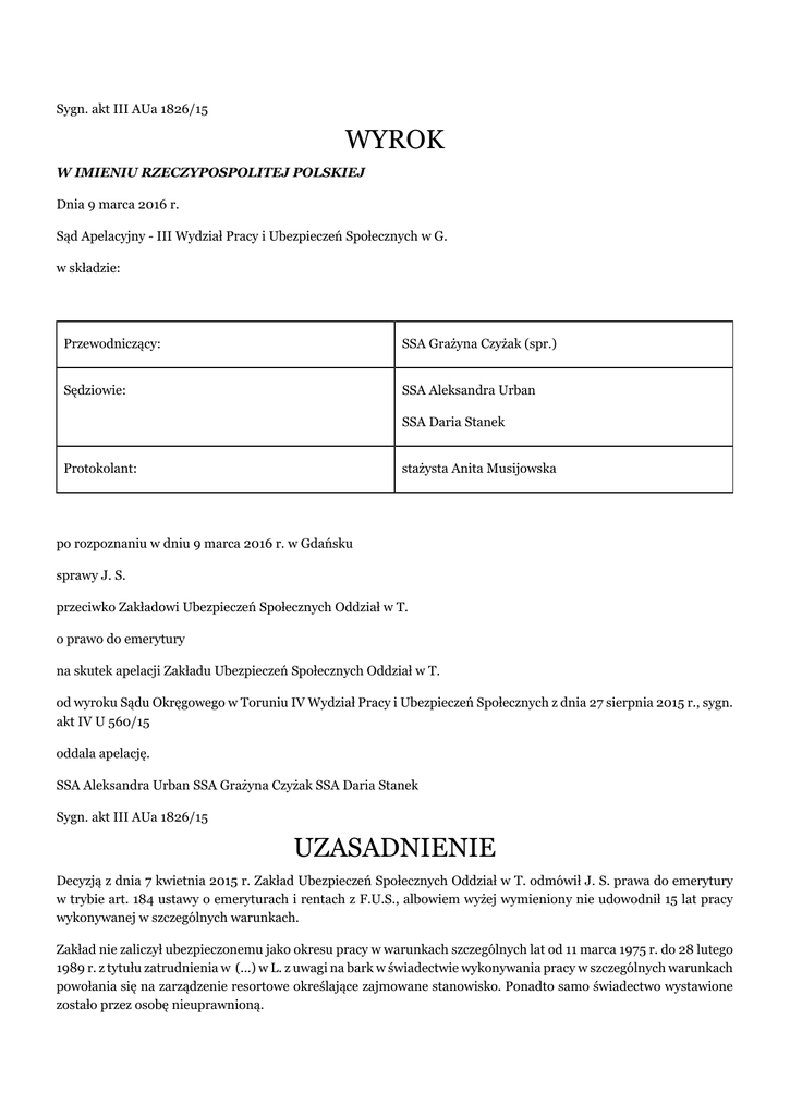 Sygn. akt III AUa 1826/15 WYROK W IMIENIU RZECZYPOSPOLITEJ POLSKIEJ Dnia 9 marca 2016 r. Sąd Apelacyjny - III Wydział Pracy i Ubezpieczeń Społecznych w G. w składzie: Przewodniczący: SSA Grażyna Czyżak (spr.) Sędziowie: SSA Aleksandra Urban SSA Daria Stanek Protokolant: stażysta Anita Musijowska po rozpoznaniu w dniu 9 marca 2016 r. w Gdańsku sprawy J. S. przeciwko Zakładowi Ubezpieczeń Społecznych Oddział w T. o prawo do emerytury na skutek apelacji Zakładu Ubezpieczeń Społecznych Oddział w T. od wyroku Sądu Okręgowego w Toruniu IV Wydział Pracy i Ubezpieczeń Społecznych z dnia 27 sierpnia 2015 r., sygn. akt IV U 560/15 oddala apelację. SSA Aleksandra Urban SSA Grażyna Czyżak SSA Daria Stanek Sygn. akt III AUa 1826/15 UZASADNIENIE Decyzją z dnia 7 kwietnia 2015 r. Zakład Ubezpieczeń Społecznych Oddział w T. odmówił J. S. prawa do emerytury w trybie art. 184 ustawy o emeryturach i rentach z F.U.S., albowiem wyżej wymieniony nie udowodnił 15 lat pracy wykonywanej w szczególnych warunkach. Zakład nie zaliczył ubezpieczonemu jako okresu pracy w warunkach szczególnych lat od 11 marca 1975 r. do 28 lutego 1989 r. z tytułu zatrudnienia w (...) w L. z uwagi na bark w świadectwie wykonywania pracy w szczególnych warunkach powołania się na zarządzenie resortowe określające zajmowane stanowisko. Ponadto samo świadectwo wystawione zostało przez osobę nieuprawnioną. Na podstawie dowodów dołączonych do wniosku organ rentowy przyjął na dzień 1 stycznia 1999 r. ogólny staż pracy wnioskodawcy w wymiarze: 25 lat i staż pracy w warunkach szczególnych: 9 lat, 5 miesięcy, 20 dni. Ubezpieczony złożył odwołanie od powyższej decyzji, w którym nie zgodził się z faktem nie uznania mu okresu pracy w (...) w L. jako pracy w warunkach szczególnych. W odpowiedzi na odwołanie organ rentowy podtrzymał swoje stanowisko wyrażone w decyzji i wniósł o oddalenie odwołania. Wyrokiem z dnia 27 sierpnia 2015 r. Sąd Okręgowy w Toruniu IV Wydział Pracy i Ubezpieczeń Społecznych zmienił zaskarżoną decyzję i przyznał J. S. prawo do emerytury poczynając od dnia (...). (I) oraz nie stwierdził odpowiedzialności organu rentowego za nieustalenie ostatniej okoliczności niezbędnej do wydania decyzji (II). Powyższe rozstrzygniecie Sąd Okręgowy oparł na następujących ustaleniach i rozważaniach: Ubezpieczony J. S. urodził się (...) Wcześniejszy wiek emerytalny 60 lat ukończył (...). Wniosek o emeryturę złożył 12 marca 2015 r. We wniosku zaznaczył, iż nie jest członkiem OFE. Staż ubezpieczeniowy J. S. na dzień 1 stycznia 1999 r. wyniósł łącznie 25 lat, w tym bezsporny staż pracy w warunkach szczególnych: 9 lat, 5 miesięcy, 20 dni. J. S. zatrudniony był w (...) w L. od 11 marca 1975 r. do 28 lutego 1989 r. na stanowisku kierowca ciągnikowy. W okresie od 18 lutego 1977 r. do 16 grudnia 1978 r. odbywał zasadniczą służbę wojskową. Uprawnienia na kategorię T ubezpieczony uzyskał 6 lutego 1975 r. Pracę kierowcy ciągnikowego wykonywał stale i w pełnym wymiarze czasu pracy. Do jego obowiązków należało wykonywanie przy pomocy ciągnika wszystkich prac związanych z rolnictwem takich jak opryski, orka, żniwa, kampania buraczana, wywożenie nieczystości, bronowanie, kultywatorowanie. Przy pomocy ciągników wykonywał także pracę w transporcie: woził zboże z kombajnów do elewatorów, buraki do C., wapno z M.. Zimą przy sprzyjającej pogodzie orał pola, robił podorywki, rozsiewał wapno, obornik, wywoził nieczystości, woził zboże z B. do magazynów w Ś. i B.. Przez pierwszy rok pracy wnioskodawca wykonywał prace polowe, następnie otrzymał ciągnik o większej mocy, którym mógł również wykonywać prace w transporcie. Wnioskodawca pracował w B. - filii (...) L.. Było tam 11 ciągników. Każdy ciągnik miał swojego kierowcę. Drobne awarie kierowcy naprawiali sami. Przy poważnych awariach ciągnik odstawiano na warsztat, a kierowca pracował na aktualnie wolnym sprzęcie. Ubezpieczony za swoją pracę otrzymywał dodatek szkodliwy. Powyższy stan faktyczny Sąd Okręgowy ustalił w oparciu o zeznania świadków P. G. i H. G., przesłuchanie ubezpieczonego w charakterze strony oraz na podstawie dokumentów znajdujących się w aktach rentowych i aktach osobowych. Sąd dał wiarę wszystkim wyżej powołanym dowodom jako, że były jasne, logiczne, zrozumiałe oraz wzajemnie się uzupełniały tworząc spójną całość. Sąd uznał za wiarygodne zeznania świadków, albowiem świadkowie wspólnie z ubezpieczonym pracowali i mieli niekwestionowaną wiedzę na temat szczególnych warunków pracy wnioskodawcy. Również zeznania złożone przez wnioskodawcą były, w ocenie Sądu I instancji, miarodajne, gdyż miały odniesienie do pozostałego materiału dowodowego. Pozostawały w zgodzie zarówno z zeznaniami świadków jak i z dokumentacją kadrowo – płacową z okresu zatrudnienia wnioskodawcy w (...) w L.. Sąd Okręgowy przypomniał, iż przedmiotem sporu w niniejszej sprawie było to, czy ubezpieczonemu przysługuje prawo do tzw. wcześniejszej emerytury z tytułu pracy w warunkach szczególnych. Pozwany organ rentowy nie kwestionował, że J. S. spełnia przesłanki, od których uzależnione jest nabycie prawa do emerytury takie jak: ukończenie wieku – 60 lat, brak członkostwa w OFE, legitymowanie się ogólnym stażem pracy – 25 lat. Spór dotyczył natomiast tego, czy ubezpieczony legitymuje się co najmniej 15-letnim stażem pracy w szczególnych warunkach według stanu na dzień 1.01.1999 r. Przy czym bezspornie zaliczono wnioskodawcy do pracy w warunkach szczególnych okres 9 lat, 5 m-cy, 20 dni. Sąd Okręgowy przywołał treść przepisu art. 184 ust. 1 i 2 ustawy z dnia 17 grudnia 1998 r. o emeryturach i rentach z Funduszu Ubezpieczeń Społecznych (tekst jednolity: Dz. U. z 2013 r., poz. 1440, ze zm.) oraz § 1 ust. 2 i 3, § 2 ust. 1 i §19 ust. 1 rozporządzenia Rady 