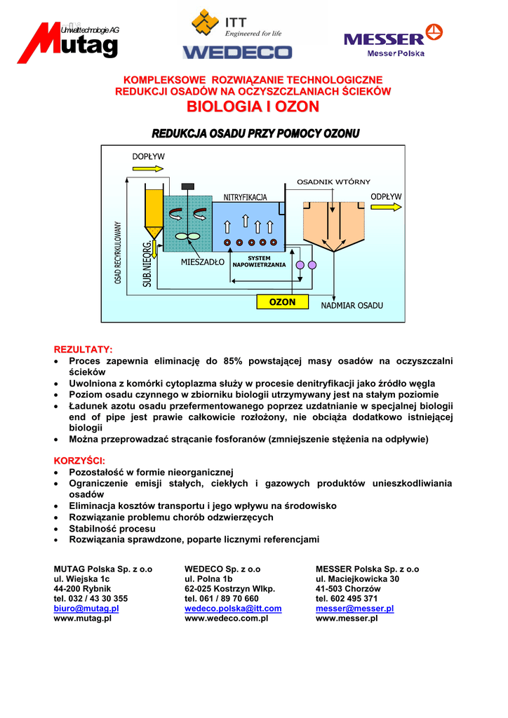 utag Umwelttechnologie AG KOMPLEKSOWE ROZWIĄZANIE TECHNOLOGICZNE REDUKCJI OSADÓW NA OCZYSZCZLANIACH ŚCIEKÓW BIOLOGIA I OZON SYSTEM NAPOWIETRZANIA OZON REZULTATY: • Proces zapewnia eliminację do 85% powstającej masy osadów na oczyszczalni ścieków • Uwolniona z komórki cytoplazma służy w procesie denitryfikacji jako źródło węgla • Poziom osadu czynnego w zbiorniku biologii utrzymywany jest na stałym poziomie • Ładunek azotu osadu przefermentowanego poprzez uzdatnianie w specjalnej biologii end of pipe jest prawie całkowicie rozłożony, nie obciąża dodatkowo istniejącej biologii • Można przeprowadzać strącanie fosforanów (zmniejszenie stężenia na odpływie) KORZYŚCI: • Pozostałość w formie nieorganicznej • Ograniczenie emisji stałych, ciekłych i gazowych produktów unieszkodliwiania osadów • Eliminacja kosztów transportu i jego wpływu na środowisko • Rozwiązanie problemu chorób odzwierzęcych • Stabilność procesu • Rozwiązania sprawdzone, poparte licznymi referencjami MUTAG Polska Sp. z o.o ul. Wiejska 1c 44-200 Rybnik tel. 032 / 43 30 355 [email protected] www.mutag.pl WEDECO Sp. z o.o ul. Polna 1b 62-025 Kostrzyn Wlkp. tel. 061 / 89 70 660 [email protected] www.wedeco.com.pl MESSER Polska Sp. z o.o ul. Maciejkowicka 30 41-503 Chorzów tel. 602 495 371 [email protected] www.messer.pl