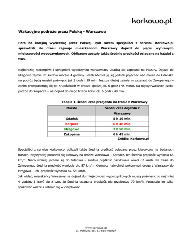 Wakacyjne podróże przez Polskę - Warszawa Pora na kolejną wycieczkę przez Polskę. Tym razem specjaliści z serwisu Korkowo.pl sprawdzili, ile czasu zajmuje mieszkańcom Warszawy dojazd do pięciu wybranych miejscowości wypoczynkowych. Obliczone zostały także średnie prędkości osiągane na każdej z tras. Najbardziej niecierpliwi i spragnieni wypoczynku warszawiacy udadzą się zapewne na Mazury. Dojazd do Mrągowa zajmie im średnio niecałe 4 godziny. Jeżeli zdecydują się jednak pojechać nad morze do Gdańska na podróż będą musieli poświęcić już 5 godz i 19 min. Jeszcze dłużej zajmie im przejazd do Zakopanego – zanim przespacerują się po Krupówkach w drodze spędzą ok. 6 godz i 45 minut. Na najwytrwalszych czeka podróż do Karpacza – na dojazd do niego trzeba liczyć ok. 6 godz i 48 min. Tabela 1. średni czas przejazdu na trasie z Warszawy Miasto Średni czas dojazdu z Warszawy Gdańsk 5 h 19 min. Karpacz 6 h 48 min. Mrągowo 3 h 58 min. Zakopane 6 h 45 min. Źródło: Korkowo.pl Specjaliści z serwisu Korkowo.pl obliczyli także średnią prędkość osiąganą przez kierowców na badanych trasach. Najszybciej poruszali się kierowcy na drodze Warszawa – Karpacz. Ich średnia prędkość wyniosła 65 km/h. Nieco wolniej jechało się do Gdańska – średnia prędkość oscylowała wokół 62 km/h. Na trasie do Zakopanego średnia prędkość wyniosła ok. 57 km/h. Kierowcy najwolniej pokonywali drogę z Warszawy do Mrągowa – ich prędkość wynosiła ok. 54 km/h. Jak widać, mieszkańcy Warszawy na dojazd do miejscowości wypoczynkowych muszą poświecić co najmniej 4 godziny i liczyć się z tym, że średnia osiągana prędkość nie przekroczy 70 km/h. Pozostaje im tylko spakować walizki i uzbroić się w cierpliwość. www.korkowo.pl ul. Perkuna 25, 61-615 Poznań Tabela 2. Średnia prędkość na trasie z Warszawy Miasto Średnia prędkość na trasie z Warszawy Gdańsk 62 km/h Karpacz 65 km/h Mrągowo 54 km/h Zakopane 57 km/h Źródło: Korkowo.pl Dane o sytuacji drogowej zostały opracowane przez serwis Korkowo.pl, który prezentuje aktualne informacje o korkach na polskich drogach. Analizie poddano dane GPS z urządzeń Yanosik umieszczonych w pojazdach poruszających się w godzinach od 06:00 do 22:00 w okresie 02.07.2012. ------------------------------Dystrybucja materiałów: Kinga Przybysz [email protected] kom./+48/ 519-181-900 www.korkowo.pl ul. Perkuna 25, 61-615 Poznań
