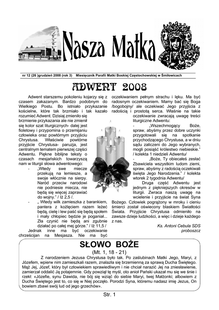 nr 12 (26 )grudzień 2008 (rok 3) Miesięcznik Parafii Matki Boskiej Częstochowskiej w Śmiłowicach ADWENT 2008 Adwent starszemu pokoleniu kojarzy się z czasem zakazanym. Bardzo podobnym do Wielkiego Postu. Bo istniało przykazanie kościelne, które tak brzmiało i tak kazało rozumieć Adwent. Dzisiaj zmieniło się brzmienie przykazania ale nie zmienił się kolor szat liturgicznych- dalej jest fioletowy i przypomina o przemijaniu człowieka oraz powtórnym przyjściu Chrystusa. Właściwie powtórne przyjście Chrystusa- paruzja, jest centralnym tematem pierwszej części Adwentu. Piękne biblijne teksty o czasach mesjańskich towarzyszą nam w liturgii słowa adwentowego: „Wtedy swe miecze przekują na lemiesze, a swoje włócznie na sierpy. Naród przeciw narodowi nie podniesie miecza, nie będą się więcej zaprawiać do wojny.” / IŜ 2,5 /. „ Wtedy wilk zamieszka z barankiem, pantera z koźlęciem razem leŜeć będą, cielę i lew paść się będą społem i mały chłopiec będzie je poganiał... Zła czynić nie będą ani zgubnie działać po całej mej górze.” / IŜ 11,5 / Jednak inne ma być oczekiwanie chrześcijan na Mesjasza. Nie ma być oczekiwaniem pełnym strachu i lęku. Ma być radosnym oczekiwaniem. Mamy bać się Boga /bogobojny/ ale oczekiwać Jego przyjścia z radością i prostotą serca. Właśnie na takie oczekiwanie zwracają uwagę treści liturgiczne Adwentu: „Wszechmogący BoŜe, spraw, abyśmy przez dobre uczynki przygotowali się na spotkanie przychodzącego Chrystusa, a w dniu sądu zaliczeni do Jego wybranych, mogli posiąść królestwo niebieskie.” / kolekta 1 niedzieli Adwentu/ „BoŜe, Ty obiecałeś zesłać Zbawiciela wszystkim ludom ziemi, spraw, abyśmy z radością oczekiwali święta Jego Narodzenia.” / kolekta wtorek 2 tygodnia Adwentu/ Druga część Adwentu jest jednym z piękniejszych okresów w liturgii. Zwraca naszą uwagę na wcielenie i przyjście na świat Syna BoŜego. Człowiek pogrąŜony w mroku i cieniu śmierci został oświecony blaskiem Światłości Świata. Przyjście Chrystusa odmieniło na zawsze dzieje ludzkości, a więc i dzieje kaŜdego z nas. Ks. Antoni Cebula SDS proboszcz SŁOWO BOśE (Mt. 1, 18 - 21) Z narodzeniem Jezusa Chrystusa było tak. Po zaślubinach Matki Jego, Maryi, z Józefem, wpierw nim zamieszkali razem, znalazła się brzemienną za sprawą Ducha Świętego. MąŜ Jej, Józef, który był człowiekiem sprawiedliwym i nie chciał narazić Jej na zniesławienie, zamierzał oddalić Ją potajemnie. Gdy powziął tę myśl, oto anioł Pański ukazał mu się we śnie i rzekł: «Józefie, synu Dawida, nie bój się wziąć do siebie Maryi, twej MałŜonki; albowiem z Ducha Świętego jest to, co się w Niej poczęło. Porodzi Syna, któremu nadasz imię Jezus, On bowiem zbawi swój lud od jego grzechów». Str. 1 S³uga Bo¿y o. Franciszek Maria od Krzy¿a Jordan (1848 - 1918) Za³o¿yciel Salwatorianów i Salwatorianek W związku z trwającym „Rokiem Jordana”, chciałbym Państwu przybliŜyć w kilku najbliŜszych numerach „Naszej Matki”, sylwetkę oraz dzieło Sługi BoŜego o. Franciszka Jordana. Teksty które będą publikowane, pochodzą ze strony internetowej Salwatoriańskiego Ośrodka Powołań. gmb 18 czerwca w domu generalnym lepszego poznania bogactwa Ŝycia i salwatorianów w Rzymie zainaugurowano charyzmatu załoŜyciela, naśladowania go i Rok Jordana, załoŜyciela trzech gałęzi dzielenia się nim z innymi” – powiedział ks. Rodziny Salwatoriańskiej. Andrzej Urbański SDS. W bieŜącym roku przypadają trzy W homilii kard. Martins odwołał rocznice związane z Franciszkiem Marią się do Dziennika Duchowego śługi BoŜego od KrzyŜa Jordanem: 160-lecie urodzin, podkreślając, Ŝe był on człowiekiem wiary, 130-lecie święceń kapłańskich oraz 90- nadziei i miłości, który w doświadczeniu lecie śmierci – wyjaśnia prokurator krzyŜa całkowicie zaufał Opatrzności generalny salwatorianów, ks. Bronisław BoŜej. Watykański purpurat zauwaŜył teŜ, Jakubiec SDS. Ŝe sprawy związane z samym procesem Uroczystościom przewodniczył beatyfikacyjnym są w dobrym punkcie i jest kard. José Saraiva Martins. Prefekt nadzieja na szczęśliwe wyniesienie do Kongregacji Spraw Kanonizacyjnych modlił chwały ołtarzy „dobrego i wiernego sługi”. się przy grobie Ojca Jordana o jego rychłą Po zakończeniu Mszy św. miała miejsce beatyfikację. Podczas Eucharystii prezentacja filmu „Ojciec Franciszek przełoŜony generalny salwatorianów Jordan, Apostoł na nasze czasy”. podkreślił znaczenie Roku Jordana dla Zainaugurowane 18 czerwca w całej Rodziny Salwatoriańskiej. „Nie jest to Rzymie obchody Roku Jordana zakończą jedynie istotny moment w drodze do się 16 czerwca 2009 r. KAI beatyfikacji. To szczególna okazja do S£UGA BO¯Y FRANCISZEK MARIA OD KRZY¯A JORDAN Urodził się w dniu 16 czerwca 1848 roku w ubogiej rodzinie wiejskiej w Gurtweil koło Waldshut (Badenia, Niemcy, archidiecezja fryburska). Zmarł w Tafers koło Fryburga (Szwajcaria) w dniu 8 września 1918 roku. Od najmłodszych lat pragnął zostać księdzem. Na zrealizowanie planów musiał czekać dość długo z powodu trudnej sytuacji rodzinnej. Pracował fizycznie jako robotnik, był zdolnym i cenionym rzemieślnikiem. Cechowała go wytrwałość w dąŜeniu do upragnionego celu. W wieku 26 lat (rok 1874) rozpoczął studia teologiczne, a mając 30 lat (rok 1878) został wyświęcony na kapłana, w czasie, gdy Kościół w Niemczech przeŜywał trudny okres kulturkampfu. O. Jordan jako neoprezbiter otrzymał stypendium od biskupa pomocniczego Fryburga na studia języków orientalnych w Rzymie. Jednak juŜ jako seminarzysta odczuwał wewnętrzne przekonanie, Ŝe Bóg wzywa go do załoŜenia w Kościele dzieła apostolskiego. Decydująca dla realizacji BoŜych planów okazała się jego podróŜ na Bliski Wschód, a zwłaszcza do Ziemi Świętej, w roku 1880. Podczas