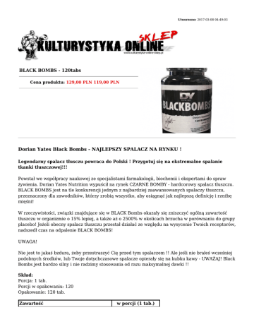 Utworzono: 2017-03-08 04:49:03 BLACK BOMBS - 120tabs Cena produktu: 129,00 PLN 119,00 PLN Dorian Yates Black Bombs - NAJLEPSZY SPALACZ NA RYNKU ! Legendarny spalacz tłusczu powraca do Polski ! Przygotuj się na ekstremalne spalanie tkanki tłuszczowej!!! Powstał we współpracy naukowej ze specjalistami farmakologii, biochemii i ekspertami do spraw żywienia. Dorian Yates Nutrition wypuścił na rynek CZARNE BOMBY - hardcorowy spalacz tłuszczu. BLACK BOMBS jest na tle konkurencji jednym z najbardziej zaawansowanych spalaczy tłuszczu, przeznaczony dla zawodników, którzy zrobią wszystko, aby osiągnąć jak najlepszą definicję i rzeźbę mięśni! W rzeczywistości, związki znajdujące się w BLACK Bombs okazały się zniszczyć ogólną zawartość tłuszczu w organizmie o 15% lepiej, a także aż o 2500% w okolicach brzucha w porównaniu do grupy placebo! Jeżeli obecny spalacz tłuszczu przestał działać ze względu na wysycenie Twoich receptorów, nadszedł czas na odpalenie BLACK BOMBS! UWAGA! Nie jest to jakaś bzdura, żeby przestraszyć Cię przed tym spalaczem !! Ale jeśli nie brałeś wcześniej podobnych środków, lub Twoje dotychczasowe spalacze opierały się na kubku kawy - UWAŻAJ! Black Bombs jest bardzo silny i nie radzimy stosowania od razu maksymalnej dawki !! Skład: Porcja: 1 tab. Porcji w opakowaniu: 120 Opakowanie: 120 tab. Zawartość w porcji (1 tab.) Ekstrakt liści herbaty Yerba Mate(ILEX PARAGUARIENSIS) w tym: *kofeina *mateina 125mg Ekstrakt z nasion zielonej kawy (COFFEA ARABICA) w tym: *kwas chlorogenowy *kofeina 200mg Ekstrakt z gorzkiej pomarańczy 100%(CITRUS AURANTIUM 4:1) w tym: *synefryna *hesperydyna 25mg 10mg 10mg 84mg 6mg 1,25mg 8,75mg Tauryna 78mg Kofeina bezwodna 175mg Pozostałe składniki: Celuloza, Dwutlenek Krzemu, Talk, Stearynian Magnezu, Alkohol Poliwinylowy, Glikol Polietylenowy. Dawkowanie: Zażywanie rozpocząć od 1 tabletki dwa razy dziennie popijając szklanką zimnej wody. Pierwszą porcję spożyć 30 do 60minut przed śniadaniem, drugą porcję 30 do 60 minut przed obiadem lub treningiem. Nie brać więcej jak dwie tabletki w przeciągu 4 godzin i 4 tabletki w ciągu 24h. Nie stosować 5 godzin przed snem. Zażywanie większej ilości od rekomendowanej nie powoduje poprawienia rezultatów. Adres: http://www.ko.sklep.pl/ Telefon: kom. 782 010 880 Email: [email protected]