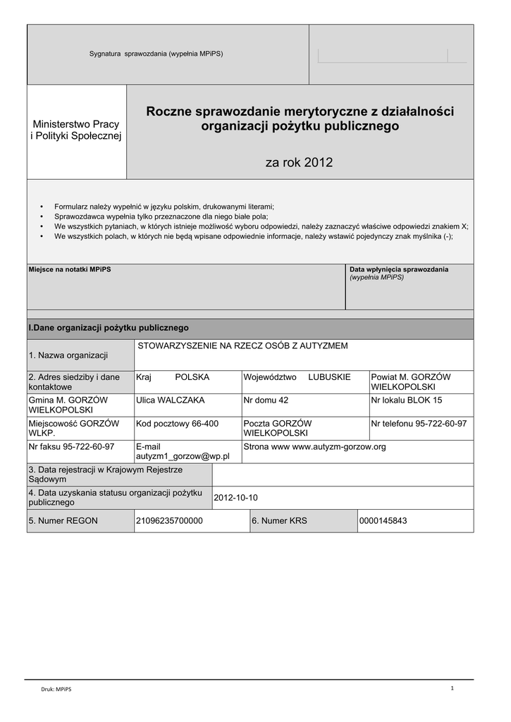 6\JQDWXUDVSUDZR]GDQLDZ\SHáQLD 6\JQDWXUDVSUDZR]GDQLDZ\SHáQLD03L36 MPiPS) Ministerstwo Pracy L3ROLW\NL6SRáHF]QHM 5RF]QHVSUDZR]GDQLHPHU\WRU\F]QH]G]LDáDOQRĞFL RUJDQL]DFMLSRĪ\WNXSXEOLF]QHJR za rok 2012 • • • • )RUPXODU]QDOHĪ\Z\SHáQLüZMĊ]\NXSROVNLPGUXNRZDQ\PLOLWHUDPL 6SUDZR]GDZFDZ\SHáQLDW\ONRSU]H]QDF]RQHGODQLHJRELDáHSROD :HZV]\VWNLFKS\WDQLDFKZNWyU\FKLVWQLHMHPRĪOLZRĞüZ\ERUXRGSRZLHG]LQDOHĪ\]D]QDF]\üZáDĞFLZHRGSRZLHG]L]QDNLHP; :HZV]\VWNLFKSRODFKZNWyU\FKQLHEĊGąZSLVDQHRGSRZLHGQLHLQIRUPDFMHQDOHĪ\ZVWDZLüSRMHG\QF]\]QDNP\ĞOQLND 'DWDZSá\QLĊFLDVSUDZR]GDQLD Z\SHáQLD03L36 Miejsce na notatki MPiPS ,'DQHRUJDQL]DFMLSRĪ\WNXSXEOLF]QHJR STOWARZYSZENIE NA RZECZ OSÓB Z AUTYZMEM 1. Nazwa organizacji 2. Adres siedziby i dane kontaktowe Kraj POLSKA Województwo LUBUSKIE Powiat M. GORZÓW WIELKOPOLSKI Gmina M. GORZÓW WIELKOPOLSKI Ulica WALCZAKA Nr domu 42 Nr lokalu BLOK 15 0LHMVFRZRĞü*25=Ï: WLKP. Kod pocztowy 66-400 Poczta GORZÓW WIELKOPOLSKI Nr telefonu 95-722-60-97 Nr faksu 95-722-60-97 E-mail [email protected] Strona www www.autyzm-gorzow.org 3. Data rejestracji w Krajowym Rejestrze 6ąGRZ\P 'DWDX]\VNDQLDVWDWXVXRUJDQL]DFMLSRĪ\WNX publicznego 5. Numer REGON Druk: MPiPS 21096235700000 2012-10-10 6. Numer KRS 0000145843 1 6NáDGRUJDQX]DU]ąG]DMąFHJRRUJDQL]DFML 1DOHĪ\ZSLVDüLPLRQDQD]ZLVNDRUD]LQIRUPDFMHRIXQNFML SHáQLRQHMSU]H]SRV]F]HJyOQ\FKF]áRQNyZRUJDQX ]DU]ąG]DMąFHJR 1. Piotr Dokurno – Prezes Zarzadu 2. Ewa Przybylska – Wiceprezes 3$OLFMD3áDZVLXN6NDUEQLN=DU]ąGX 4. Alicja Jagoda –Sekretarz 6NáDGRUJDQXNRQWUROLOXEQDG]RUXRUJDQL]DFML Komisja Rewizyjna: 1DOHĪ\ZSLVDüLPLRQDQD]ZLVNDRUD]LQIRUPDFMHRIXQNFML 1-RDQQD%XG]LDQRZVND3U]HZRGQLF]ąFD SHáQLRQHMSU]H]SRV]F]HJyOQ\FKF]áRQNyZRUJDQXNRQWUROL 2$JQLHV]ND.XU]DZLĔVND6HNUHWDU] lub nadzoru) 3%HDWD:LHF]RUHN&]áRQHN 9. Cele statutowe organizacji 1DOHĪ\RSLVDüFHOHQDSRGVWDZLHVWDWXWXRUJDQL]DFML 10. Sposób realizacji celów statutowych organizacji 1DOHĪ\RSLVDüVSRVyEUHDOL]DFMLFHOyZVWDWXWRZ\FK organizacji na podstawie statutu organizacji) Druk: MPiPS 1:V]HFKVWURQQDSRPRFG]LHFLRPPáRG]LHĪ\LGRURVá\PRVRERP] autyzmem oraz ich rodzinom, opiekunom i specjalistom. 22UJDQL]RZDQLHLSURZDG]HQLHUyĪQ\FKIRUPOHF]QLFWZDHGXNDFMLL UHKDELOLWDFMLRUD]RSLHNLQDGG]LHüPLPáRG]LHĪąLGRURVá\PLRVREDPL z autyzmem. 33RSXODU\]RZDQLHSUREOHPDW\NL]ZLą]DQHM]DXW\]PHP 43URZDG]HQLHG]LDáDOQRĞFLLQWHJUDF\MQHM 53URZDG]HQLHG]LDáDOQRĞFLFKDU\WDW\ZQHMQDU]HF]QDMEDUG]LHM SRWU]HEXMąF\FKURG]LQG]LHFLPáRG]LHĪ\LRVyEGRURVá\FK] autyzmem. 1. Organizowanie i prowadzenie grup terapeutycznych, warsztatów WHUDSLL]DMĊFLRZHM 22UJDQL]RZDQLHLUHDOL]RZDQLHV]NROHĔLNRQIHUHQFMLGODURG]LFyZ VSHFMDOLVWyZLJUXS]DLQWHUHVRZDQ\FKSUREOHPDW\NąDXW\]PX 3. Realizacja programu edukacyjnego, rehabilitacyjnego, VW\PXODF\MQHJRLWHUDSHXW\F]QHJRRGE\ZDVLĊZV\VWHPLH terapeuta- dziecko. 45R]SRZV]HFKQLDQLHSRUDGQLNyZLELXOHW\QyZGRW\F]ąF\FK stowarzyszenia i autyzmu. 53URZDG]HQLHUHMHVWUXG]LHFLPáRG]LHĪ\LGRURVá\FKRVyE] autyzmem, gromadzenie informacji na temat autyzmu. 6. Zbieranie funduszy. 7:VSyáSUDFD]ZáDG]DPLLQVW\WXFMDPLRUJDQL]DFMDPL SR]DU]ąGRZ\PLĞURGNDPLPDVRZHJRSU]HND]XRUD]LQVW\WXFMDPL naukowymi. 86WRZDU]\V]HQLHQD5]HF]2VyE]$XW\]PHPLMHJRRGG]LDá\ PRJąSURZDG]LüG]LDáDOQRĞüJRVSRGDUF]ąQDWHUHQLH 5]HF]SRVSROLWHM3ROVNLHM]JRGQLH]SU]HSLVDPLSUDZD]PLHU]DMąFą GRSR]\VNDQLDĞURGNyZQDFHOHVWDWXWRZH 2 1DMZDĪQLHMV]HVIHU\G]LDáDOQRĞFLSRĪ\WNX publicznego 1DOHĪ\ZVND]DüQLHZLĊFHMQLĪWU]\QDMZDĪQLHMV]HSRG Z]JOĊGHPZLHONRĞFLZ\GDWNRZDQ\FKĞURGNyZVIHU\ G]LDáDOQRĞFLSRĪ\WNXSXEOLF]QHJRRNWyU\FKPRZDZDUW XVWXVWDZ\]GQLDNZLHWQLDURG]LDáDOQRĞFL SRĪ\WNXSXEOLF]QHJRLRZRORQWDULDFLH(Dz. U. z 2010 r. Nr 234, poz. 1536), ]DF]\QDMąFRGQDMZDĪQLHMV]HM QDXNDV]NROQLFWZRZ\ĪV]HHGXNDFMDRĞZLDWDLZ\FKRZDQLH SRPRFVSRáHF]QDZW\PSRPRFURG]LQRPLRVRERPZWUXGQHM V\WXDFMLĪ\FLRZHMRUD]Z\UyZQ\ZDQLHV]DQVW\FKURG]LQLRVyE ,,&KDUDNWHU\VW\NDG]LDáDOQRĞFLRUJDQL]DFMLSRĪ\WNXSXEOLF]QHJRZRNUHVLHVSUDZR]GDZF]\P 2SLVG]LDáDOQRĞFLSRĪ\WNXSXEOLF]QHJR W 2012U6WRZDU]\V]HQLHSURZDG]LáRGZLHSODFyZNLGODG]LHFL]DXW\]PHP 1. Przedszkole Specjalne dla Dzieci z Autyzmem 22ĞURGHN5HZDOLGDF\MQR±(GXNDF\MQR±:\FKRZDZF]\GOD']LHFLL0áRG]LHĪ\ z Autyzmem. 2SLVJáyZQ\FKG]LDáDĔ SRGMĊW\FKSU]H]RUJDQL]DFMĊ :3U]HGV]NROXSU]HE\ZDMąG]LHFLZZLHNXRG3 do 6ODW3yĨQLHMWUDILDMąGR 2ĞURGND3R]RVWDMąZ3U]HGV]NROXWHV]HĞFLRODWNLXNWyU\FKQLHZ\VWĊSXMą ]DEXU]HQLDVSU]ĊĪRQHDMHG\QLHDXW\]P6]HĞFLRODWNL]HVSU]ĊĪHQLDPLWUDILDMą GR2ĞURGND :2ĞURGNXUHDOL]XMą URF]QHRERZLą]NRZHSU]\JRWRZDQLHSU]HGV]NROQH RERZLą]HNV]NROQ\QDHWDSLHV]NRá\SRGVWDZRZHMLJLPQD]MXP ]DMĊFLDUHZDOLGDF\MQR±Z\FKRZDZF]H 3RQDGWRZ2ĞURGNXUHDOL]RZDQHVąJUXSRZH]DMĊFLDWHUDSHXW\F]QHGODG]LHFLL PáRG]LHĪ\]=HVSRáHP$VSHUJHUDUHDOL]XMąF\FKRERZLą]HNV]NROQ\Z placówkach macierzystych. -XĪSLąW\URNSUDFXMHP\ZHGáXJ,QQRZDFMLSHGDJRJLF]Q\FK.DĪGHG]LHFNRPD opracowany indywidualny program edukacyjno –terapeutyczny, dostosowany do PRĪOLZRĞFLSV\FKRIL]\F]Q\FKSRV]F]HJyOQ\FKXF]QLyZ=DMĊFLDRGE\ZDMąVLĊ JáyZQLHLQG\ZLGXDOQLHZV\VWHPLHWHUDSHXWD±G]LHFNR:PLDUĊSRSUDZ\ IXQNFMRQRZDQLDG]LHFLWZRU]\P\PLQLRGG]LDá\ 2SUyF]]DMĊüHGXNDF\MQ\FKNDĪGHG]LHFNRPDXVWDORQ\SODQ]DMĊü WHUDSHXW\F]Q\FKGRVWRVRZDQ\GRMHJRSRWU]HEDZ\EUDQ\VSRĞUyGRIHUW\ GRVWĊSQHMQDWHUHQLHSODFyZNLVąWRPLQ -stymulacja sensoryczna, - rehabilitacja ruchowa i gimnastyka korekcyjna - metoda Knilla, - metoda kinezjologii edukacyjnej P. Dennisona, PHWRGDUXFKXUR]ZLMDMąFHJR:6KHUERUQH SRUDQQ\NUąJ ]DMĊFLDPX]\F]QHLU\WPLND ]DMĊFLDWHDWUDOQH - dogoterapia, - metoda Tomatisa, - metoda EEG Biofeedback , - terapia logopedyczna, WHUDSLDPHWRGą6, - metoda Montessori, ]DMĊFLDJUXSRZHZVSRPDJDMąFHUR]ZyMG]LHFLDXW\VW\F]Q\FK JUXSRZH]DMĊFLDZVSRPDJDMąFHUR]ZyMUXFKRZ\LLQWHJUDFMĊRGUXFKyZ 3RGRSLHF]QL3U]HGV]NRODUyZQLHĪXF]HVWQLF]ąZ]DMĊFLDFKWHUDSHXW\F]Q\FK FKRFLDĪZQLHFRPQLHMV]\P]DNUHVLHQLĪZ2ĞURGNX - stymulacja sensoryczna, WHUDSLDPHWRGą6, - terapia logopedyczna, - metoda Montessori, - rytmika, - dogoterapia, SRUDQQ\NUąJ - metoda W. Sherborne, - metoda Knilla. Druk: MPiPS 3 3RQDGWRQDWHUHQLH2ĞURGNDXF