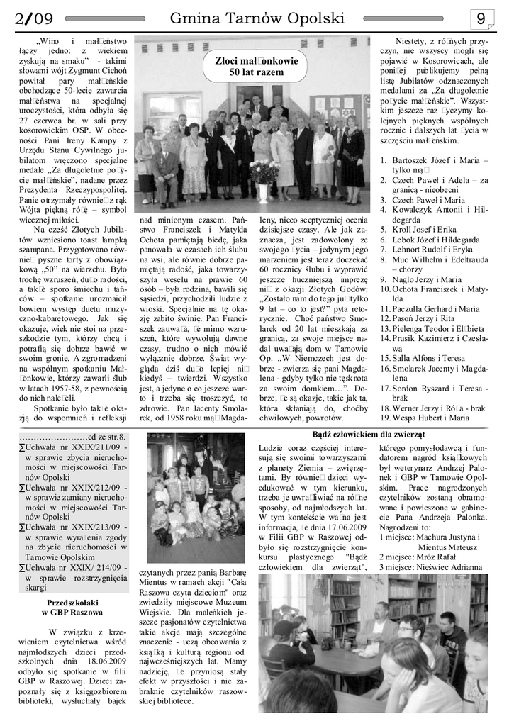 2 09 „Wino i małżeństwo łączy jedno: z wiekiem zyskują na smaku” - takimi słowami wójt Zygmunt Cichoń powitał pary małżeńskie obchodzące 50-lecie zawarcia małżeństwa na specjalnej uroczystości, która odbyła się 27 czerwca br. w sali przy kosorowickim OSP. W obecności Pani Ireny Kampy z Urzędu Stanu Cywilnego jubilatom wręczono specjalne medale „Za długoletnie pożycie małżeńskie”, nadane przez Prezydenta Rzeczypospolitej. Panie otrzymały również z rąk Wójta piękną różę – symbol wiecznej miłości. Na cześć Złotych Jubilatów wzniesiono toast lampką szampana. Przygotowano również pyszne torty z obowiązkową „50” na wierzchu. Było trochę wzruszeń, dużo radości, a także sporo śmiechu i tańców – spotkanie urozmaicił bowiem występ duetu muzyczno-kabaretowego. Jak się okazuje, wiek nie stoi na przeszkodzie tym, którzy chcą i potrafią się dobrze bawić w swoim gronie. A zgromadzeni na wspólnym spotkaniu Małżonkowie, którzy zawarli ślub w latach 1957-58, z pewnością do nich należeli. Spotkanie było także okazją do wspomnień i refleksji ……………………cd ze str.8. · Uchwała nr XXIX/211/09 w sprawie zbycia nieruchomości w miejscowości Tarnów Opolski · Uchwała nr XXIX/212/09 w sprawie zamiany nieruchomości w miejscowości Tarnów Opolski · Uchwała nr XXIX/213/09 w sprawie wyrażenia zgody na zbycie nieruchomości w Tarnowie Opolskim · Uchwała nr XXIX/ 214/09 w sprawie rozstrzygnięcia skargi Przedszkolaki w GBP Raszowa W związku z krzewieniem czytelnictwa wśród najmłodszych dzieci przedszkolnych dnia 18.06.2009 odbyło się spotkanie w filii GBP w Raszowej. Dzieci zapoznały się z księgozbiorem biblioteki, wysłuchały bajek Gmina Tarnow Opolski Niestety, z różnych przyczyn, nie wszyscy mogli się pojawić w Kosorowicach, ale poniżej publikujemy pełną listę Jubilatów odznaczonych medalami za „Za długoletnie pożycie małżeńskie”. Wszystkim jeszcze raz życzymy kolejnych pięknych wspólnych rocznic i dalszych lat życia w szczęściu małżeńskim. Złoci małżonkowie 50 lat razem nad minionym czasem. Państwo Franciszek i Matylda Ochota pamiętają biedę, jaka panowała w czasach ich ślubu na wsi, ale równie dobrze pamiętają radość, jaka towarzyszyła weselu na prawie 60 osób – była rodzina, bawili się sąsiedzi, przychodzili ludzie z wioski. Specjalnie na tę okazję zabito świnię. Pan Franciszek zauważa, że mimo wzruszeń, które wywołują dawne czasy, trudno o nich mówić wyłącznie dobrze. Świat wygląda dziś dużo lepiej niż kiedyś – twierdzi. Wszystko jest, a jedyne o co jeszcze warto i trzeba się troszczyć, to zdrowie. Pan Jacenty Smolarek, od 1958 roku mąż Magda- 9 leny, nieco sceptyczniej ocenia dzisiejsze czasy. Ale jak zaznacza, jest zadowolony ze swojego życia – jedynym jego marzeniem jest teraz doczekać 60 rocznicy ślubu i wyprawić jeszcze huczniejszą imprezę niż z okazji Złotych Godów: „Zostało nam do tego już tylko 9 lat – co to jest?” pyta retorycznie. Choć państwo Smolarek od 20 lat mieszkają za granicą, za swoje miejsce nadal uważają dom w Tarnowie Op. „W Niemczech jest dobrze - zwierza się pani Magdalena - gdyby tylko nie tęsknota za swoim domkiem…”. Dobrze, że są okazje, takie jak ta, która skłaniają do, choćby chwilowych, powrotów. 1. Bartoszek Józef i Maria – tylko mąż 2. Czech Paweł i Adela – za granicą - nieobecni 3. Czech Paweł i Maria 4. Kowalczyk Antonii i Hildegarda 5. Kroll Josef i Erika 6. Lebok Józef i Hildegarda 7. Lehnort Rudolf i Eryka 8. Muc Wilhelm i Edeltrauda – chorzy 9. Naglo Jerzy i Maria 10. Ochota Franciszek i Matylda 11. Paczulla Gerhard i Maria 12. Pasoń Jerzy i Rita 13. Pielenga Teodor i Elżbieta 14. Prusik Kazimierz i Czesława 15. Salla Alfons i Teresa 16. Smolarek Jacenty i Magdalena 17. Sordon Ryszard i Teresa brak 18. Werner Jerzy i Róża - brak 19. Wespa Hubert i Maria Bądź człowiekiem dla zwierząt czytanych przez panią Barbarę Mientus w ramach akcji "Cała Raszowa czyta dzieciom" oraz zwiedziły miejscowe Muzeum Wiejskie. Dla maleńkich jeszcze pasjonatów czytelnictwa takie akcje mają szczególne znaczenie - uczą obcowania z książką i kulturą regionu od najwcześniejszych lat. Mamy nadzieję, że przyniosą stały efekt w przyszłości i nie zabraknie czytelników raszowskiej bibliotece. Ludzie coraz częściej interesują się swoimi towarzyszami z planety Ziemia – zwięrzętami. By również dzieci wyedukować w tym kierunku, trzeba je uwrażliwiać na różne sposoby, od najmłodszych lat. W tym kontekście ważna jest informacja, że dnia 17.06.2009 w Filii GBP w Raszowej odbyło się rozstrzygnięcie konkursu plastycznego "Bądź człowiekiem dla zwierząt", którego pomysłodawcą i fundatorem nagród książkowych był weterynarz Andrzej Palonek i GBP w Tarnowie Opolskim. Prace nagrodzonych czytelników zostaną obramowane i powieszone w gabinecie Pana Andrzeja Palonka. Nagrodzeni to: 1 miejsce: Machura Justyna i Mientus Mateusz 2 miejsce: Mróz Rafał 3 miejsce: Nieświec Adrianna