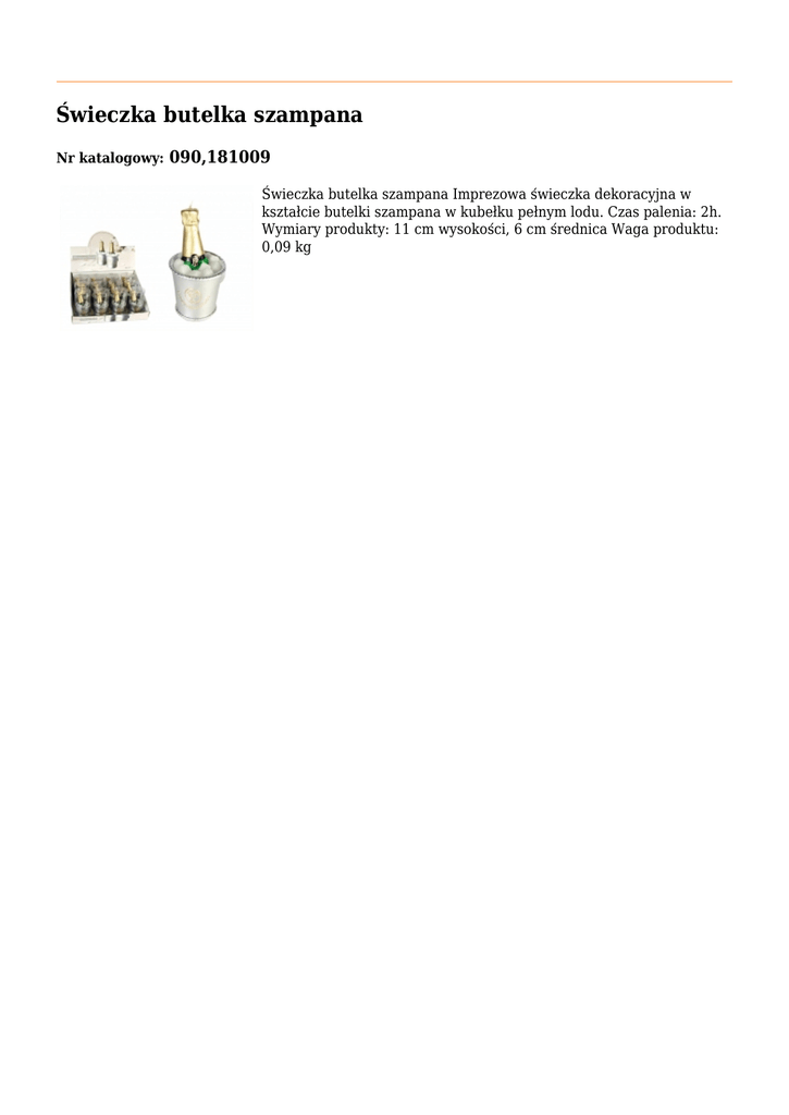 Świeczka butelka szampana Nr katalogowy: 090,181009 Świeczka butelka szampana Imprezowa świeczka dekoracyjna w kształcie butelki szampana w kubełku pełnym lodu. Czas palenia: 2h. Wymiary produkty: 11 cm wysokości, 6 cm średnica Waga produktu: 0,09 kg