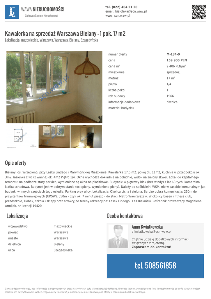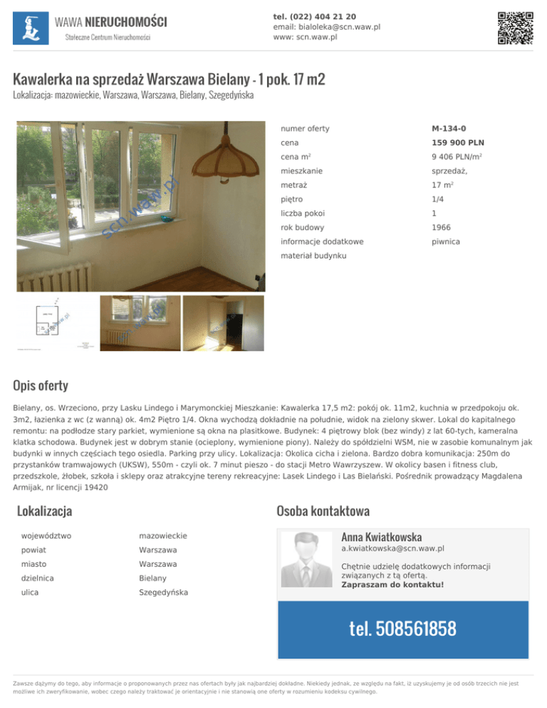 tel. (022) 404 21 20 email: [email protected] www: scn.waw.pl Kawalerka na sprzedaż Warszawa Bielany - 1 pok. 17 m2 Lokalizacja: mazowieckie, Warszawa, Warszawa, Bielany, Szegedyńska numer oferty M-134-0 cena 159 900 PLN cena m 9 406 PLN/m2 mieszkanie sprzedaż, metraż 17 m2 piętro 1/4 liczba pokoi 1 rok budowy 1966 informacje dodatkowe piwnica 2 materiał budynku Opis oferty Bielany, os. Wrzeciono, przy Lasku Lindego i Marymonckiej Mieszkanie: Kawalerka 17,5 m2: pokój ok. 11m2, kuchnia w przedpokoju ok. 3m2, łazienka z wc (z wanną) ok. 4m2 Piętro 1/4. Okna wychodzą dokładnie na południe, widok na zielony skwer. Lokal do kapitalnego remontu: na podłodze stary parkiet, wymienione są okna na plasitkowe. Budynek: 4 piętrowy blok (bez windy) z lat 60-tych, kameralna klatka schodowa. Budynek jest w dobrym stanie (ocieplony, wymienione piony). Należy do spółdzielni WSM, nie w zasobie komunalnym jak budynki w innych częściach tego osiedla. Parking przy ulicy. Lokalizacja: Okolica cicha i zielona. Bardzo dobra komunikacja: 250m do przystanków tramwajowych (UKSW), 550m - czyli ok. 7 minut pieszo - do stacji Metro Wawrzyszew. W okolicy basen i fitness club, przedszkole, żłobek, szkoła i sklepy oraz atrakcyjne tereny rekreacyjne: Lasek Lindego i Las Bielański. Pośrednik prowadzący Magdalena Armijak, nr licencji 19420 Lokalizacja Osoba kontaktowa Anna Kwiatkowska województwo mazowieckie powiat Warszawa [email protected] miasto Warszawa dzielnica Bielany ulica Szegedyńska Chętnie udzielę dodatkowych informacji związanych z tą ofertą. Zapraszam do kontaktu! tel. 508561858 Zawsze dążymy do tego, aby informacje o proponowanych przez nas ofertach były jak najbardziej dokładne. Niekiedy jednak, ze względu na fakt, iż uzyskujemy je od osób trzecich nie jest możliwe ich zweryfikowanie, wobec czego należy traktować je orientacyjnie i nie stanowią one oferty w rozumieniu kodeksu cywilnego.