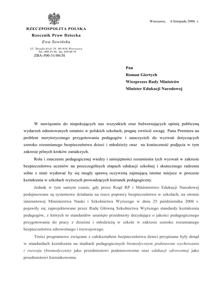 Warszawa, 6 listopada 2006 r. RZECZPOSPOLITA POLSKA Rzecznik Praw Dziecka Ewa Sowińska Ul. Śniadeckich 10, 00-656 Warszawa Tel.: 696 55 44, fax. 629 60 79 ZBA-500-31/06/JS Pan Roman Giertych Wiceprezes Rady Ministrów Minister Edukacji Narodowej W nawiązaniu do niepokojących nas wszystkich oraz bulwersujących opinię publiczną wydarzeń odnotowanych ostatnio w polskich szkołach, pragnę zwrócić uwagę Pana Premiera na problem merytorycznego przygotowania pedagogów i nauczycieli do wyzwań dotyczących szeroko rozumianego bezpieczeństwa dzieci i młodzieŜy oraz na konieczność podjęcia w tym zakresie pilnych kroków zaradczych. Rola i znaczenie pedagogicznej wiedzy i umiejętności rozumienia tych wyzwań w zakresie bezpieczeństwa uczniów na poszczególnych etapach edukacji szkolnej i skutecznego radzenia sobie z nimi wydawać by się mogły sprawą oczywistą zajmującą istotne miejsce w procesie kształcenia w szkołach wyŜszych prowadzących kierunek pedagogiczny. Jednak w tym samym czasie, gdy przez Rząd RP i Ministerstwo Edukacji Narodowej podejmowane są systemowe działania na rzecz poprawy bezpieczeństwa w szkołach, na stronie internetowej Ministerstwa Nauki i Szkolnictwa WyŜszego w dniu 25 października 2006 r. pojawiły się zaprojektowane przez Radę Główną Szkolnictwa WyŜszego standardy kształcenia pedagogów, z których to standardów usunięto przedmioty decydujące o jakości pedagogicznego przygotowania do pracy z dziećmi i młodzieŜą w szkole w zakresie szeroko rozumianego bezpieczeństwa zdrowotnego i rozwojowego. Treści programowe związane z całokształtem bezpieczeństwa dzieci przypisane były dotąd w standardach kształcenia na studiach pedagogicznych biomedycznym podstawom wychowania i rozwoju (biomedycynie) jako przedmiotowi podstawowemu oraz edukacji zdrowotnej jako przedmiotowi kierunkowemu. Jako Rzecznik Praw Dziecka wiem, Ŝe interdyscyplinarne środowiska naukowe zaangaŜowane w badania, prowadzące zajęcia ze studentami pedagogiki, opracowujące podręczniki akademickie, mają świadomość narastających problemów psychomedycznych wśród dzieci i młodzieŜy i doceniają ogromną rolę pedagogów jako współpartnerów w obszarze zdrowia publicznego niezbędnych w prowadzeniu profilaktyki pierwotnej adresowanej do populacji dzieci i młodzieŜy, a takŜe w wypełnianiu zadań w zakresie profilaktyki wtórnej związanej z wczesnym wykrywaniem zagroŜeń i zaburzeń zdrowia i rozwoju oraz w zakresie profilaktyki trzeciorzędowej mającej na celu ograniczanie zdrowotnych następstw chorób i zaburzeń w stanie zdrowia uczniów. TakŜe w biurze Rzecznika Praw Dziecka opracowane zostały analizy badawcze oparte na danych Głównego Urzędu Statystycznego(GUS), instytutów naukowych i organizacji międzynarodowych. Wyniki tych badań napawają troską co do stanu zdrowia dzieci i młodzieŜy we wszystkich jego wymiarach – somatycznym, psychicznym, duchowym i społecznym. Niepokój ten narasta w związku z docierającymi ostatnio do opinii publicznej zjawiskami dziejącymi się w naszych szkołach. Wg danych GUS długotrwałe problemy zdrowotne ma 16,9% spośród 2045,5 tys. dzieci w wieku 5-9 lat; 18,3% spośród 2537,3 tys. dzieci w wieku 10-14 lat; oraz 14,8% spośród 2980,5 tys. młodzieŜy w wieku 15-19lat, co łącznie daje liczbę 1250,0tys. dzieci w wieku 5 – 19 lat. Wg tych samych wyników badań GUS na choroby przewlekłe cierpi w analogicznych przedziałach wiekowych 24,3%, 25,0% oraz 20,6% dzieci i młodzieŜy, co łącznie daje liczbę 1750 tys. przewlekle chorych w wieku 5 – 19 lat. Zdecydowana większość dzieci z długotrwałymi problemami zdrowotnymi oraz dzieci przewlekle chorych uczęszcza do publicznych przedszkoli i szkół, gdzie powinna zetknąć się z nauczycielami przygotowanymi do rozumienia i odpowiedniego radzenia sobie z codziennymi problemami tych dzieci w procesie kształcenia, wychowania i w wymiarze profilaktyki. Równie waŜne są umiejętności pedagogów i nauczycieli w profilaktyce urazów na terenie szkół i w niesieniu pierwszej pomocy przedmedycznej. Dane uzyskane w ramach międzynarodowych badań zachowań zdrowotnych uczniów (HBSC) z 2002 roku wskazują, Ŝe 28% uczniów w wieku 11, 13 i 15 lat co najmniej 1 raz w ciągu ostatnich 12. miesięcy korzystało z pomocy medycznej z powodu wypadków. Spośród uczniów, którzy doznali urazu 49% uczniów doznała go podczas wykonywania ćwiczeń sportowych, 17% gdy chodzili lub biegali, ale nie było to związane z ćwiczeniami fizycznymi, a 12% w czasie jazdy na rowerze. Najczęstszym miejscem wypadku uczniów była szkoła/boisko szkolne - 35%. Wyniki badań HBSC wykazują takŜe, iŜ 30,3% uczniów w wieku 11–15 lat w Polsce było ofiarami dręczenia przez innych uczniów w szkole, w tym 10,3% często, to znaczy co najmniej 2-3 razy w miesiącu. Wiek dorastania jest okresem realizacji zachowań, czasami ryzykownych. Utrwalone w tym okresie rozwoju postawy i zachowania mogą wywrzeć wpływ na całe przyszłe Ŝycie. Wyniki badań HBSC wskazują, Ŝe w ciągu ostatnich 12 miesięcy w bójkach brało udział 38,9% uczniów w wieku 11–15 lat. Szczególnie niepokojące jest częstsze podejmowanie przez polską młodzieŜ bójek z nieznajomymi. Z tych samych badan wynika, Ŝe 37,0% uczniów było sprawcami dręczenia innych uczniów w szkole, w tym 12,0% często. Łącząc dane na temat uczestników bójek i sprawców dręczenia stwierdzono, Ŝe w Polsce co najmniej jedno z tych dwóch agresywnych zachowań dotyczyło 54,3% uczniów, w tym u 21,7% występowały oba te zachowania. Są w Polsce klasy i szkoły, gdzie nasilenie przemocy jest minimalne oraz klasy i szkoły, gdzie zjawisko to znaczne przekracza wskaźniki ogólnopolskie. Problemy zdrowia psychicznego w okresie dorastania przejawiają się nie tylko w formie agresji i przemocy wobec innych osób ale takŜe są przyczyną agresji wobec samego siebie. W Polsce samobójstw