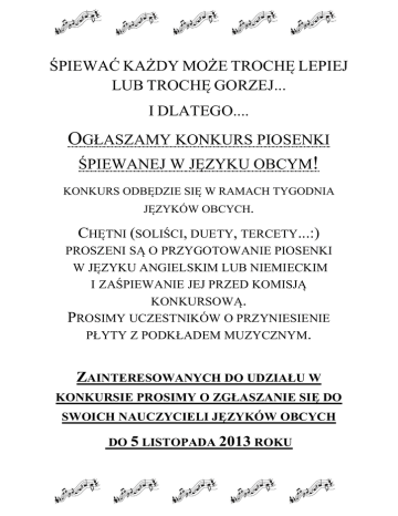 ŚPIEWAĆ KAŻDY MOŻE TROCHĘ LEPIEJ LUB TROCHĘ GORZEJ... I DLATEGO.... OGŁASZAMY KONKURS PIOSENKI ŚPIEWANEJ W JĘZYKU OBCYM! KONKURS ODBĘDZIE SIĘ W RAMACH TYGODNIA JĘZYKÓW OBCYCH. CHĘTNI (SOLIŚCI, DUETY, TERCETY...:) PROSZENI SĄ O PRZYGOTOWANIE PIOSENKI W JĘZYKU ANGIELSKIM LUB NIEMIECKIM I ZAŚPIEWANIE JEJ PRZED KOMISJĄ KONKURSOWĄ. PROSIMY UCZESTNIKÓW O PRZYNIESIENIE PŁYTY Z PODKŁADEM MUZYCZNYM. ZAINTERESOWANYCH DO UDZIAŁU W KONKURSIE PROSIMY O ZGŁASZANIE SIĘ DO SWOICH NAUCZYCIELI JĘZYKÓW OBCYCH DO 5 LISTOPADA 2013 ROKU