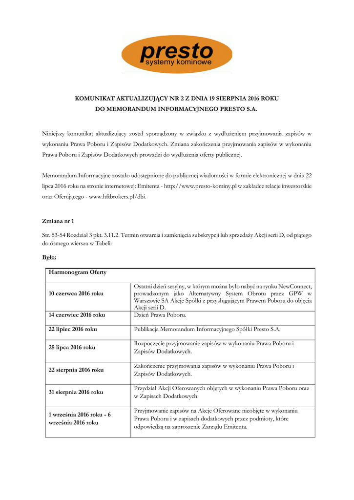 KOMUNIKAT AKTUALIZUJĄCY NR 2 Z DNIA 19 SIERPNIA 2016 ROKU DO MEMORANDUM INFORMACYJNEGO PRESTO S.A. Niniejszy komunikat aktualizujący został sporządzony w związku z wydłużeniem przyjmowania zapisów w wykonaniu Prawa Poboru i Zapisów Dodatkowych. Zmiana zakończenia przyjmowania zapisów w wykonaniu Prawa Poboru i Zapisów Dodatkowych prowadzi do wydłużenia oferty publicznej. Memorandum Informacyjne zostało udostępnione do publicznej wiadomości w formie elektronicznej w dniu 22 lipca 2016 roku na stronie internetowej: Emitenta - http://www.presto-kominy.pl w zakładce relacje inwestorskie oraz Oferującego - www.hftbrokers.pl/dbi. Zmiana nr 1 Str. 53-54 Rozdział 3 pkt. 3.11.2. Termin otwarcia i zamknięcia subskrypcji lub sprzedaży Akcji serii D, od piątego do ósmego wiersza w Tabeli: Było: Harmonogram Oferty 14 czerwiec 2016 roku Ostatni dzień sesyjny, w którym można było nabyć na rynku NewConnect, prowadzonym jako Alternatywny System Obrotu przez GPW w Warszawie SA Akcje Spółki z przysługującym Prawem Poboru do objęcia Akcji serii D. Dzień Prawa Poboru. 22 lipiec 2016 roku Publikacja Memorandum Informacyjnego Spółki Presto S.A. 25 lipca 2016 roku Rozpoczęcie przyjmowanie zapisów w wykonaniu Prawa Poboru i Zapisów Dodatkowych. 22 sierpnia 2016 roku Zakończenie przyjmowania zapisów w wykonaniu Prawa Poboru i Zapisów Dodatkowych. 31 sierpnia 2016 roku Przydział Akcji Oferowanych objętych w wykonaniu Prawa Poboru oraz w Zapisach Dodatkowych. 1 września 2016 roku - 6 września 2016 roku Przyjmowanie zapisów na Akcje Oferowane nieobjęte w wykonaniu Prawa Poboru i w zapisach dodatkowych przez podmioty, które odpowiedzą na zaproszenie Zarządu Emitenta. 10 czerwca 2016 roku Harmonogram Oferty 7 września 2016 roku Przydział akcji podmiotom, które odpowiedzą na zaproszenie Zarządu Emitenta. Jest: Harmonogram Oferty 14 czerwiec 2016 roku Ostatni dzień sesyjny, w którym można było nabyć na rynku NewConnect, prowadzonym jako Alternatywny System Obrotu przez GPW w Warszawie SA Akcje Spółki z przysługującym Prawem Poboru do objęcia Akcji serii D. Dzień Prawa Poboru. 22 lipiec 2016 roku Publikacja Memorandum Informacyjnego Spółki Presto S.A. 25 lipca 2016 roku Rozpoczęcie przyjmowanie zapisów w wykonaniu Prawa Poboru i Zapisów Dodatkowych. 9 września 2016 roku Zakończenie przyjmowania zapisów w wykonaniu Prawa Poboru i Zapisów Dodatkowych. 20 września 2016 roku Przydział Akcji Oferowanych objętych w wykonaniu Prawa Poboru oraz w Zapisach Dodatkowych. 21 września 2016 roku - 26 września 2016 roku Przyjmowanie zapisów na Akcje Oferowane nieobjęte w wykonaniu Prawa Poboru i w zapisach dodatkowych przez podmioty, które odpowiedzą na zaproszenie Zarządu Emitenta. 27 września 2016 roku Przydział akcji podmiotom, które odpowiedzą na zaproszenie Zarządu Emitenta. 10 czerwca 2016 roku Zmiana nr 2 Str. 54 Rozdział 3 pkt. 3.11.3. Wskazanie zasad, miejsc i terminów składania zapisów na Akcje serii D Było: Zapisy na akcje serii D będą przyjmowane w terminach od 25 lipca 2016 roku do 22 sierpnia 2016 roku. Jest: Zapisy na akcje serii D będą przyjmowane w terminach od 25 lipca 2016 roku do 9 września 2016 roku.