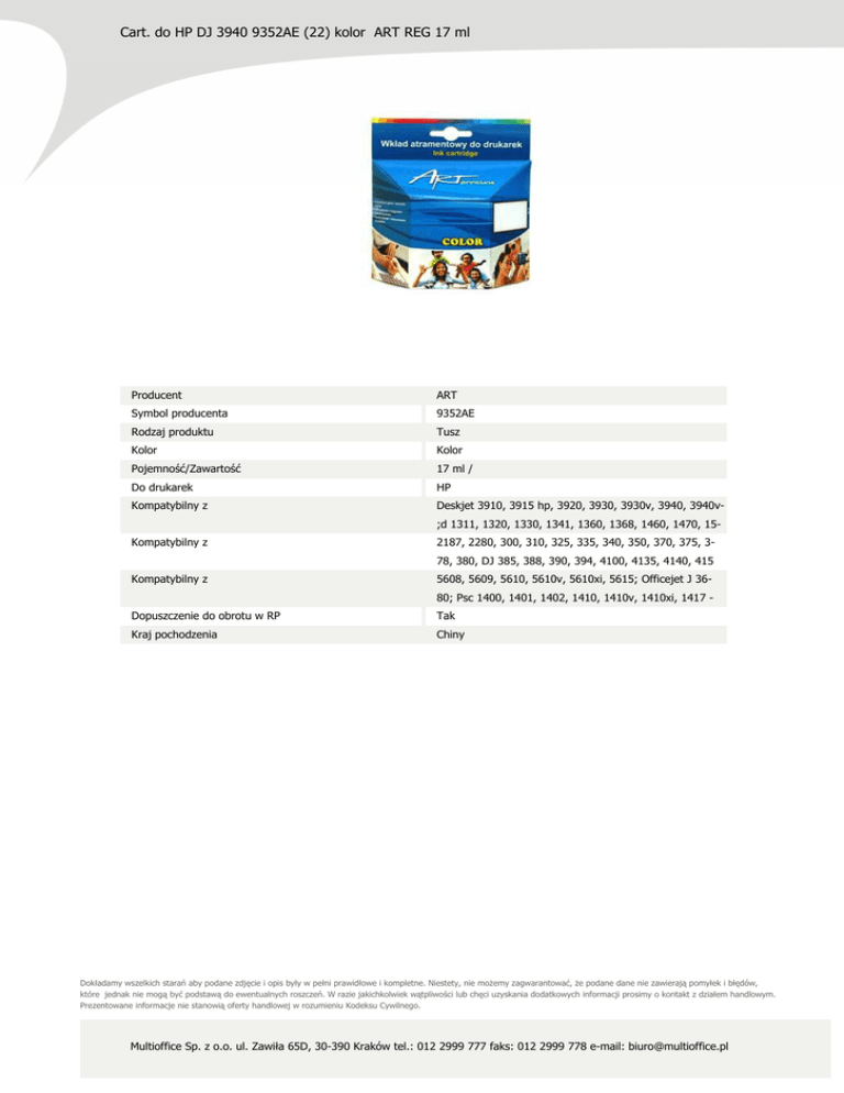 Cart. do HP DJ 3940 9352AE (22) kolor ART REG 17 ml Producent ART Symbol producenta 9352AE Rodzaj produktu Tusz Kolor Kolor Pojemność/Zawartość 17 ml / Do drukarek HP Kompatybilny z Deskjet 3910, 3915 hp, 3920, 3930, 3930v, 3940, 3940v;d 1311, 1320, 1330, 1341, 1360, 1368, 1460, 1470, 15- Kompatybilny z 2187, 2280, 300, 310, 325, 335, 340, 350, 370, 375, 378, 380, DJ 385, 388, 390, 394, 4100, 4135, 4140, 415 Kompatybilny z 5608, 5609, 5610, 5610v, 5610xi, 5615; Officejet J 3680; Psc 1400, 1401, 1402, 1410, 1410v, 1410xi, 1417 - Dopuszczenie do obrotu w RP Tak Kraj pochodzenia Chiny Dokładamy wszelkich starań aby podane zdjęcie i opis były w pełni prawidłowe i kompletne. Niestety, nie możemy zagwarantować, że podane dane nie zawierają pomyłek i błędów, które jednak nie mogą być podstawą do ewentualnych roszczeń. W razie jakichkolwiek wątpliwości lub chęci uzyskania dodatkowych informacji prosimy o kontakt z działem handlowym. Prezentowane informacje nie stanowią oferty handlowej w rozumieniu Kodeksu Cywilnego. Multioffice Sp. z o.o. ul. Zawiła 65D, 30-390 Kraków tel.: 012 2999 777 faks: 012 2999 778 e-mail: [email protected]