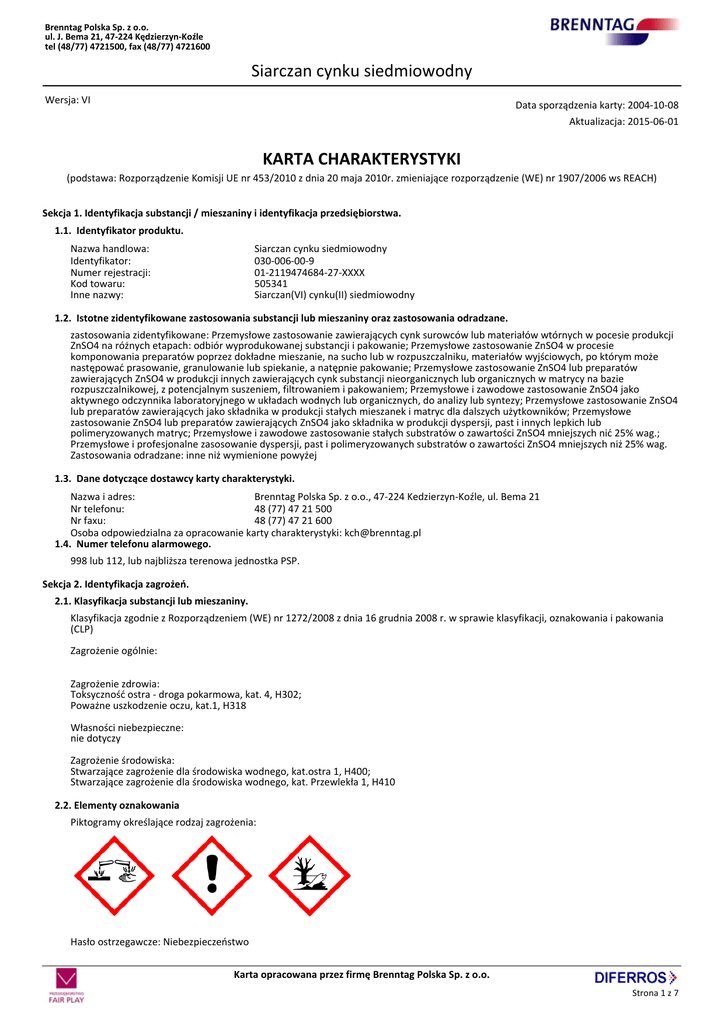 Brenntag Polska Sp. z o.o. ul. J. Bema 21, 47-224 Kędzierzyn-Koźle tel (48/77) 4721500, fax (48/77) 4721600 Siarczan cynku siedmiowodny Wersja: VI Data sporządzenia karty: 2004-10-08 Aktualizacja: 2015-06-01 KARTA CHARAKTERYSTYKI (podstawa: Rozporządzenie Komisji UE nr 453/2010 z dnia 20 maja 2010r. zmieniające rozporządzenie (WE) nr 1907/2006 ws REACH) Sekcja 1. Identyfikacja substancji / mieszaniny i identyfikacja przedsiębiorstwa. 1.1. Identyfikator produktu. Nazwa handlowa: Identyfikator: Numer rejestracji: Kod towaru: Inne nazwy: Siarczan cynku siedmiowodny 030-006-00-9 01-2119474684-27-XXXX 505341 Siarczan(VI) cynku(II) siedmiowodny 1.2. Istotne zidentyfikowane zastosowania substancji lub mieszaniny oraz zastosowania odradzane. zastosowania zidentyfikowane: Przemysłowe zastosowanie zawierających cynk surowców lub materiałów wtórnych w pocesie produkcji ZnSO4 na różnych etapach: odbiór wyprodukowanej substancji i pakowanie; Przemysłowe zastosowanie ZnSO4 w procesie komponowania preparatów poprzez dokładne mieszanie, na sucho lub w rozpuszczalniku, materiałów wyjściowych, po którym może następować prasowanie, granulowanie lub spiekanie, a natępnie pakowanie; Przemysłowe zastosowanie ZnSO4 lub preparatów zawierających ZnSO4 w produkcji innych zawierających cynk substancji nieorganicznych lub organicznych w matrycy na bazie rozpuszczalnikowej, z potencjalnym suszeniem, filtrowaniem i pakowaniem; Przemysłowe i zawodowe zastosowanie ZnSO4 jako aktywnego odczynnika laboratoryjnego w układach wodnych lub organicznych, do analizy lub syntezy; Przemysłowe zastosowanie ZnSO4 lub preparatów zawierających jako składnika w produkcji stałych mieszanek i matryc dla dalszych użytkowników; Przemysłowe zastosowanie ZnSO4 lub preparatów zawierających ZnSO4 jako składnika w produkcji dyspersji, past i innych lepkich lub polimeryzowanych matryc; Przemysłowe i zawodowe zastosowanie stałych substratów o zawartości ZnSO4 mniejszych nić 25% wag.; Przemysłowe i profesjonalne zasosowanie dyspersji, past i polimeryzowanych substratów o zawartości ZnSO4 mniejszych niż 25% wag. Zastosowania odradzane: inne niż wymienione powyżej 1.3. Dane dotyczące dostawcy karty charakterystyki. Nazwa i adres: Brenntag Polska Sp. z o.o., 47-224 Kedzierzyn-Koźle, ul. Bema 21 Nr telefonu: 48 (77) 47 21 500 Nr faxu: 48 (77) 47 21 600 Osoba odpowiedzialna za opracowanie karty charakterystyki: [email protected] 1.4. Numer telefonu alarmowego. 998 lub 112, lub najbliższa terenowa jednostka PSP. Sekcja 2. Identyfikacja zagrożeń. 2.1. Klasyfikacja substancji lub mieszaniny. Klasyfikacja zgodnie z Rozporządzeniem (WE) nr 1272/2008 z dnia 16 grudnia 2008 r. w sprawie klasyfikacji, oznakowania i pakowania (CLP) Zagrożenie ogólnie: Zagrożenie zdrowia: Toksyczność ostra - droga pokarmowa, kat. 4, H302; Poważne uszkodzenie oczu, kat.1, H318 Własności niebezpieczne: nie dotyczy Zagrożenie środowiska: Stwarzające zagrożenie dla środowiska wodnego, kat.ostra 1, H400; Stwarzające zagrożenie dla środowiska wodnego, kat. Przewlekła 1, H410 2.2. Elementy oznakowania Piktogramy określające rodzaj zagrożenia: Hasło ostrzegawcze: Niebezpieczeństwo Karta opracowana przez firmę Brenntag Polska Sp. z o.o. Strona 1 z 7 Brenntag Polska Sp. z o.o. ul. J. Bema 21, 47-224 Kędzierzyn-Koźle tel (48/77) 4721500, fax (48/77) 4721600 Siarczan cynku siedmiowodny Zwroty wskazujące rodzaj zagrożenia: H302 - Działa szkodliwie po połknięciu H318 - Powoduje poważne uszkodzenie oczu H410 - Działa bardzo toksycznie na organizmy wodne, powodując długotrwałe skutki Zwroty określające warunki bezpiecznego stosowania: P301+P312 - W przypadku połknięcia: W przypadku złego samopoczucia skontaktować się z Ośrodkiem Zatruć lub z lekarzem. P280 - Stosować rękawice ochronne/odzież ochronną/ochronę oczu/ochronę twarzy. P273 - Unikać uwolnienia do środowiska. P305+P351+P338 - W przypadku dostania się do oczu: Ostrożnie płukać wodą przez kilka minut.Wyjąć soczewki kontaktowe, jeżeli są i można je łatwo usunąć. nadal płukać. P501 - Zawartość/pojemnik usuwać do upoważnionego odbiorcy odpadów 2.3. Inne zagrożenia. brak dostępnych danych Sekcja 3. Skład / informacja o składnikach. Skład wg Rozporządzenia 1272/2008. Siarczan(VI) cynku(II) 100% Nr CAS: 7446-19-7 Nr indeksowy: 030-006-00-9 Nr WE: 231-793-3 Sekcja 4. Środki pierwszej pomocy. 4.1. Opis środków pierwszej pomocy. Wdychanie: W razie narazenia inhalacyjnego wyprowadzić lub wynieść poszkodowanego z miejsca narażenia. Zapewnić spokój. W razie trudności w oddychaniu podawać tlen. Chronić poszkodowanego przed utratą ciepła. Wezwać lekarza. Kontakt ze skórą: W razie zanieczyszczenia skóry/odzieży zdjąć skażoną odzież, zmyć skórę dużą ilością letniej wody z mydłem. W przypadku gdy podrażnienie skóry nie mija, skonsultować się z lekarzem dermatologiem Kontakt z oczami: W razie zanieczyszczenia oczu płukać przez co najmniej 15 minut dużą ilością chłodnej wody, najlepiej bieżącej (unikać silnego strumienia wody ze względu na ryzyko mechanicznego uszkodzenia rogówki). Uwaga: osoby narażone na skażenie oczu powinny być pouczone o konieczności i sposobie ich natychmiastowego płukania. Natychmiast wezwać lekarza. Spożycie: W przypadku połknięcia natychmiast wezwać lekarza. Podać wodę do picia. 4.2. Najważniejsze ostre i opóźnione objawy oraz skutki narażenia. W postaci pyłu wywołuje łzawienie i ból oczu, uczucie pieczenia spojówek, zaburzenia widzenia, uczucie drapania w gardle, kaszel, duszność, metaliczny smak w ustach. Skażenie oczu roztworem powoduje łzawienie, ból oczu, uczucie pieczenia spojówek, może wystąpić oparzenie chemiczne z uszkodzeniem rogówki. Skażenie skóry powoduje jej zaczerwienienie i oparzenie chemiczne. Wchłonięcie przez oparzoną skórę może wywołać hemolizę krwinek. Drogą pokarmową wywołuje nud