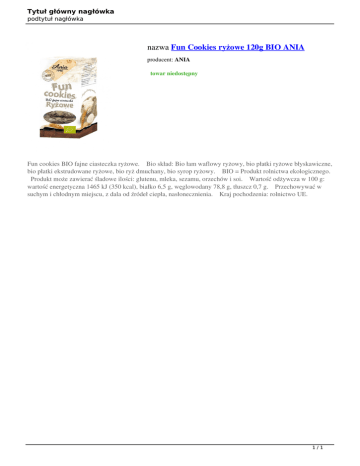 Tytuł główny nagłówka podtytuł nagłówka nazwa Fun Cookies ryżowe 120g BIO ANIA producent: ANIA towar niedostępny Fun cookies BIO fajne ciasteczka ryżowe. Bio skład: Bio łam waflowy ryżowy, bio płatki ryżowe błyskawiczne, bio płatki ekstrudowane ryżowe, bio ryż dmuchany, bio syrop ryżowy. BIO = Produkt rolnictwa ekologicznego. Produkt może zawierać śladowe ilości: glutenu, mleka, sezamu, orzechów i soi. Wartość odżywcza w 100 g: wartość energetyczna 1465 kJ (350 kcal), białko 6,5 g, węglowodany 78,8 g, tłuszcz 0,7 g. Przechowywać w suchym i chłodnym miejscu, z dala od źródeł ciepła, nasłonecznienia. Kraj pochodzenia: rolnictwo UE. 1/1