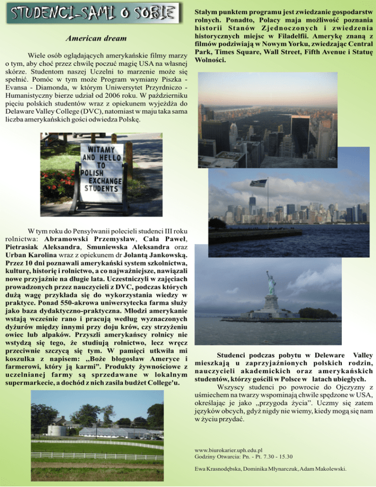 Sta³ym punktem programu jest zwiedzanie gospodarstw rolnych. Ponadto, Polacy maja mo¿liwoœæ poznania historii Stanów Zjednoczonych i zwiedzenia historycznych miejsc w Filadelfii. Amerykê znan¹ z American dream filmów podziwiaj¹ w Nowym Yorku, zwiedzaj¹c Central Park, Times Square, Wall Street, Fifth Avenue i Statuê Wiele osób ogl¹daj¹cych amerykañskie filmy marzy Wolnoœci. o tym, aby choæ przez chwilê poczuæ magiê USA na w³asnej skórze. Studentom naszej Uczelni to marzenie mo¿e siê spe³niæ. Pomóc w tym mo¿e Program wymiany Piszka Evansa - Diamonda, w którym Uniwersytet Przyrdniczo Humanistyczny bierze udzia³ od 2006 roku. W paŸdzierniku piêciu polskich studentów wraz z opiekunem wyje¿d¿a do Delaware Valley College (DVC), natomiast w maju taka sama liczba amerykañskich goœci odwiedza Polskê. W tym roku do Pensylwanii polecieli studenci III roku rolnictwa: Abramowski Przemys³aw, Ca³a Pawe³, Pietrasiak Aleksandra, Smuniewska Aleksandra oraz Urban Karolina wraz z opiekunem dr Jolant¹ Jankowsk¹. Przez 10 dni poznawali amerykañski system szkolnictwa, kulturê, historiê i rolnictwo, a co najwa¿niejsze, nawi¹zali nowe przyjaŸnie na d³ugie lata. Uczestniczyli w zajêciach prowadzonych przez nauczycieli z DVC, podczas których du¿¹ wagê przyk³ada siê do wykorzystania wiedzy w praktyce. Ponad 550-akrowa uniwersytecka farma s³u¿y jako baza dydaktyczno-praktyczna. M³odzi amerykanie wstaj¹ wczeœnie rano i pracuj¹ wed³ug wyznaczonych dy¿urów miêdzy innymi przy doju krów, czy strzy¿eniu owiec lub alpaków. Przyszli amerykañscy rolnicy nie wstydz¹ siê tego, ¿e studiuj¹ rolnictwo, lecz wrêcz przeciwnie szczyc¹ siê tym. W pamiêci utkwi³a mi Studenci podczas pobytu w Deleware Valley koszulka z napisem: ,,Bo¿e b³ogos³aw Ameryce i mieszkaj¹ u zaprzyjaŸnionych polskich rodzin, farmerowi, który j¹ karmi”. Produkty ¿ywnoœciowe z nauczycieli akademickich oraz amerykañskich uczelnianej farmy s¹ sprzedawane w lokalnym studentów, którzy goœcili w Polsce w latach ubieg³ych. supermarkecie, a dochód z nich zasila bud¿et College'u. Wszyscy studenci po powrocie do Ojczyzny z uœmiechem na twarzy wspominaj¹ chwile spêdzone w USA, okreœlaj¹c je jako ,,przygoda ¿ycia”. Uczmy siê zatem jêzyków obcych, gdy¿ nigdy nie wiemy, kiedy mog¹ siê nam w ¿yciu przydaæ. www.biurokarier.uph.edu.pl Godziny Otwarcia: Pn. - Pt. 7.30 - 15.30 Ewa Krasnodêbska, Dominika M³ynarczuk, Adam Makolewski.